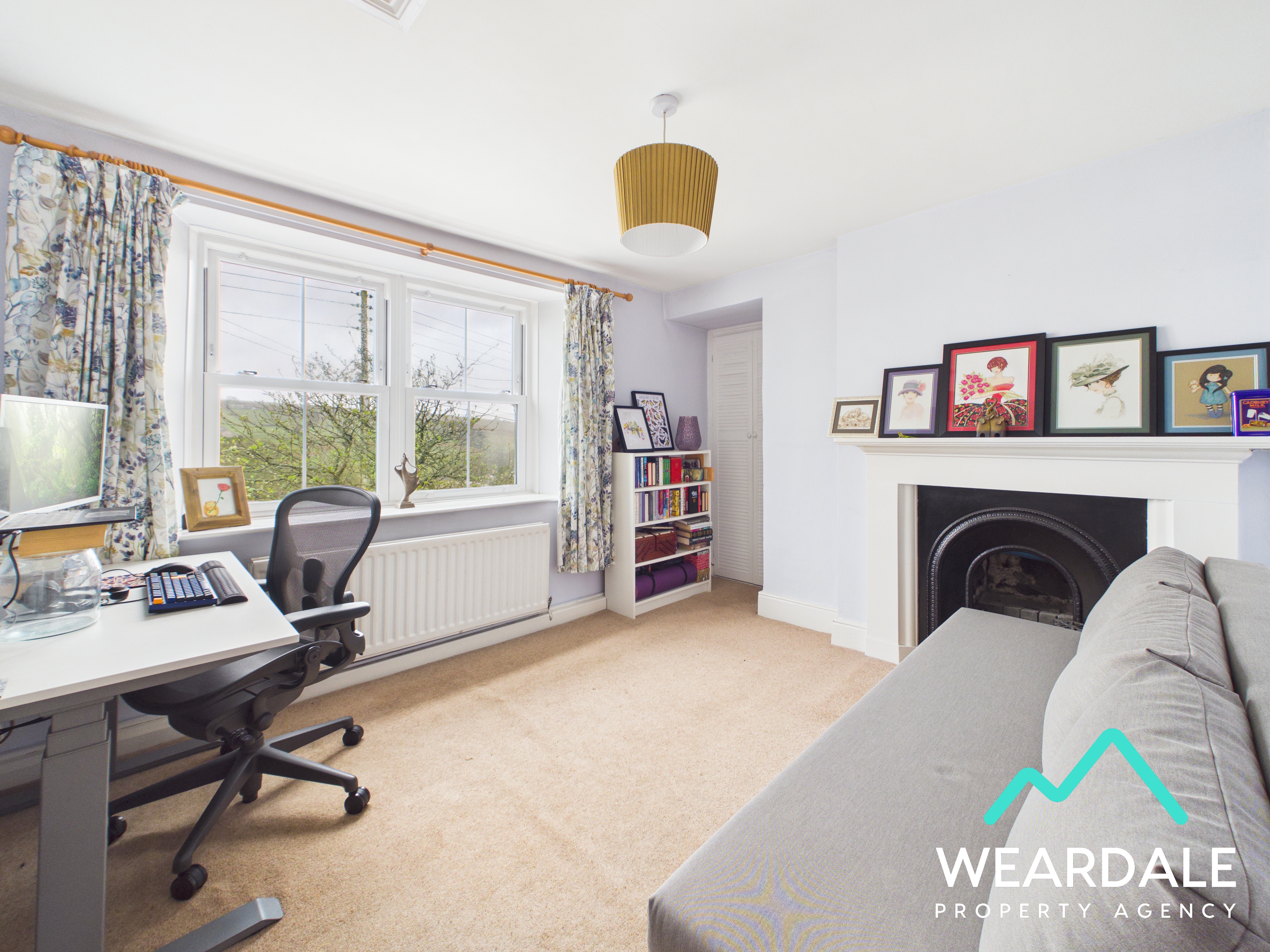 - Positioned to the middle of the property and accessed from the landing - Well-proportioned double room - Double-glazed uPVC sash window with deep wooden sill to the Western aspect, looking over the front of the property and providing beautiful views of the surrounding hillsides - Carpeted - Neutrally decorated - Traditional cast-iron fire with wooden surround and mantle - Ceiling light fitting - Radiator - Access hatch to the property’s roof space, which is fully boarded - Ample space for free-standing storage furniture