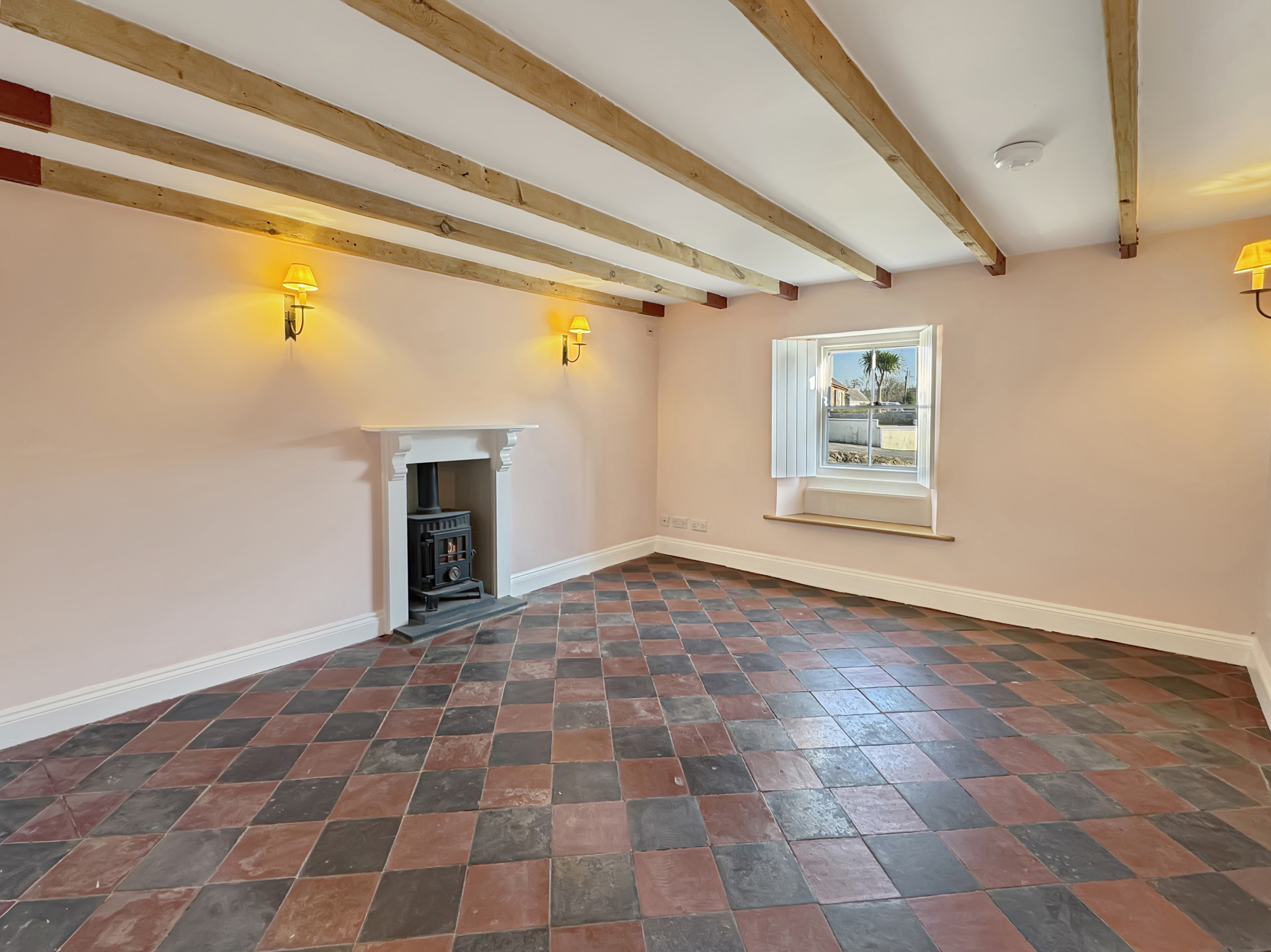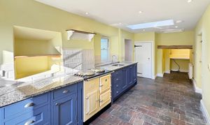 The ground floor offers a wonderful range of living spaces, ideal for both everyday living and entertaining. There is a beautifully atmospheric sitting room with flagstone flooring and stove, a further generous reception room with striking quarry tiled floor and exposed beams, and a large dining room that connects well with the rest of the house. The kitchen is particularly impressive in scale, fitted with traditional-style cabinetry, granite worktops and an Aga-style cooker, with ample room for busy family life. The main living and sun room room to the rear enjoys lovely natural light and provides an inviting link to the outside space. Ancillary areas including a pantry, hallways and modern ground floor bathroom/shower facilities add to the home’s practicality.