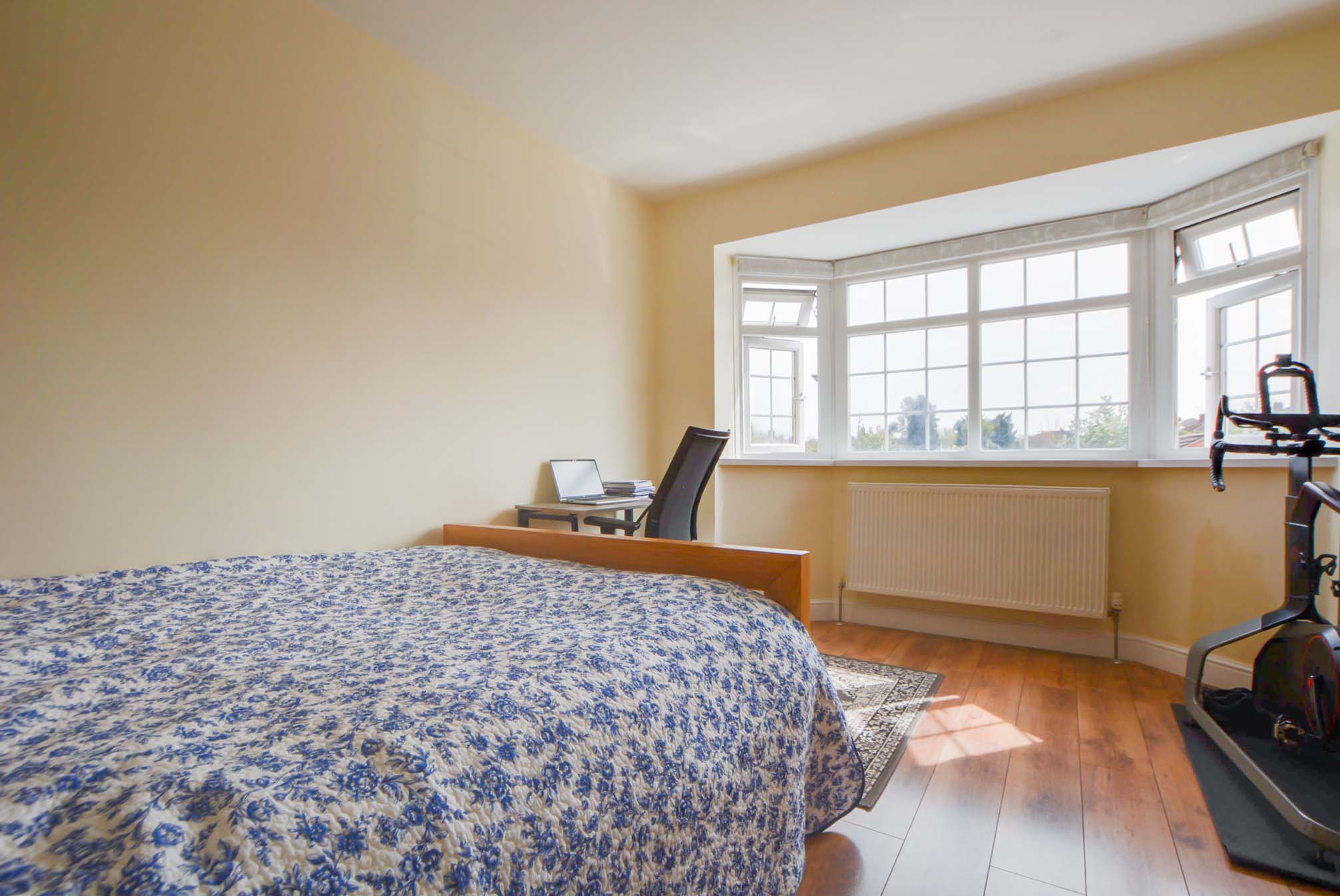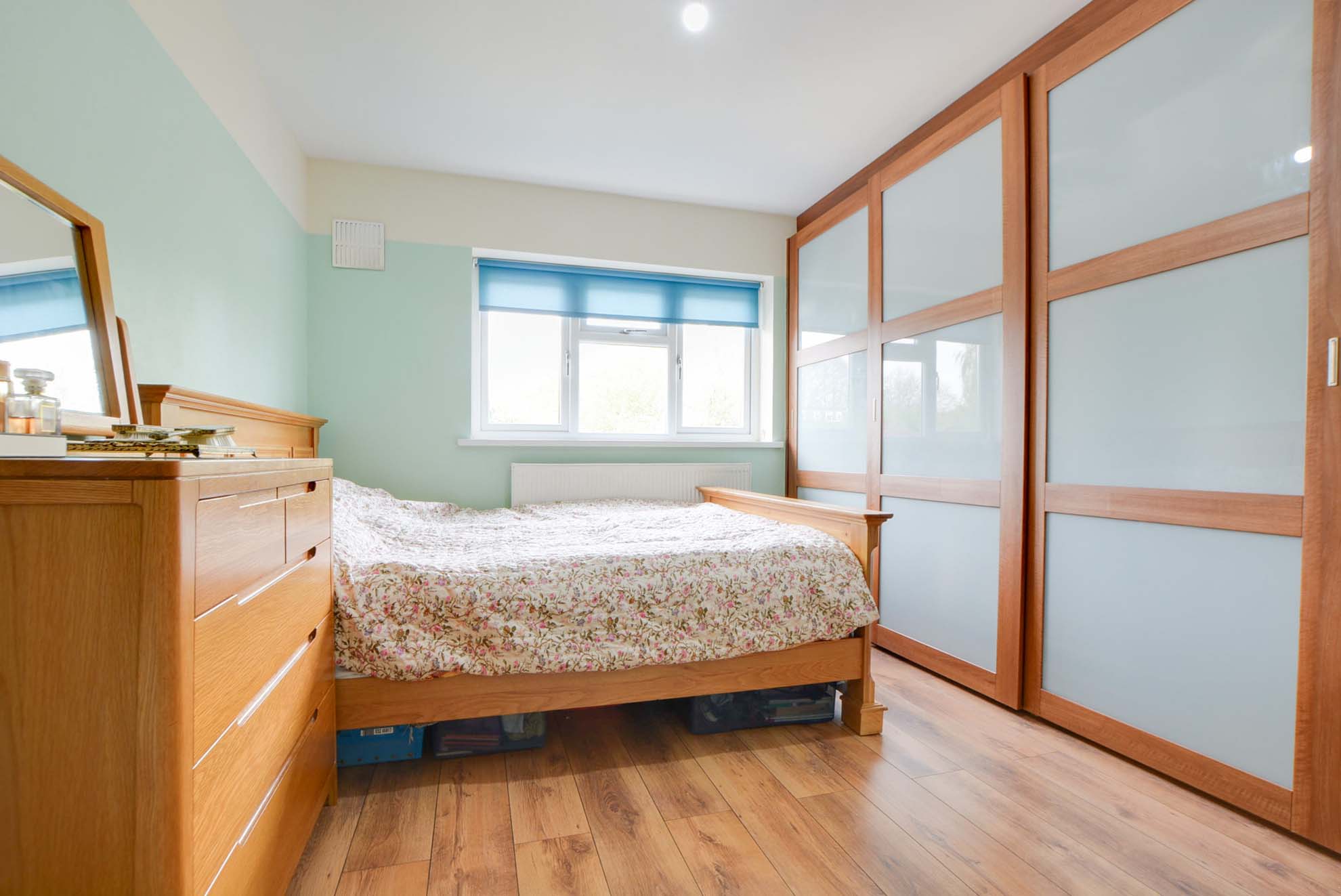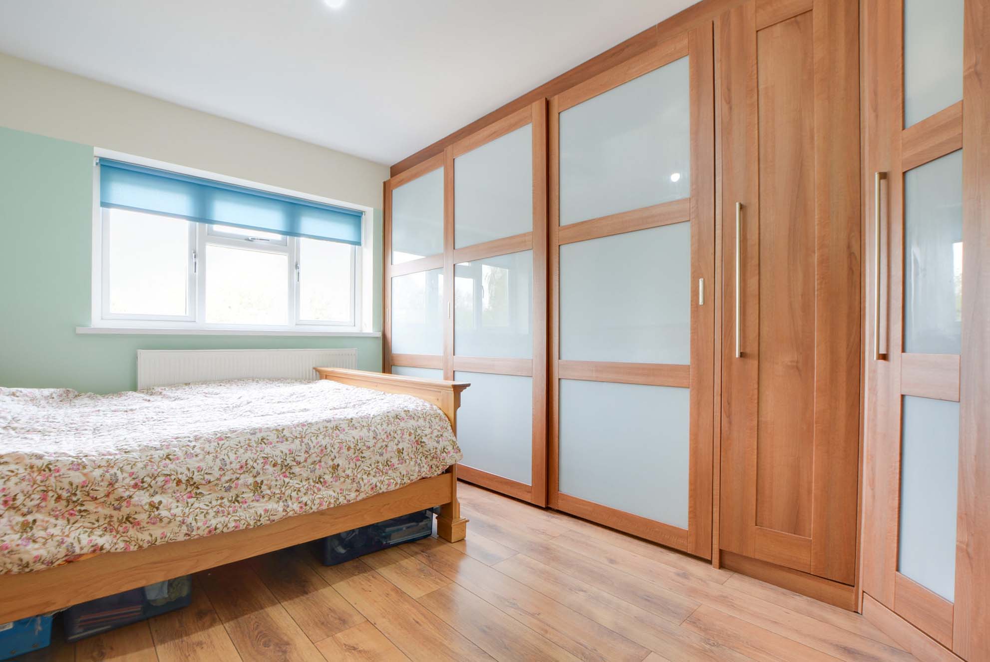 Features rear-facing windows, built-in wardrobes, wood effect flooring, and a radiator.