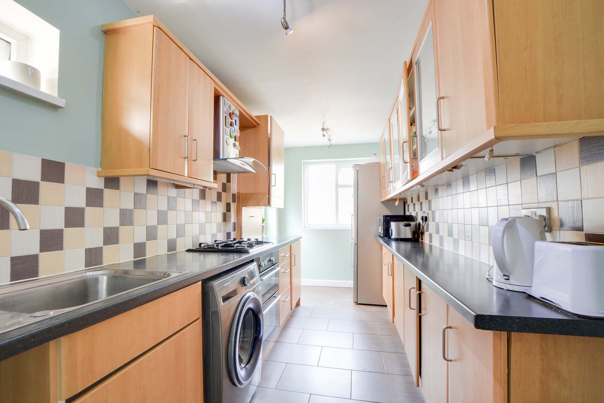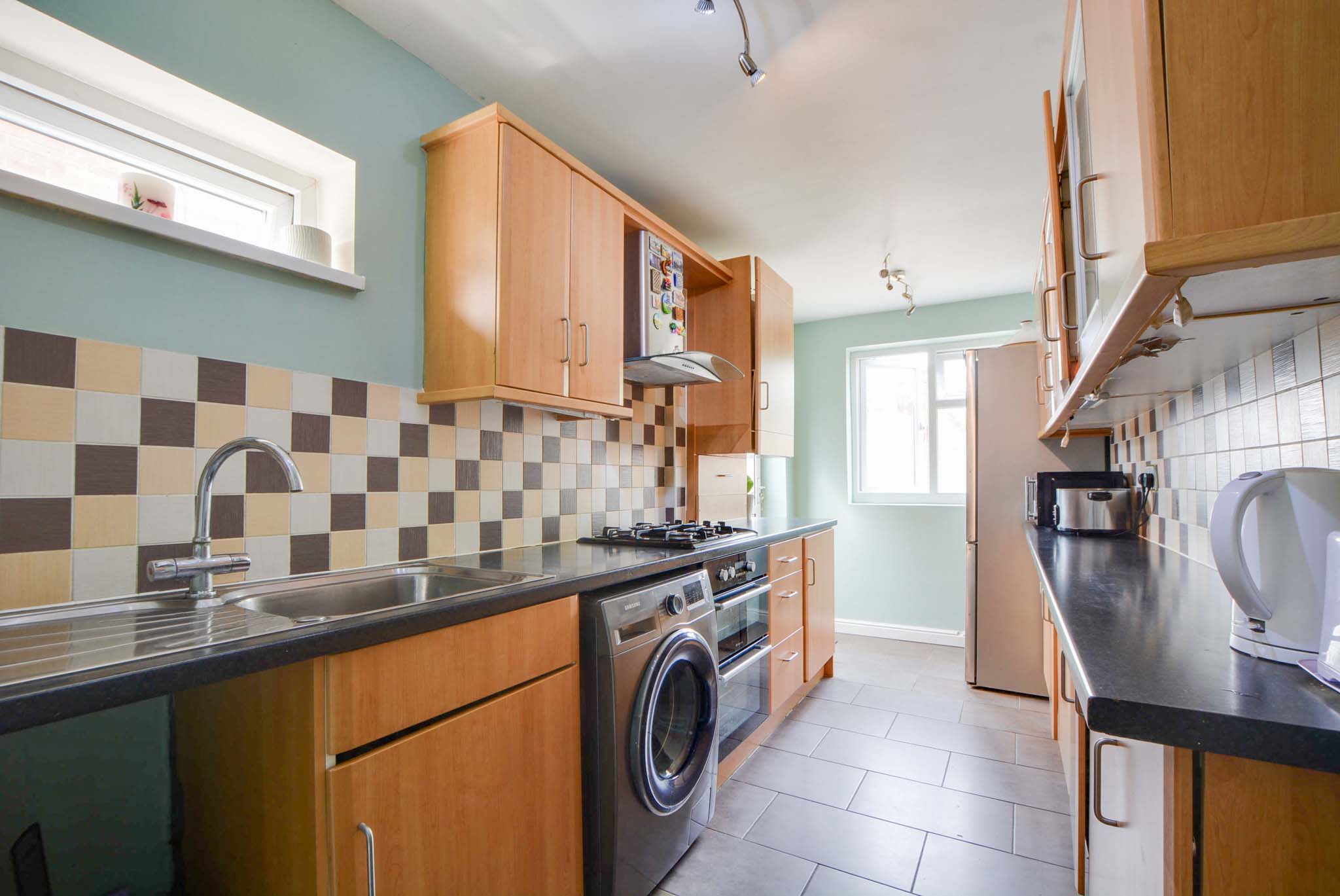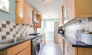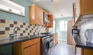 Includes windows to the side and rear, a door to the garden, ceramic tile flooring, and a range of base/wall units with laminate worktops. Appliances: Integrated 4-ring gas hob, double oven, and extraction hood; plumbing for washing machine and space for a free-standing fridge-freezer.