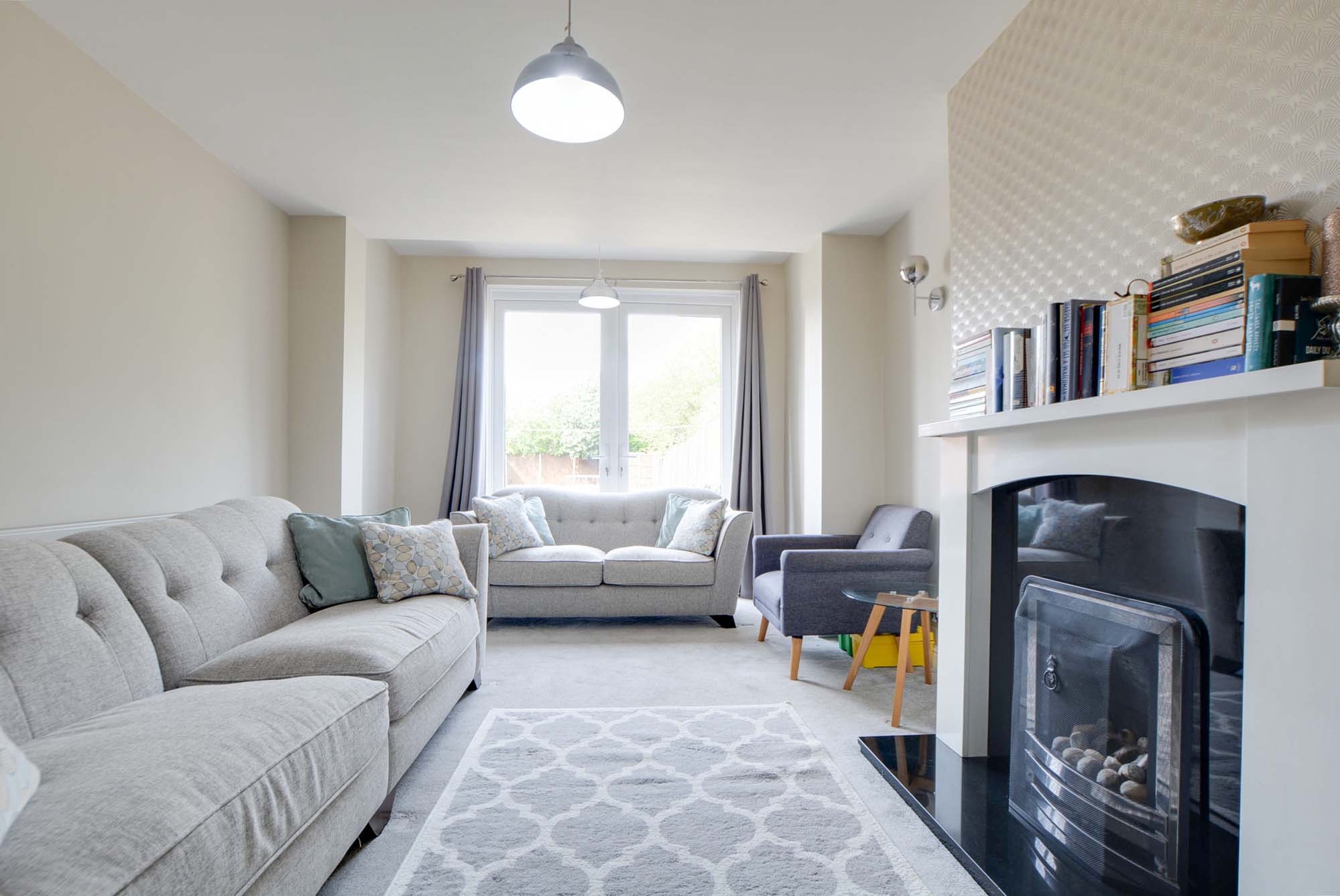 Spacious area with French doors to the garden, a chimney breast with a living flame gas fire (white surround/hearth), TV point, and radiator.