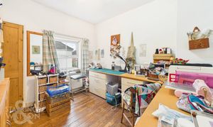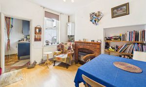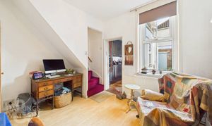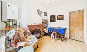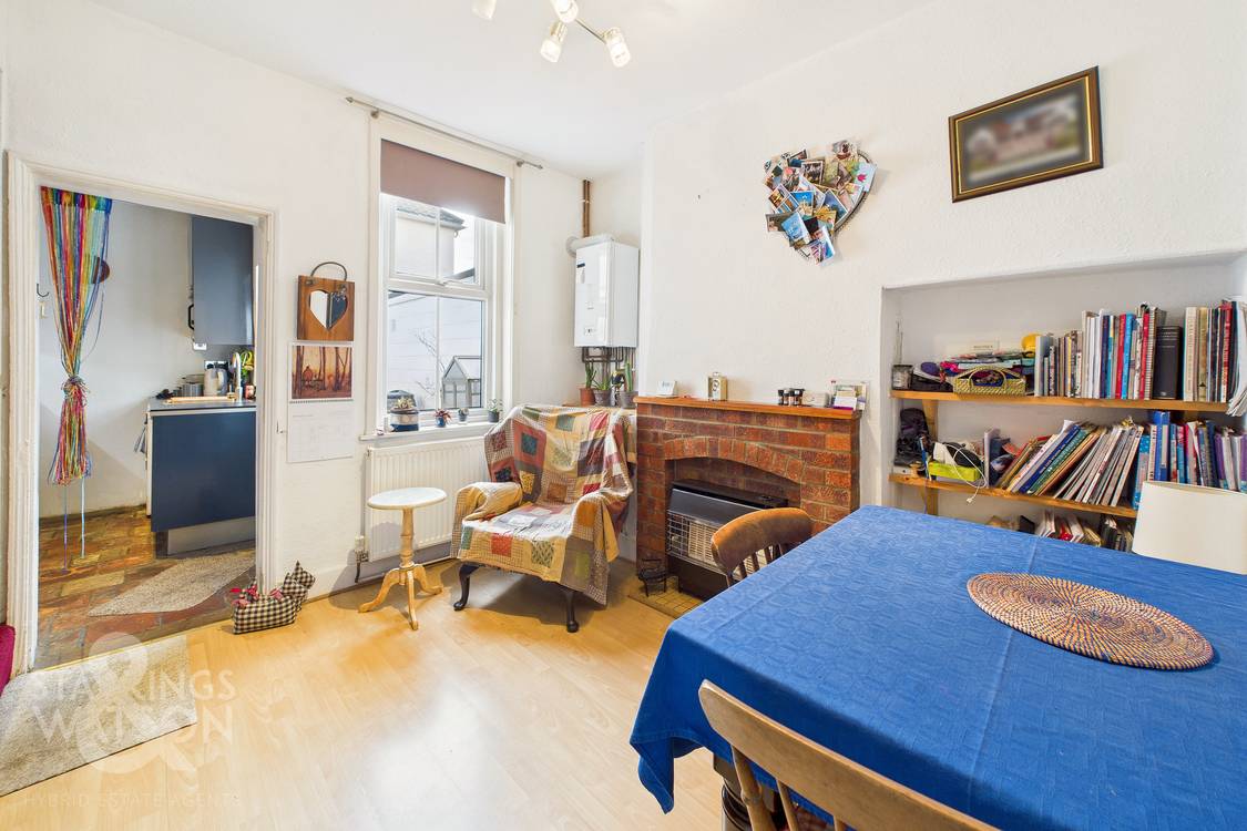 Stepping inside, the 15’ sitting room is centred around a feature fireplace with hard flooring running underfoot for ease of maintenance. The room allows for a range of soft furnishing layouts, featuring large uPVC double glazed windows with fitted shutters, while high level picture rails ensure a characterful feel. At the end of the sitting room, a door leads through to the dining room, offering a substantial integrated storage cupboard to the corner, perfect for coats and shoes and a clever use of space beneath the stairs currently utilised for a desk. Ample space is available for formal dining and soft furnishings, also centred around an exposed brick feature fireplace, with stairs rising to the first floor. Continuing through, the fully fitted kitchen includes a range of wall and base cupboards with a high gloss finish and a modern feel, integrated appliances feature including an oven, inset electric hob, and extractor above, with undercounter space available for a fridge. A doorway opens to the garden, where access can be found to the fully insulated laundry space with plumbing for a washing machine and tumble dryer.