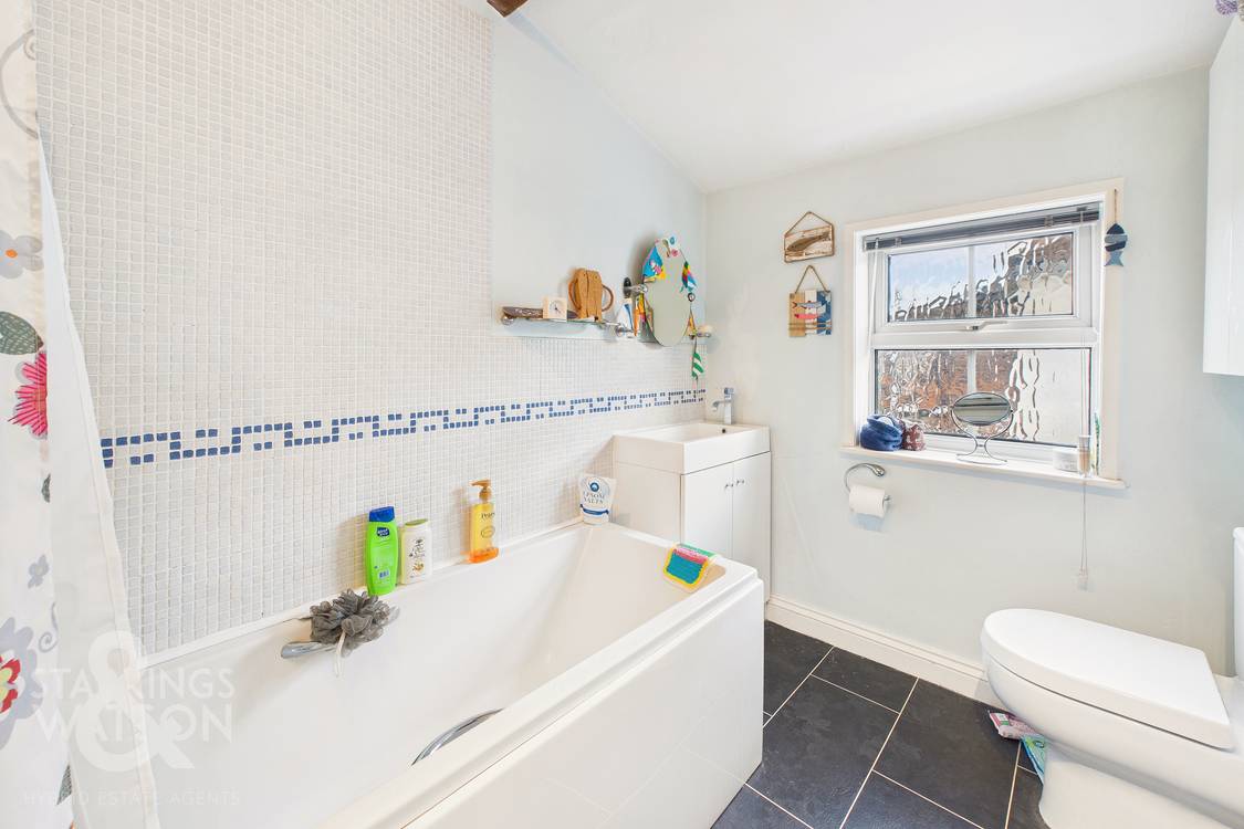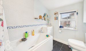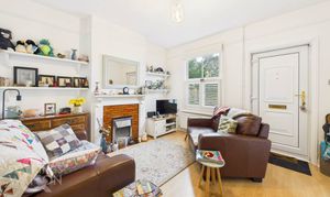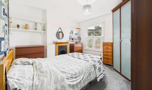 Ascending the stairs to the carpeted first floor landing, loft access can be found above while doors open to two bedrooms. The main room enjoys a front facing aspect with continued fitted shutters and a period feature fireplace, with alcoves on either side perfectly utilised for shelving and storage furniture in addition to large fitted wardrobes to the corner. The adjacent double bedroom also offers space for a double bed with a useful integrated wardrobe. Beyond, the three piece family bathroom includes a shower over the bath, tiled flooring for ease of maintenance, and vanity storage below the sink.