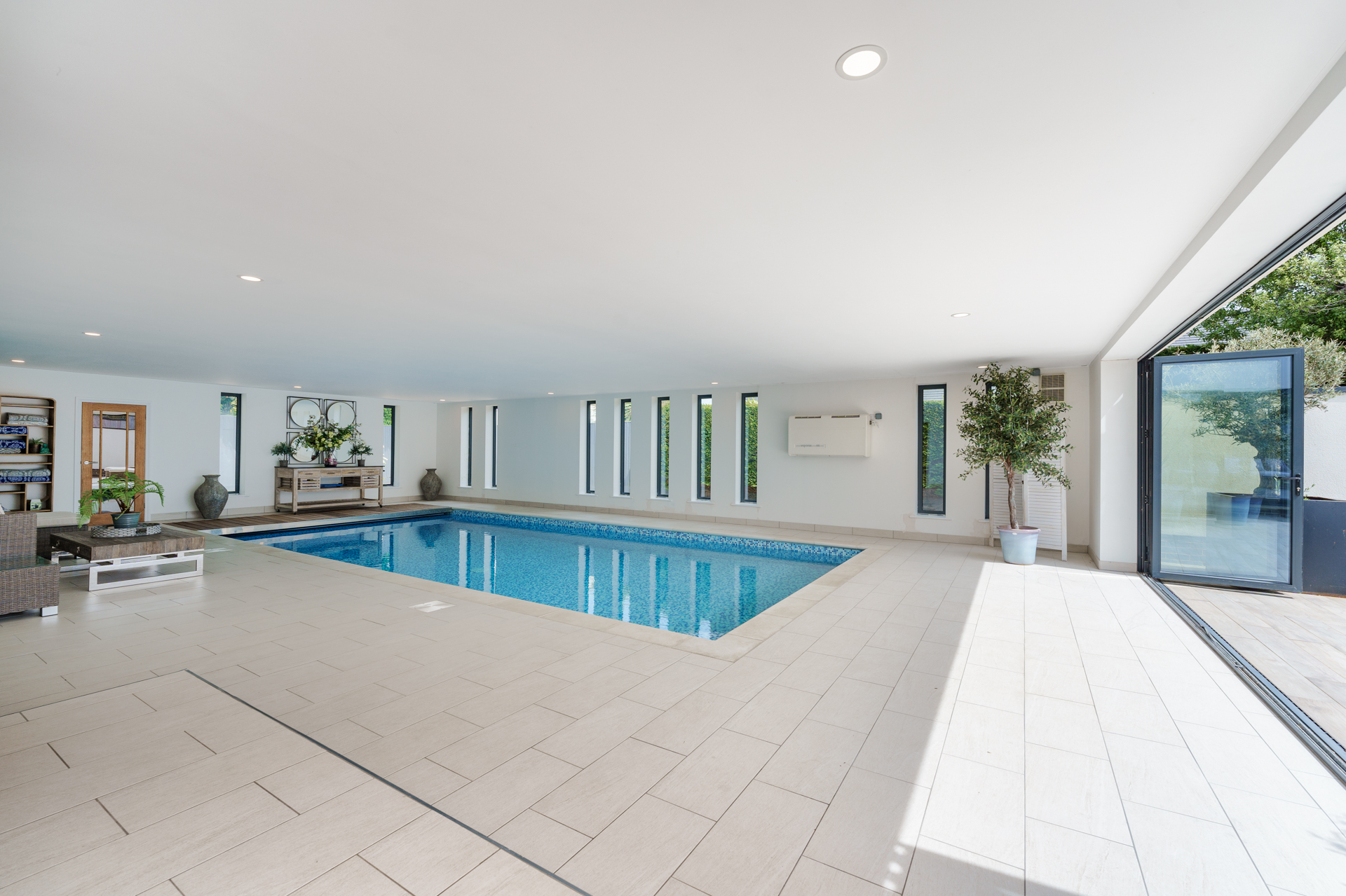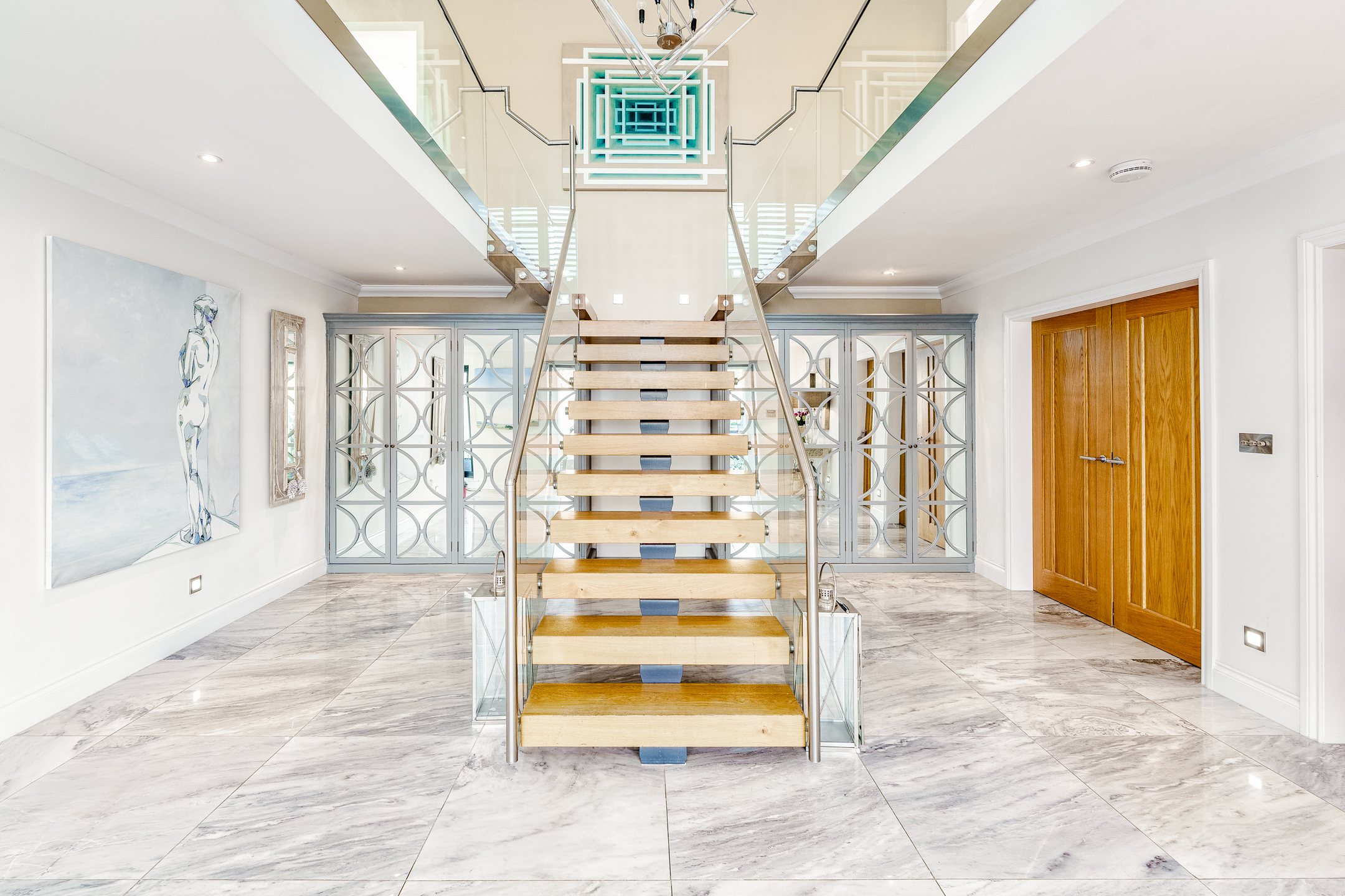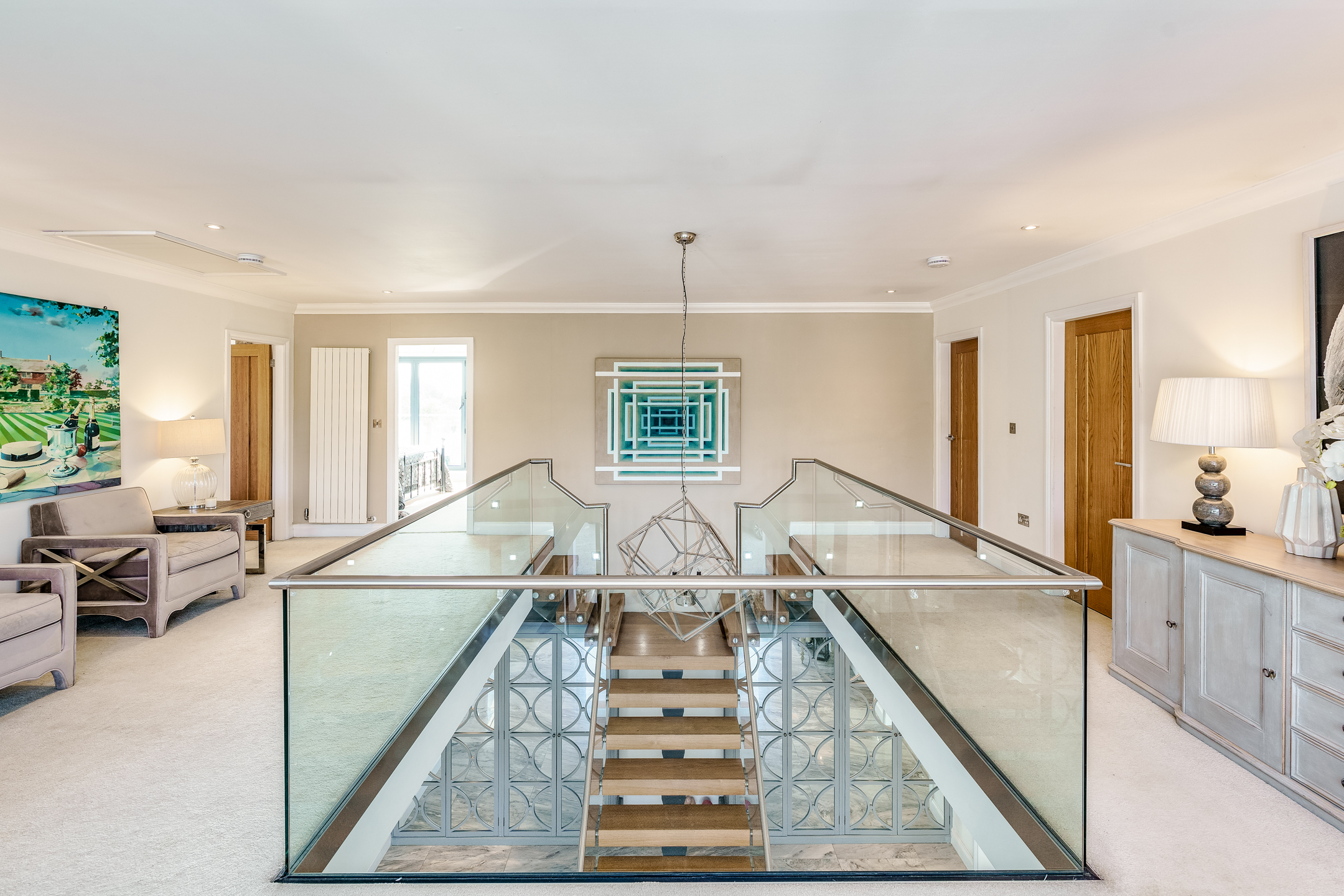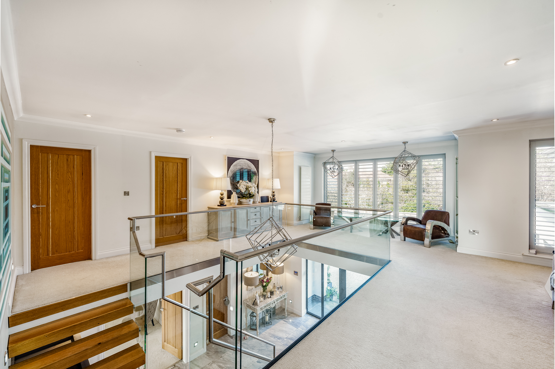 The imposing entrance hall with its spectacular bifurcated staircase leading to a fully glazed galleried landing, accentuates the exacting standards to which this distinguished property has been designed and constructed. Double doors lead from the hall to the impressive drawing room, which enjoys a magnificent glass fronted fire and direct access to the south-facing terrace and gardens. The contemporary kitchen / breakfast / family room provides the most desirable and flexible of spaces, with three sets of bi-folding doors to the terraces and pleasant views across the grounds. The indulgent kitchen enjoys an array of bespoke units, a central island with wrap-around breakfast bar and distinctive Corian work surfaces. There is a further reception room which is accessed from the kitchen breakfast room which could be used as a family room / formal dining room, and benefits from double doors to the garden. The opulent indoor swimming pool occupies a large south-facing elevation with a triple aspect and benefits from a large area for entertaining, a sauna, changing / shower room and bifolding doors to a private terrace. There is also a further reception room which is currently used as a home office, a utility room, a chic cloakroom, boiler room and an integral double garage on the ground floor.