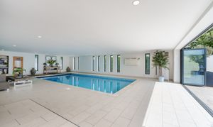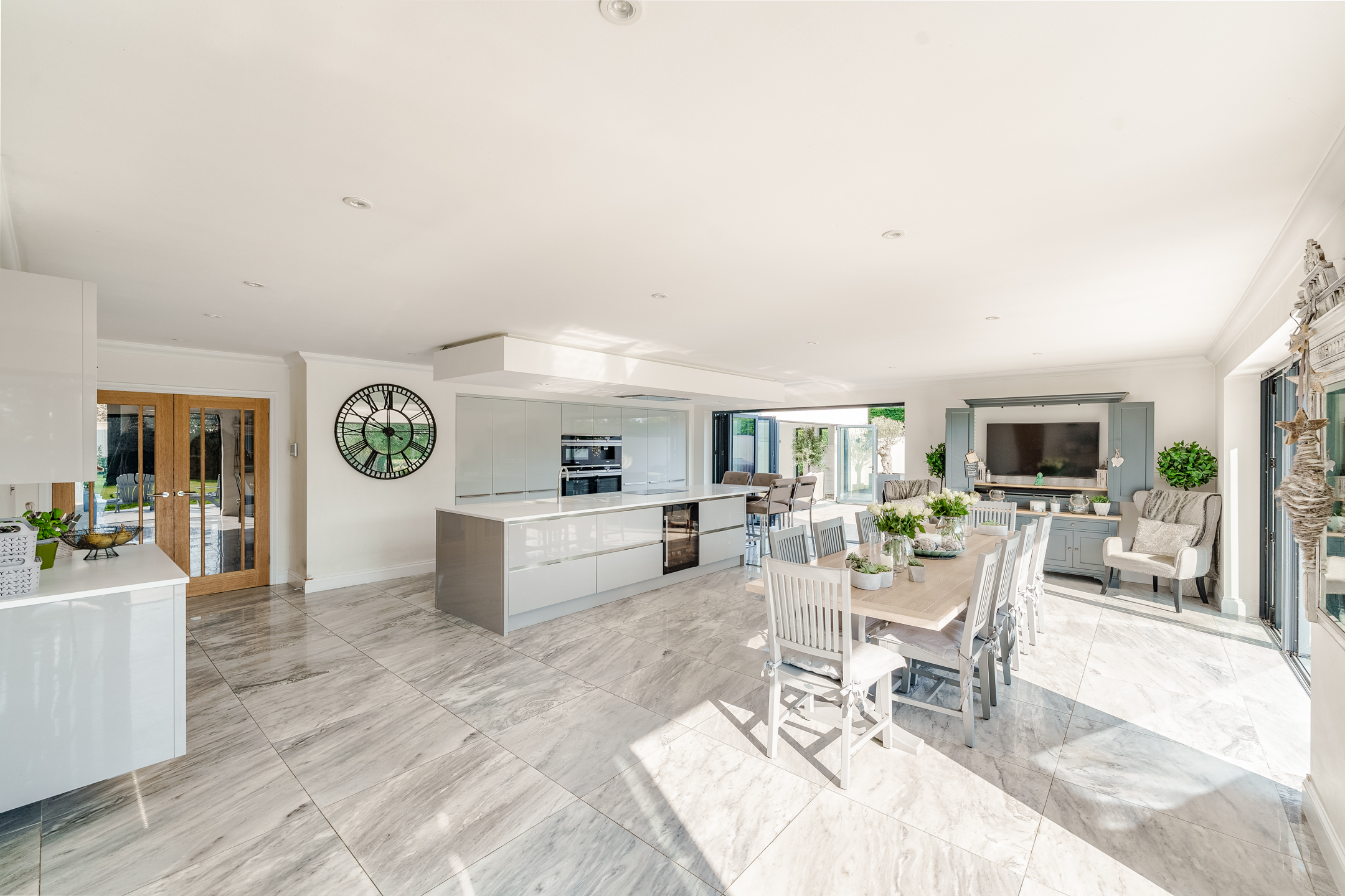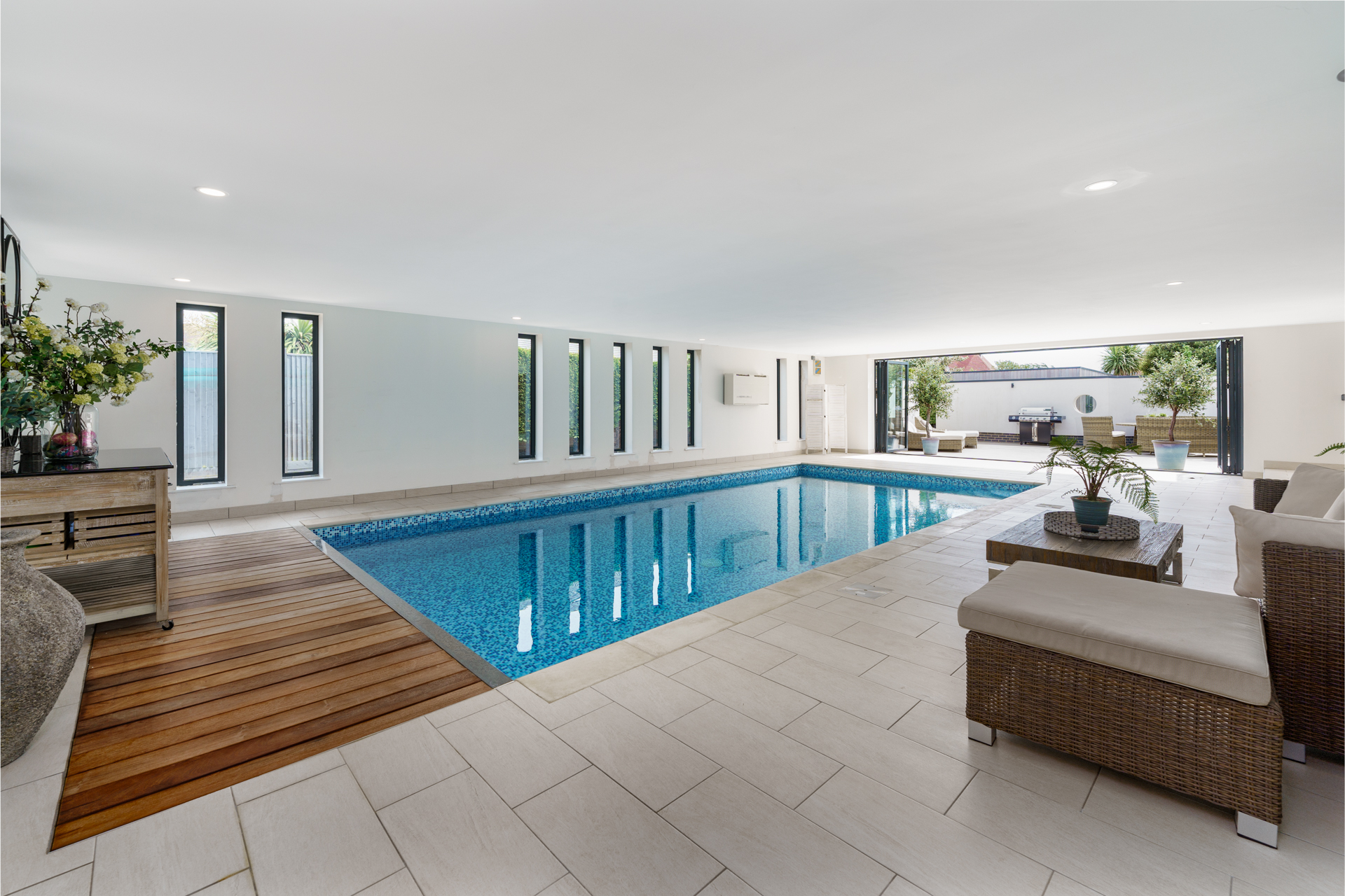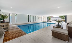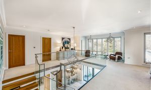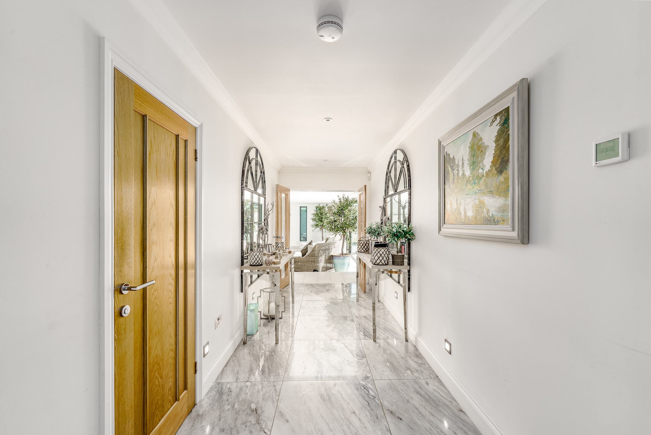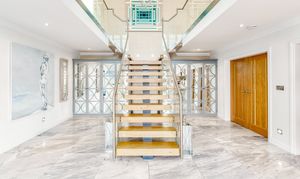 The imposing entrance hall with its spectacular bifurcated staircase leading to a fully glazed galleried landing, accentuates the exacting standards to which this distinguished property has been designed and constructed. Double doors lead from the hall to the impressive drawing room, which enjoys a magnificent glass fronted fire and direct access to the south-facing terrace and gardens. The contemporary kitchen / breakfast / family room provides the most desirable and flexible of spaces, with three sets of bi-folding doors to the terraces and pleasant views across the grounds. The indulgent kitchen enjoys an array of bespoke units, a central island with wrap-around breakfast bar and distinctive Corian work surfaces. There is a further reception room which is accessed from the kitchen breakfast room which could be used as a family room / formal dining room, and benefits from double doors to the garden. The opulent indoor swimming pool occupies a large south-facing elevation with a triple aspect and benefits from a large area for entertaining, a sauna, changing / shower room and bifolding doors to a private terrace. There is also a further reception room which is currently used as a home office, a utility room, a chic cloakroom, boiler room and an integral double garage on the ground floor.