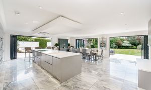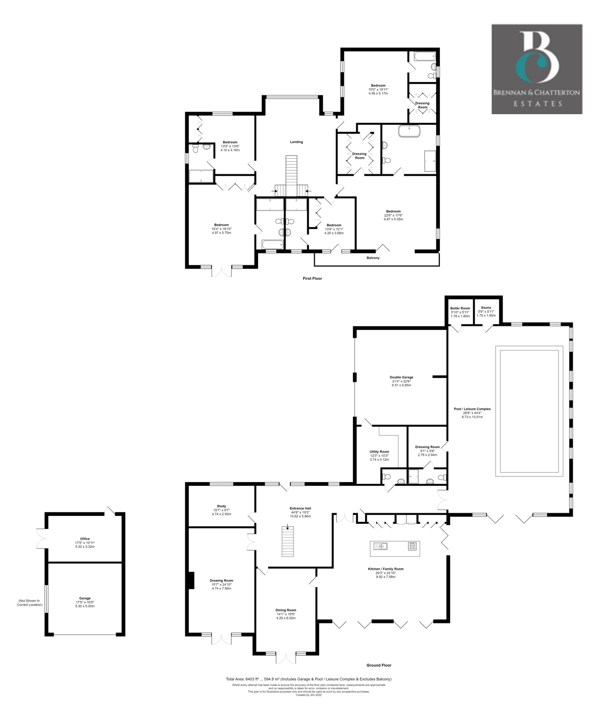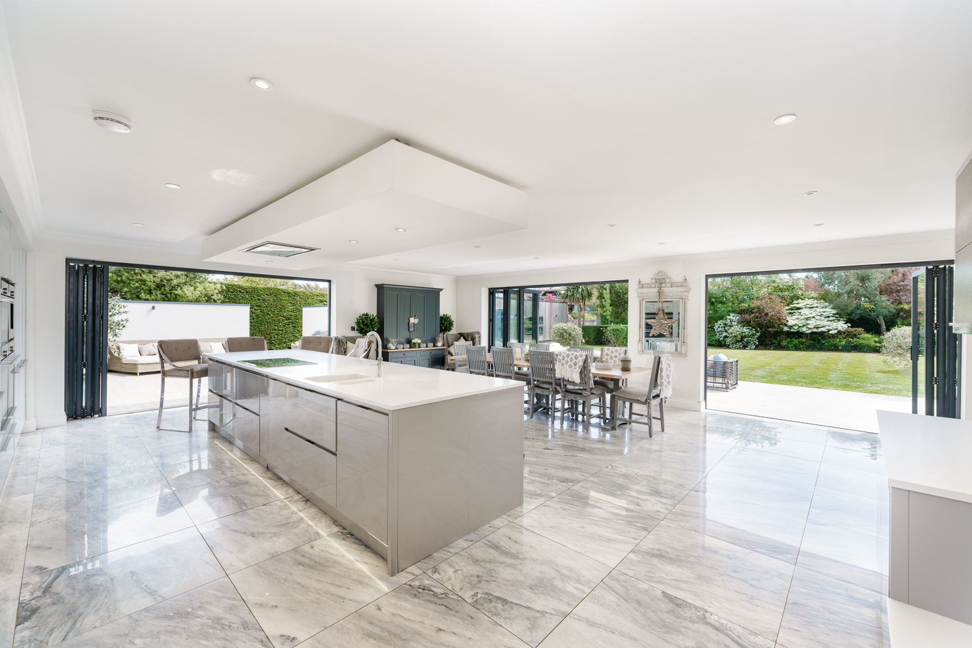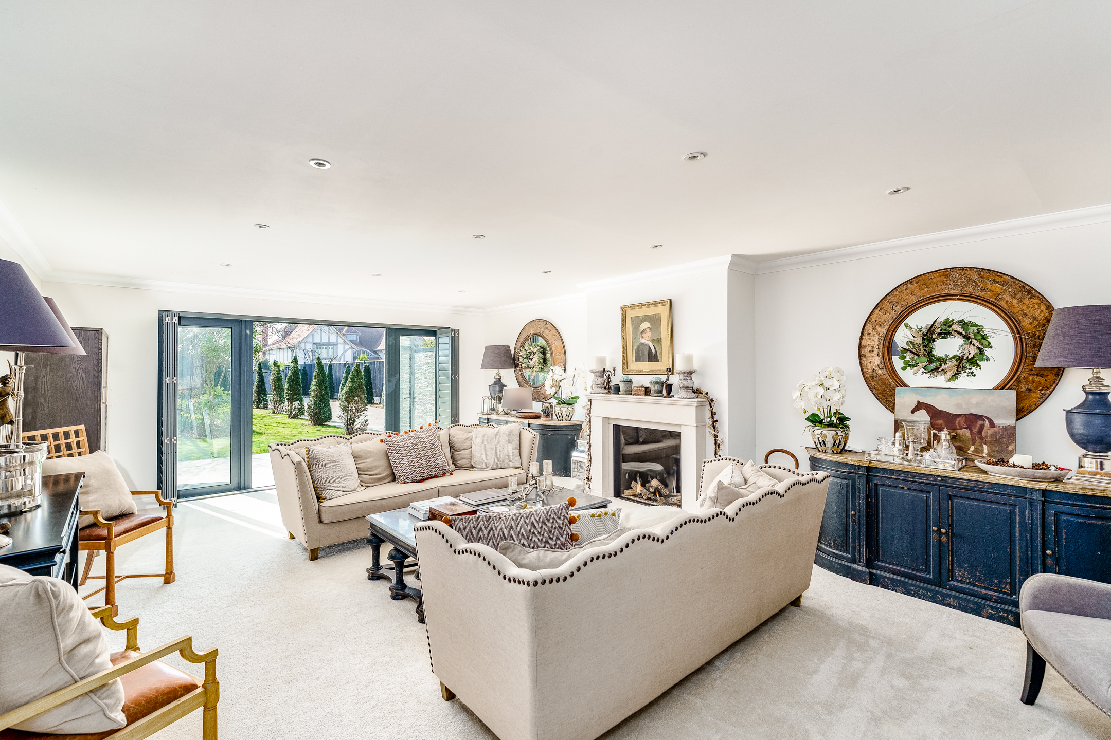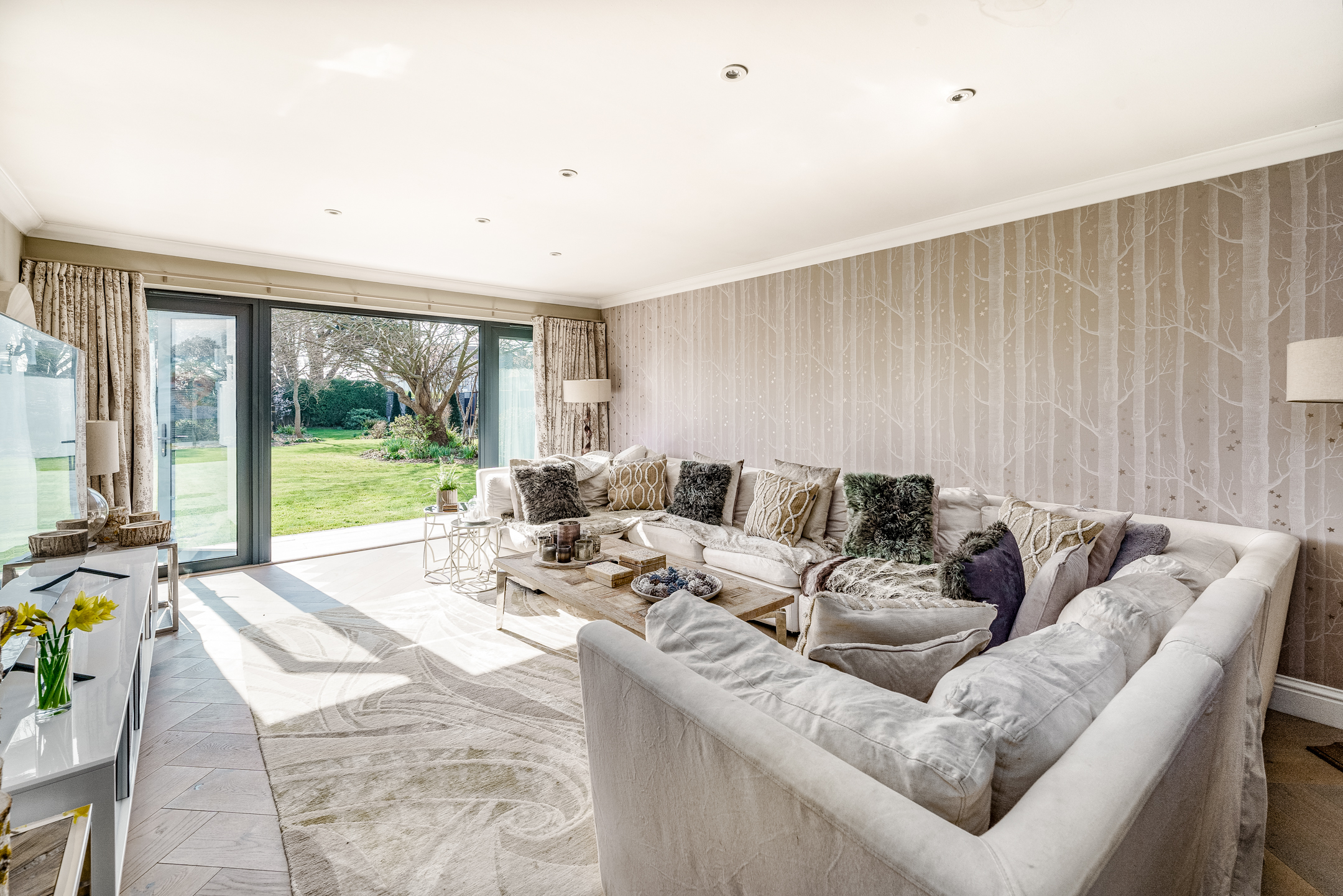 The imposing entrance hall with its spectacular bifurcated staircase leading to a fully glazed galleried landing, accentuates the exacting standards to which this distinguished property has been designed and constructed. Double doors lead from the hall to the impressive drawing room, which enjoys a magnificent glass fronted fire and direct access to the south-facing terrace and gardens. The contemporary kitchen / breakfast / family room provides the most desirable and flexible of spaces, with three sets of bi-folding doors to the terraces and pleasant views across the grounds. The indulgent kitchen enjoys an array of bespoke units, a central island with wrap-around breakfast bar and distinctive Corian work surfaces. There is a further reception room which is accessed from the kitchen breakfast room which could be used as a family room / formal dining room, and benefits from double doors to the garden. The opulent indoor swimming pool occupies a large south-facing elevation with a triple aspect and benefits from a large area for entertaining, a sauna, changing / shower room and bifolding doors to a private terrace. There is also a further reception room which is currently used as a home office, a utility room, a chic cloakroom, boiler room and an integral double garage on the ground floor.