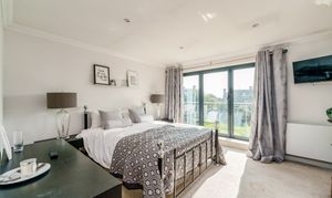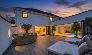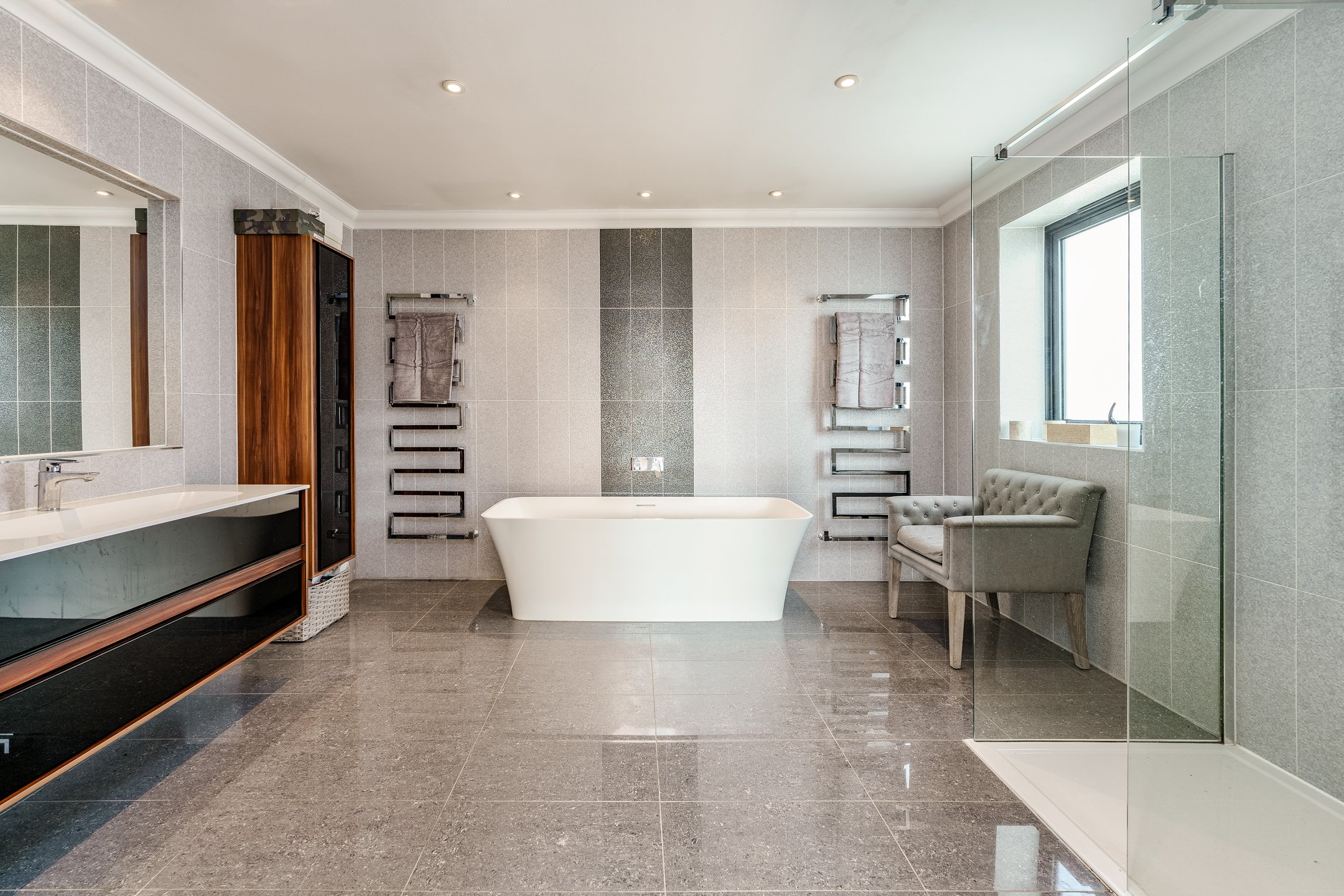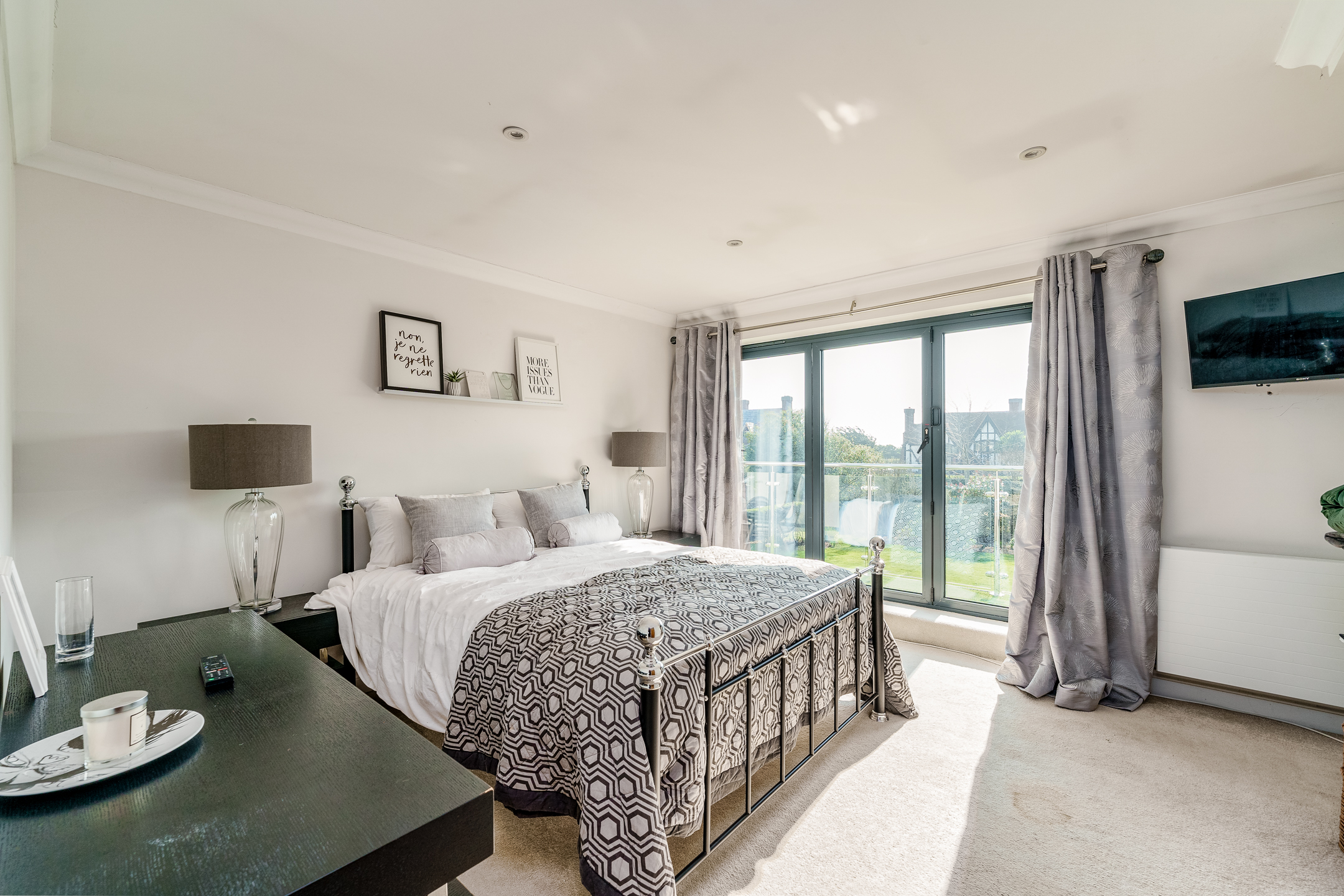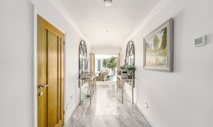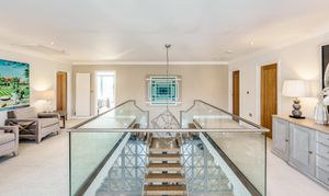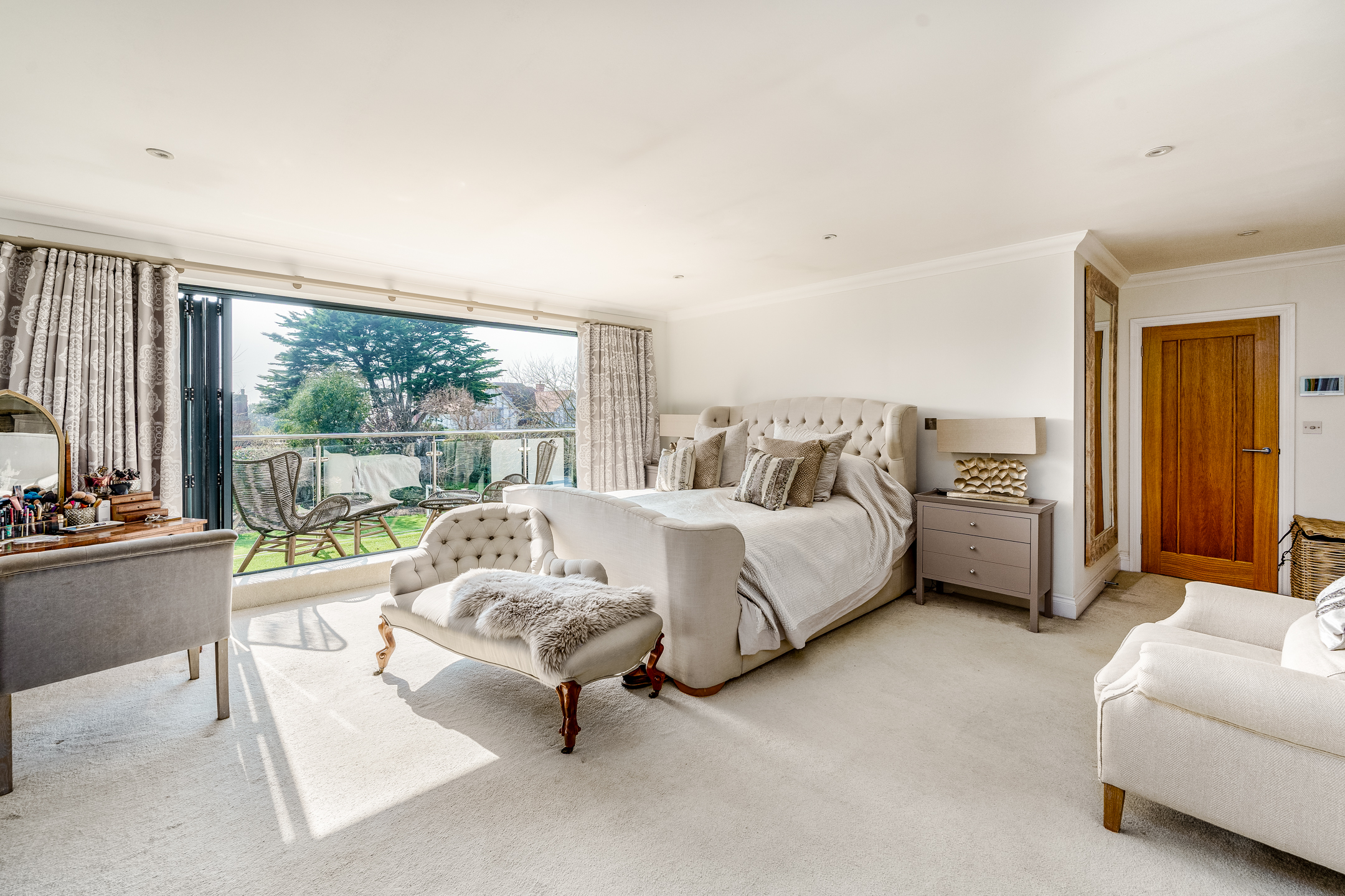 The lavish principal suite on the first floor boasts a south-facing balcony with sea views, an opulent bathroom with a free-standing tub and double walk-in shower and an impressive dressing area with an extensive array of customised wardrobes. There are four further bedrooms on this floor, all of which are exceptionally well-proportioned and have immaculate ensuites and either built-in or walk-in wardrobes.