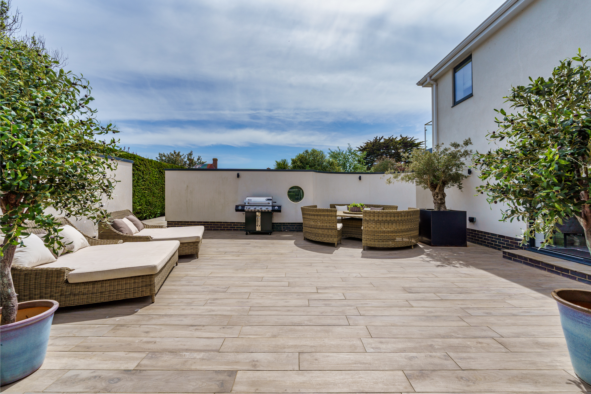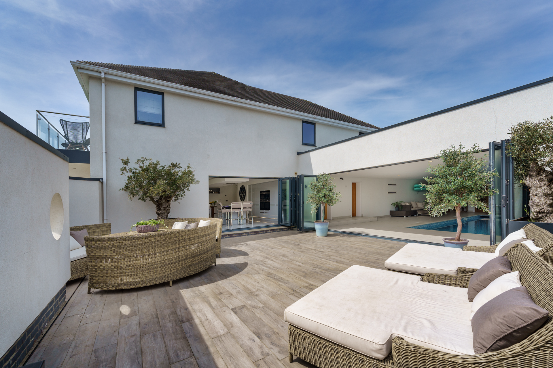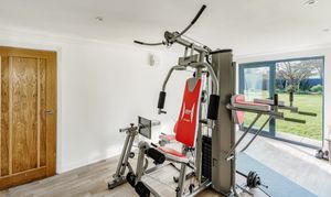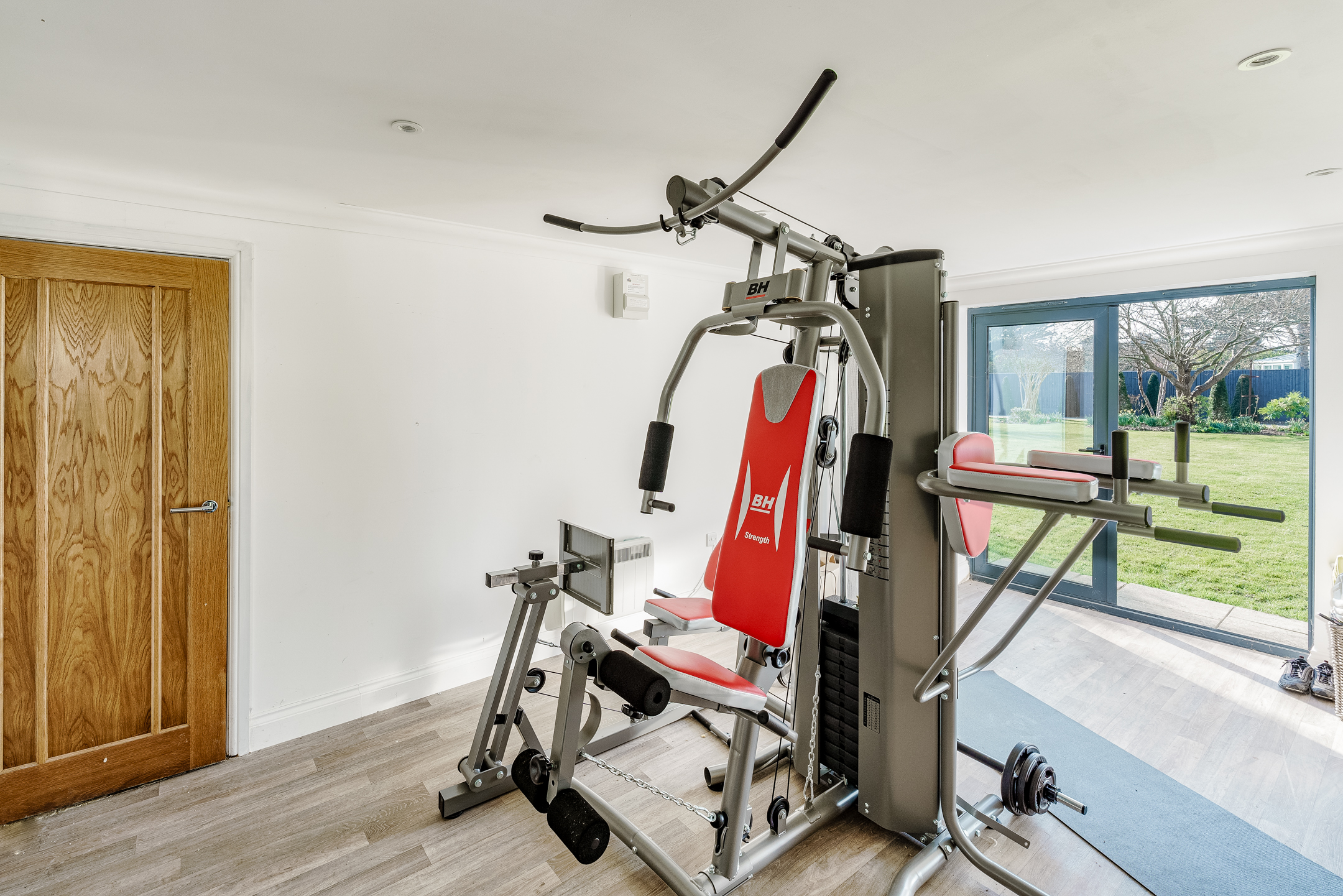 There is a separate cedar-clad building in the front garden which is accessed from a private gated entrance on Tamarisk Way. It is currently used as a further double garage and separate gym, but subject to the requisite planning consents being obtained, could have multiple other uses.