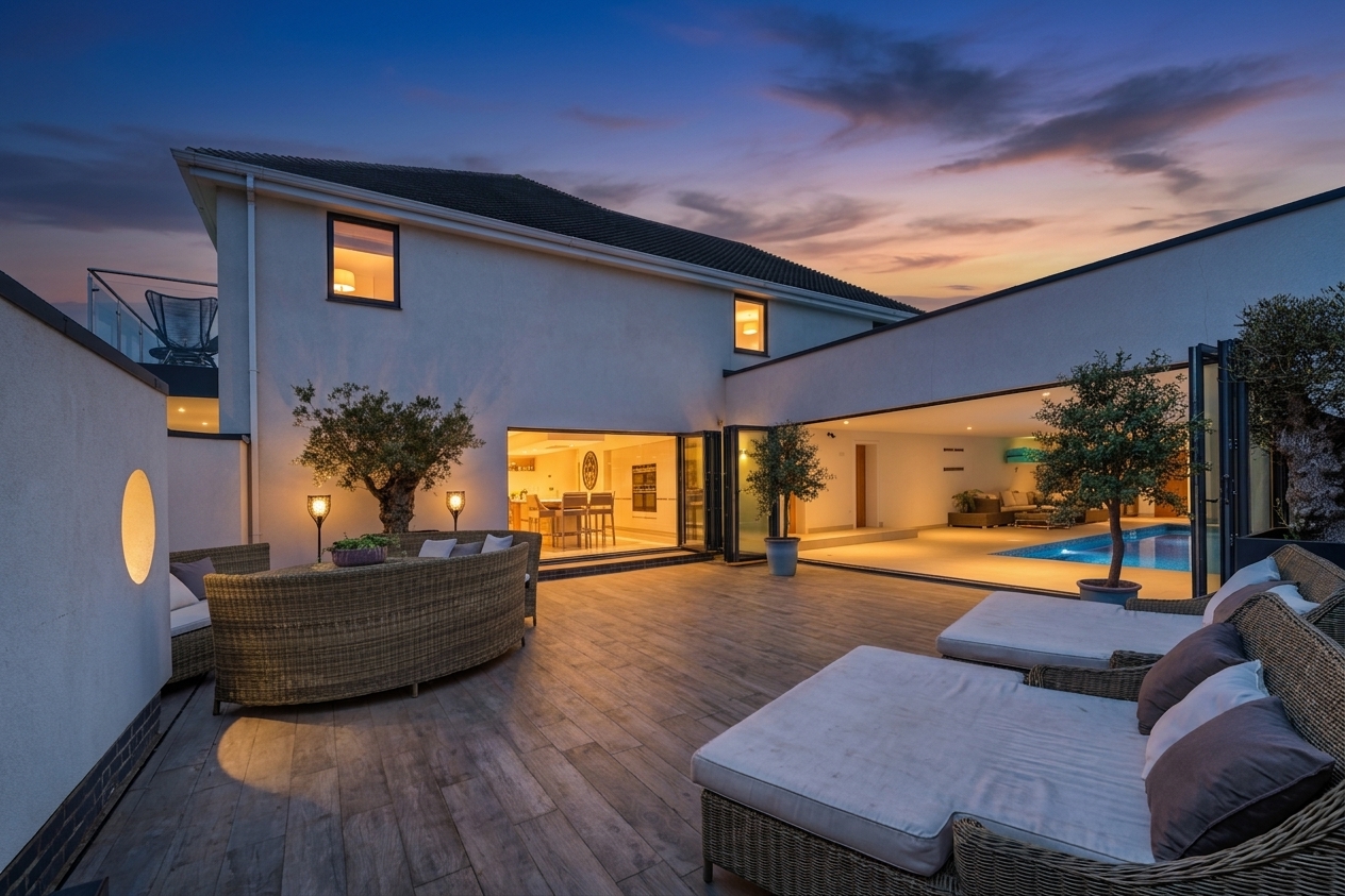 Beachcomber’s mature and landscaped grounds have been diligently maintained to provide seclusion and privacy. There is an extensive south-facing terrace which is accessed from all principal rooms and overlooking the large manicured lawns, provides an impressive area for alfresco living. There is also a separate walled courtyard which links the pool complex and kitchen / family room and provides an enviable sun terrace which is sheltered from the elements. The property is accessed via double electric gates from where an imposing driveway leads to a large parking area and to the integral double garage.