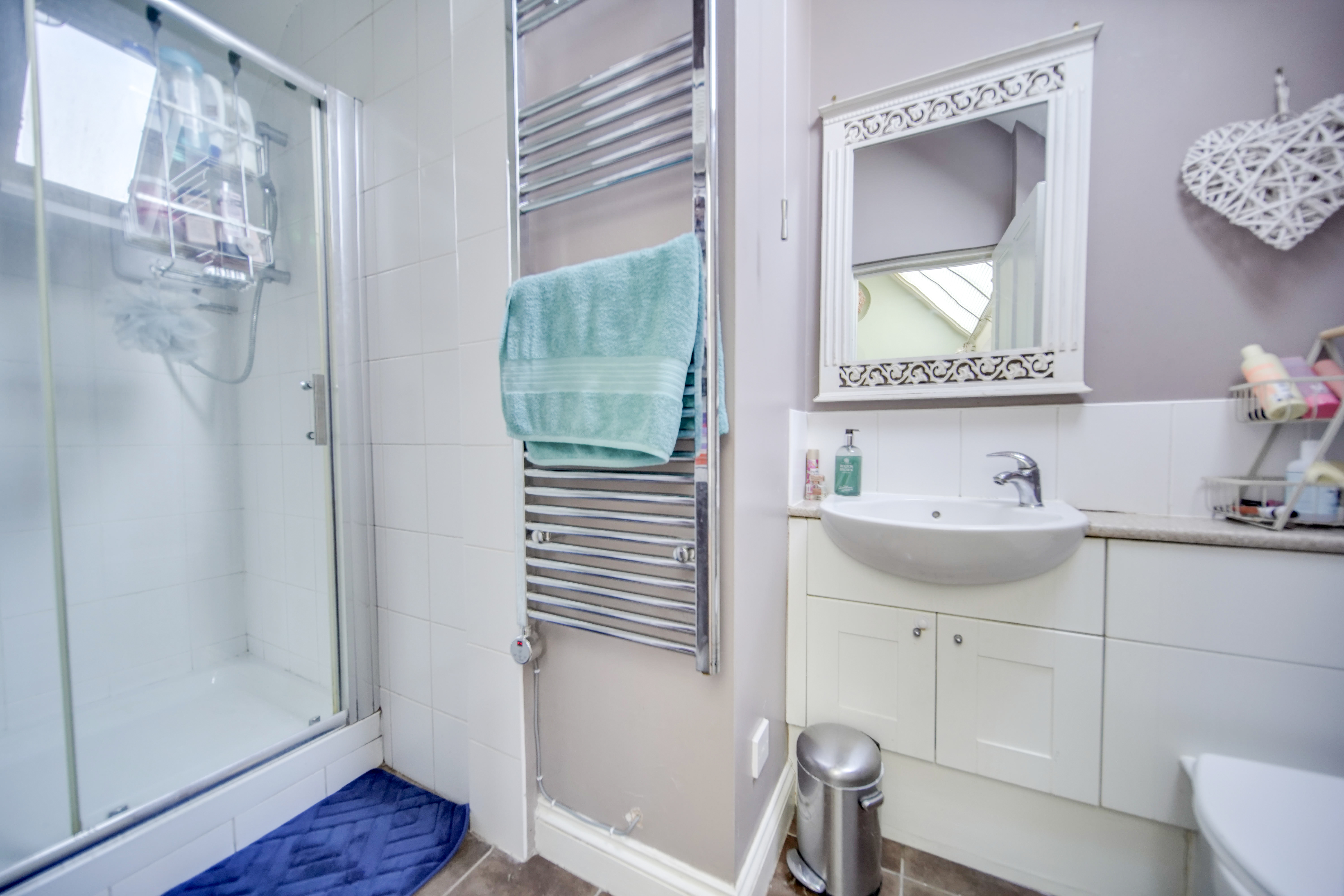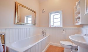 Upstairs, the landing with painted wood panelling leads to three bedrooms, each with unique character features including vaulted ceilings, natural wood flooring and a Juliet balcony in bedroom three. The family bathroom offers a classic white suite with panelled bath and shower attachment, heated towel rail and rear aspect window.