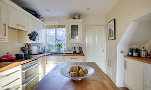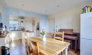 The impressive kitchen/dining area features a range of fitted units with solid wood worktops, a Belfast sink, a freestanding island, integrated appliances and a cosy fireplace with log burner. A charming feature window frames views over the front garden and playing fields.