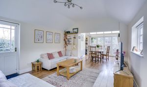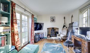 A spacious sitting room provides an inviting family space with garden views, wood-effect flooring and access to a private terrace. This flows seamlessly into the stunning garden room, flooded with natural light from its part-glazed vaulted ceiling and enjoying direct access to a secluded courtyard. A modern shower room and a utility room with wine storage complete the ground-floor amenities.