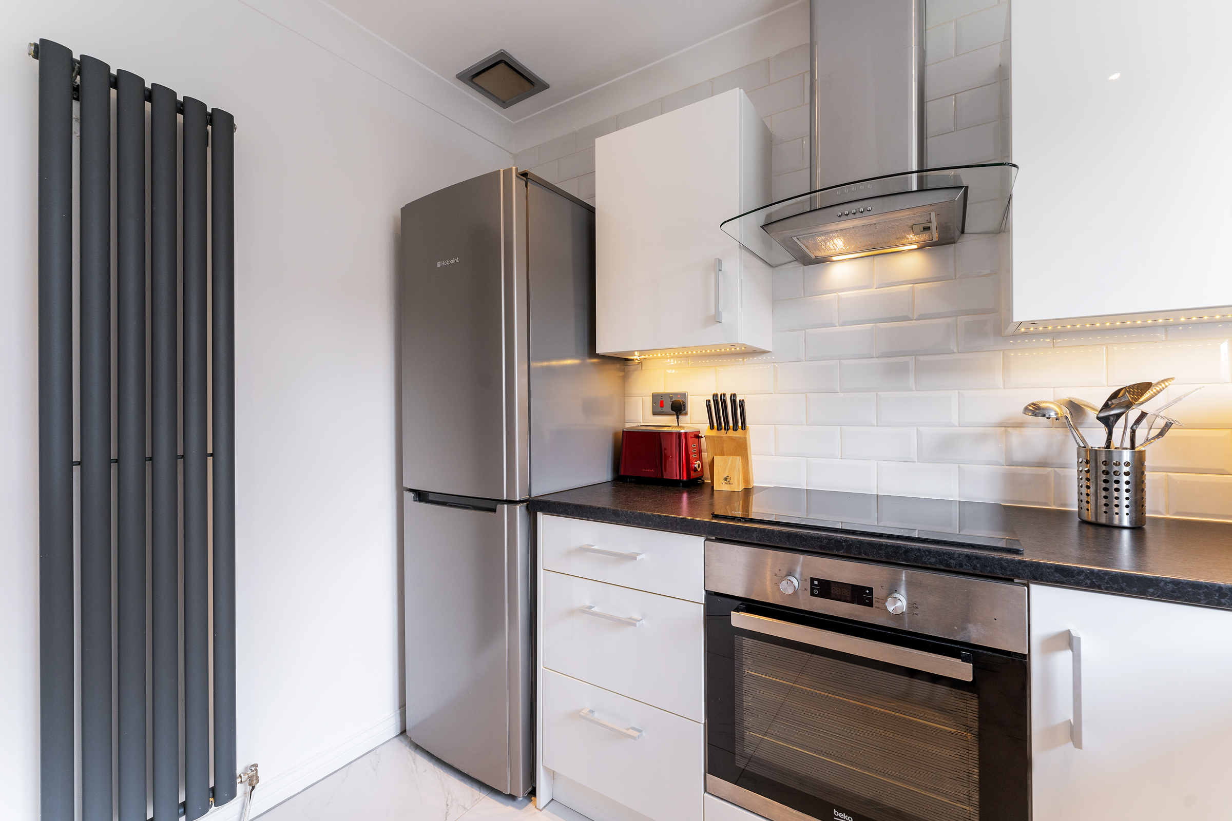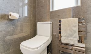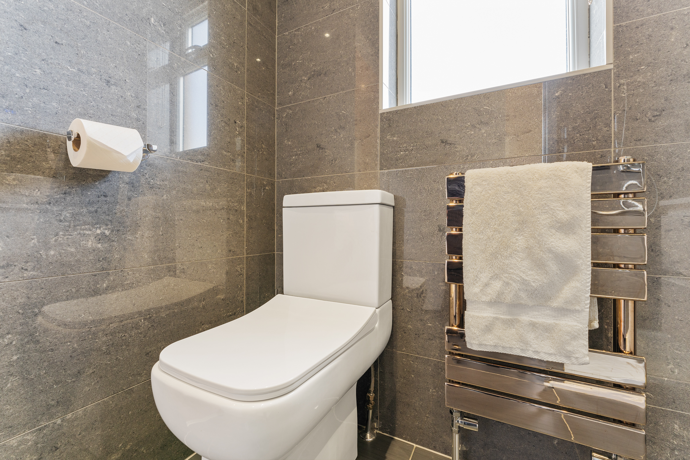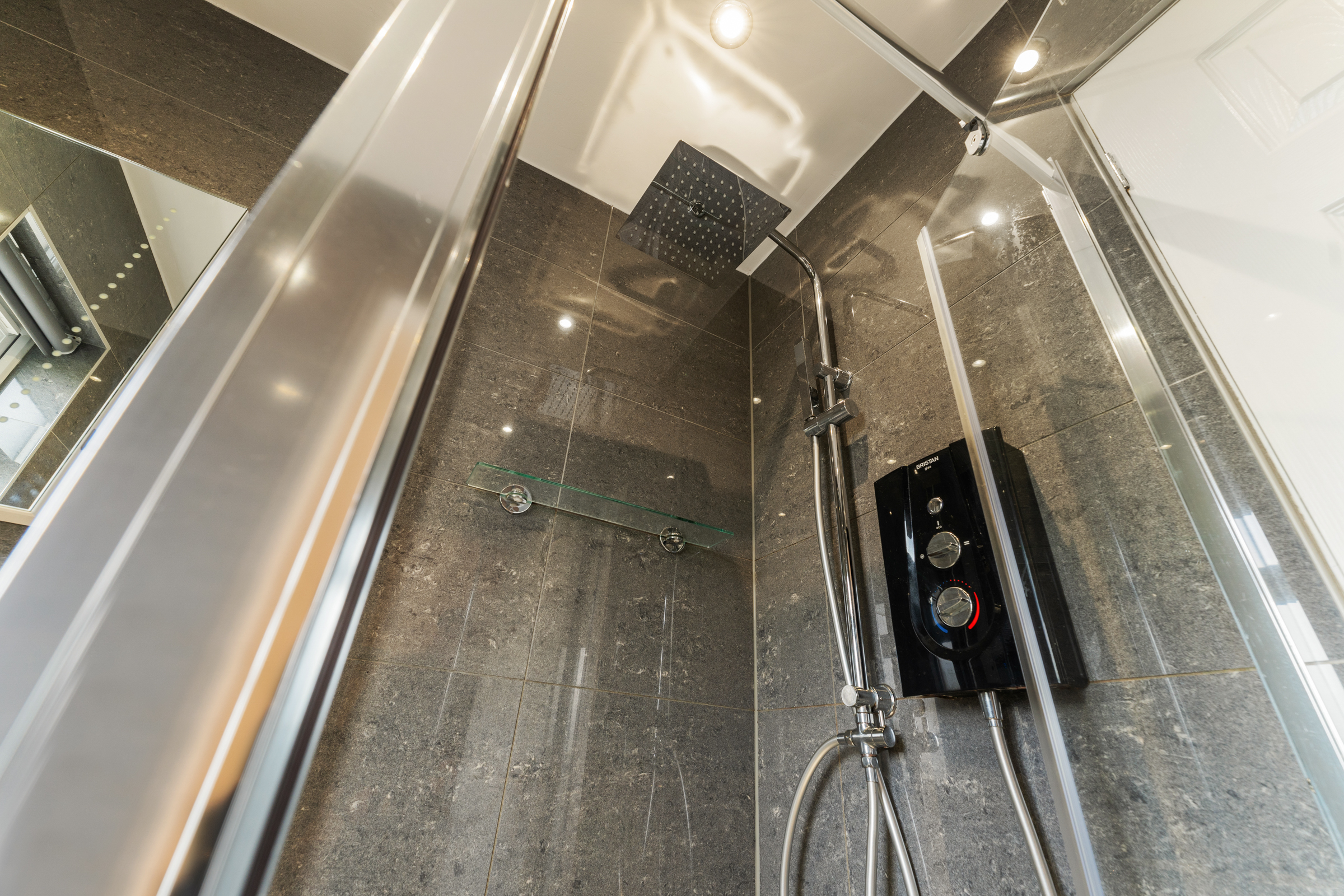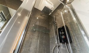 The ultra-modern bathroom is fully tiled, and features a shower unit with electric shower, and a rainfall shower head. A heated towel rail completes the look, and underfloor heating adds a touch of luxury!