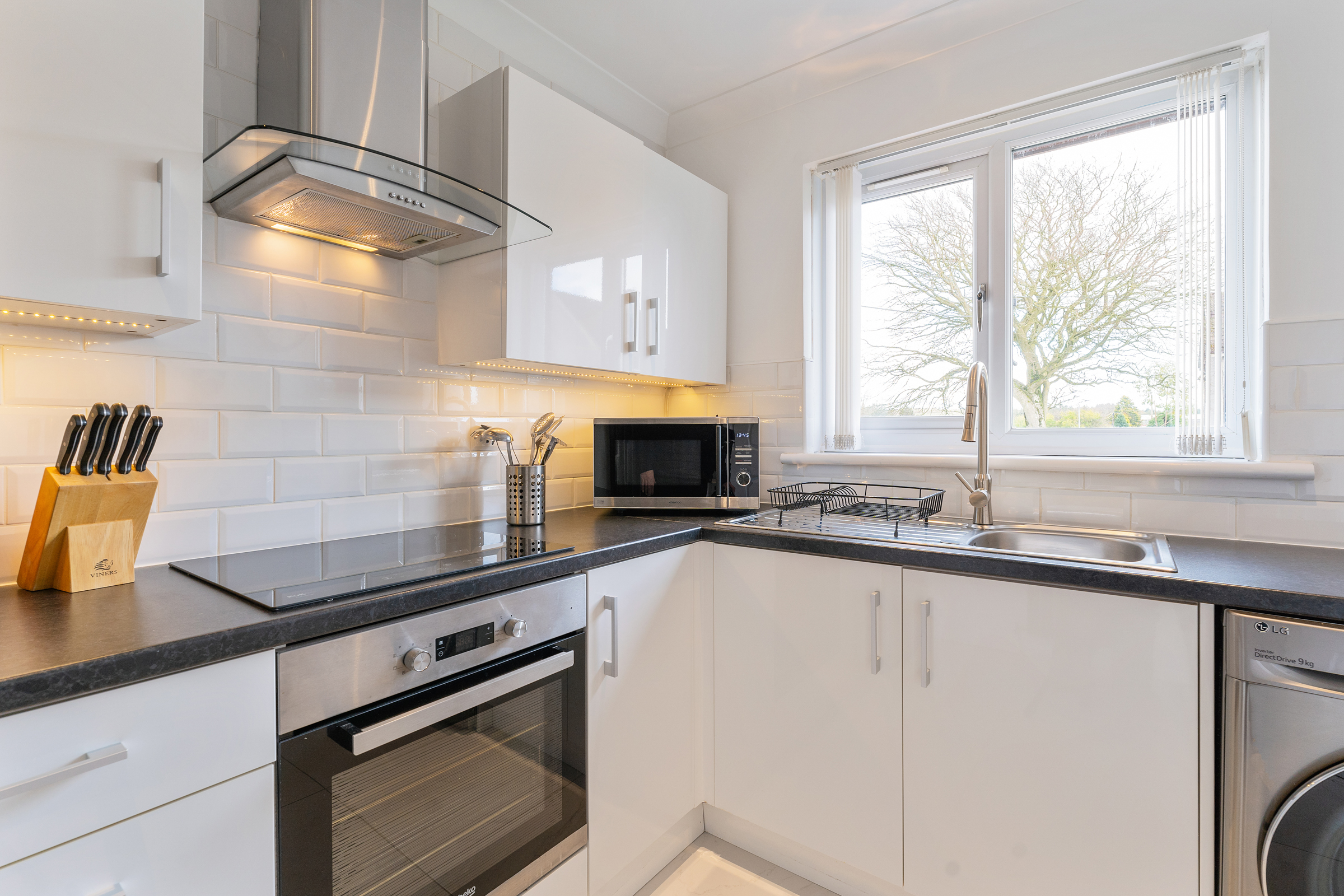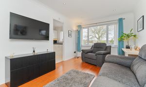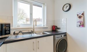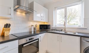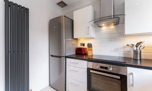 The lovely lounge features hardwood flooring, and the large window fills the room with natural light. The modern fitted kitchen features high gloss units, single electric oven, induction hob, extractor hood, and has space for a stand-alone washing machine and fridge/freezer.