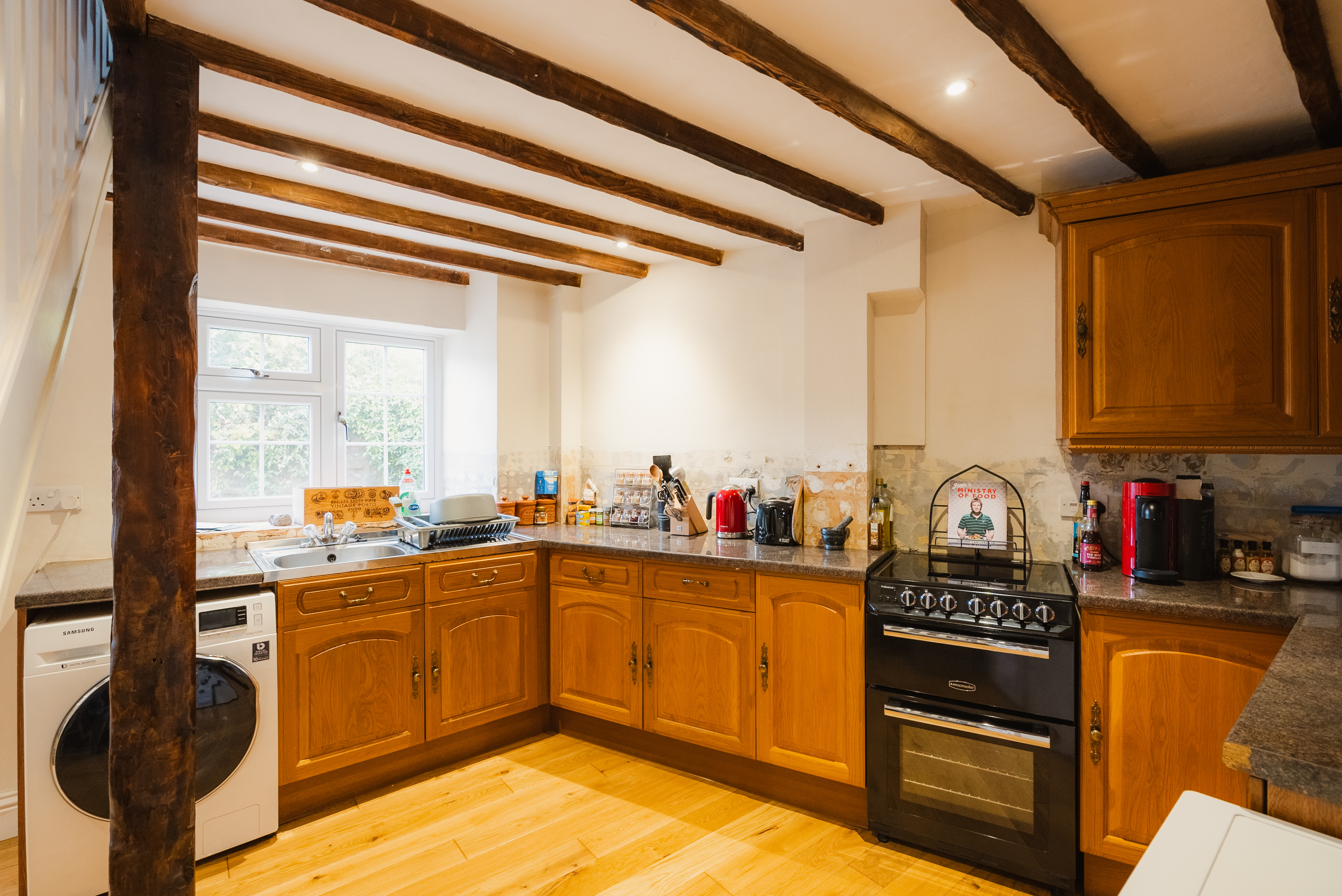 The house itself is surprisingly spacious and has been thoughtfully renovated throughout, blending modern finishes with timeless character. The ground floor is open and bright, with a woodburner set in a stone fireplace, exposed ceiling beams, and stable-style door to the front, adding plenty of personality. New oak flooring runs through the living space, creating a warm and welcoming flow and the central stairs create zones for cooking and relaxing. To the rear, there’s a useful utility area and door to the back where there’s access for maintenance.