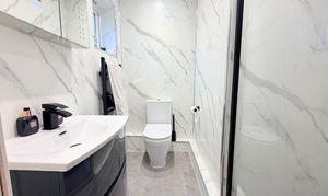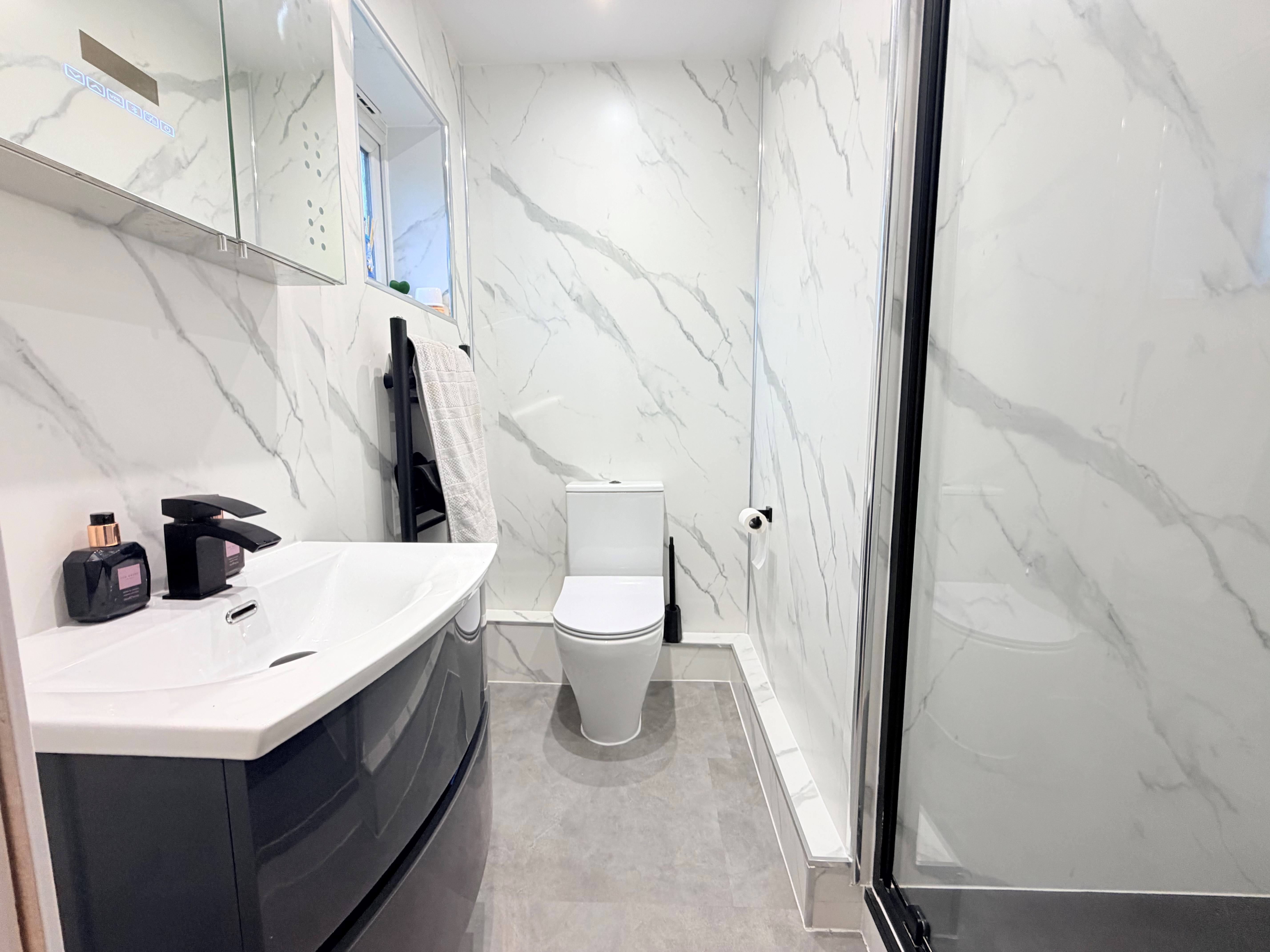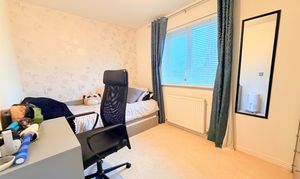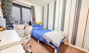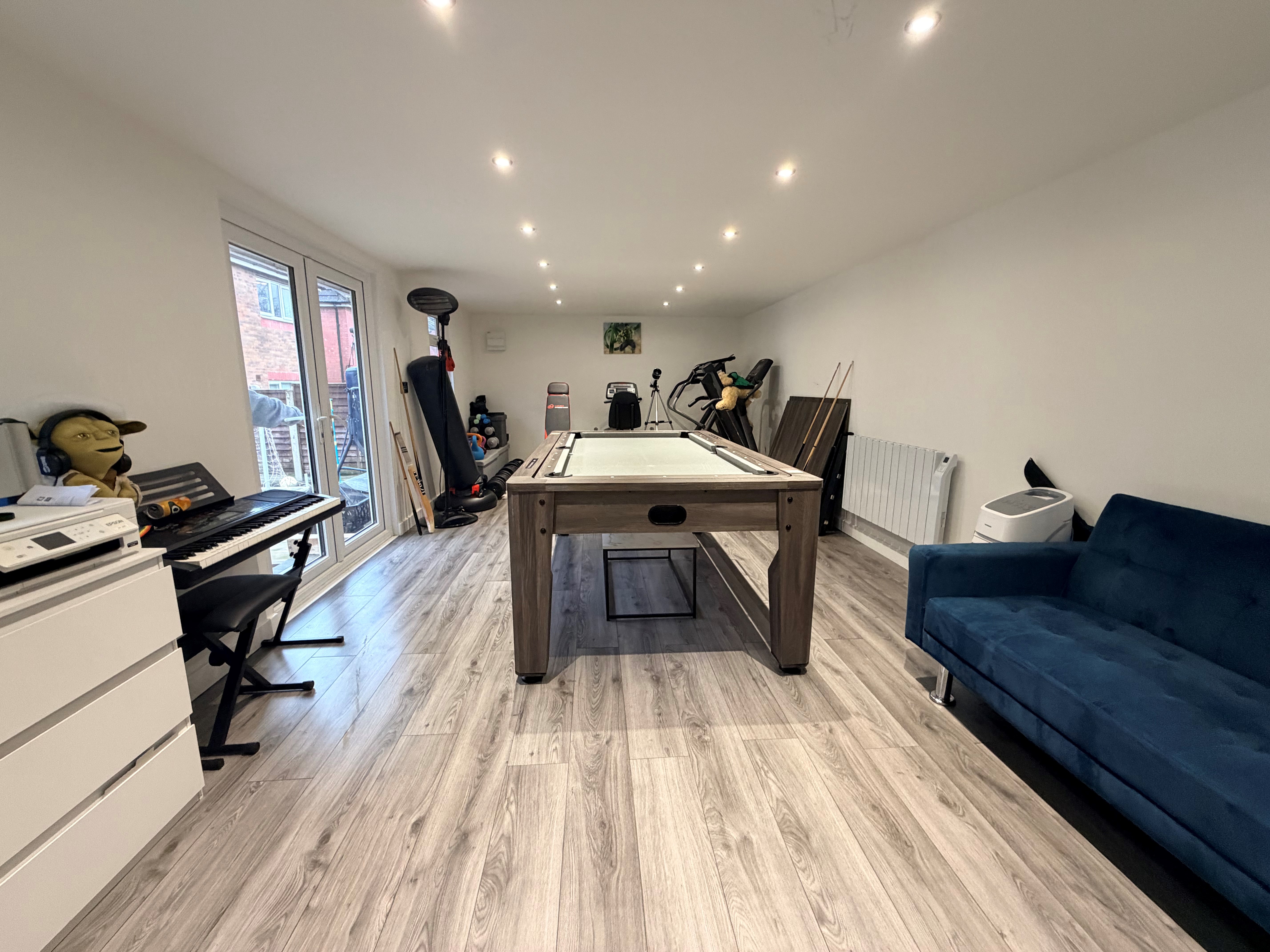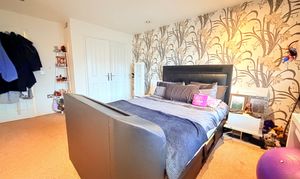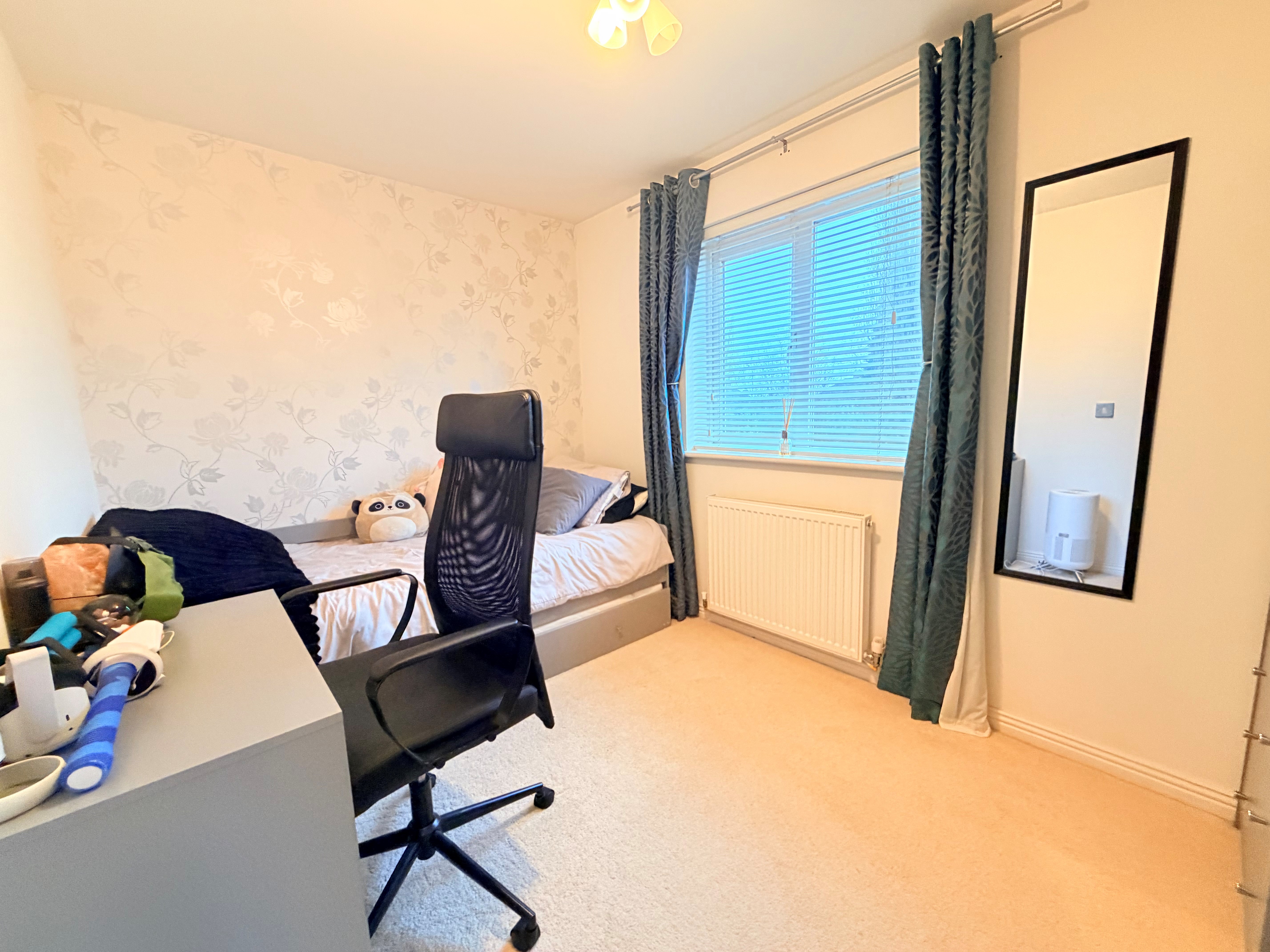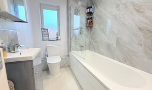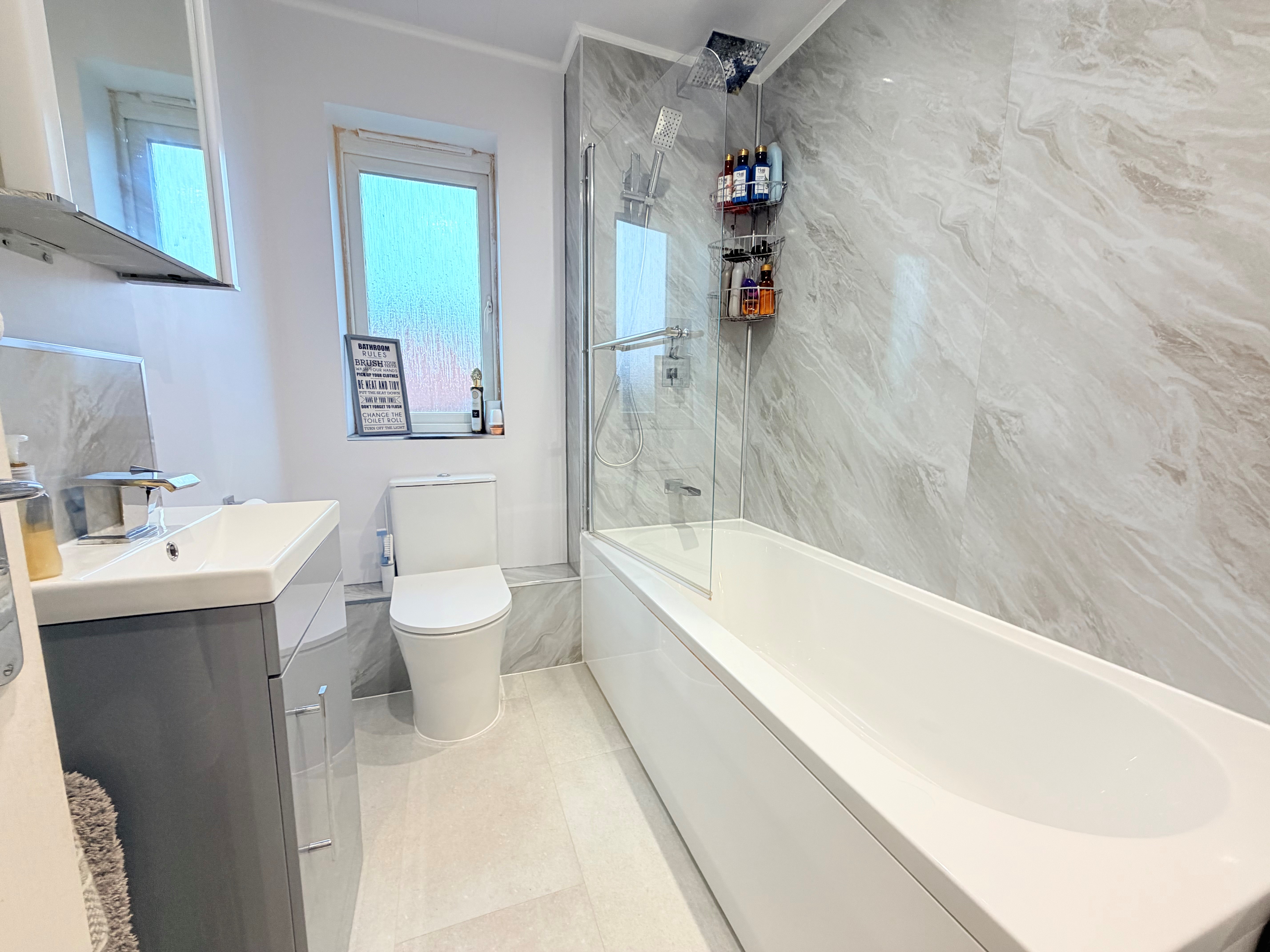 To the first floor, the landing provides access to four well-proportioned double bedrooms, three of which benefit from fitted wardrobes, offering excellent storage while maintaining generous room sizes. The principal bedroom is served by a modern refitted en suite shower room, finished with a sleek white suite and a separate shower cubicle. In addition, there is a contemporary family bathroom, fitted with a modern white suite and a shower unit over the bath, providing excellent facilities for a growing family.