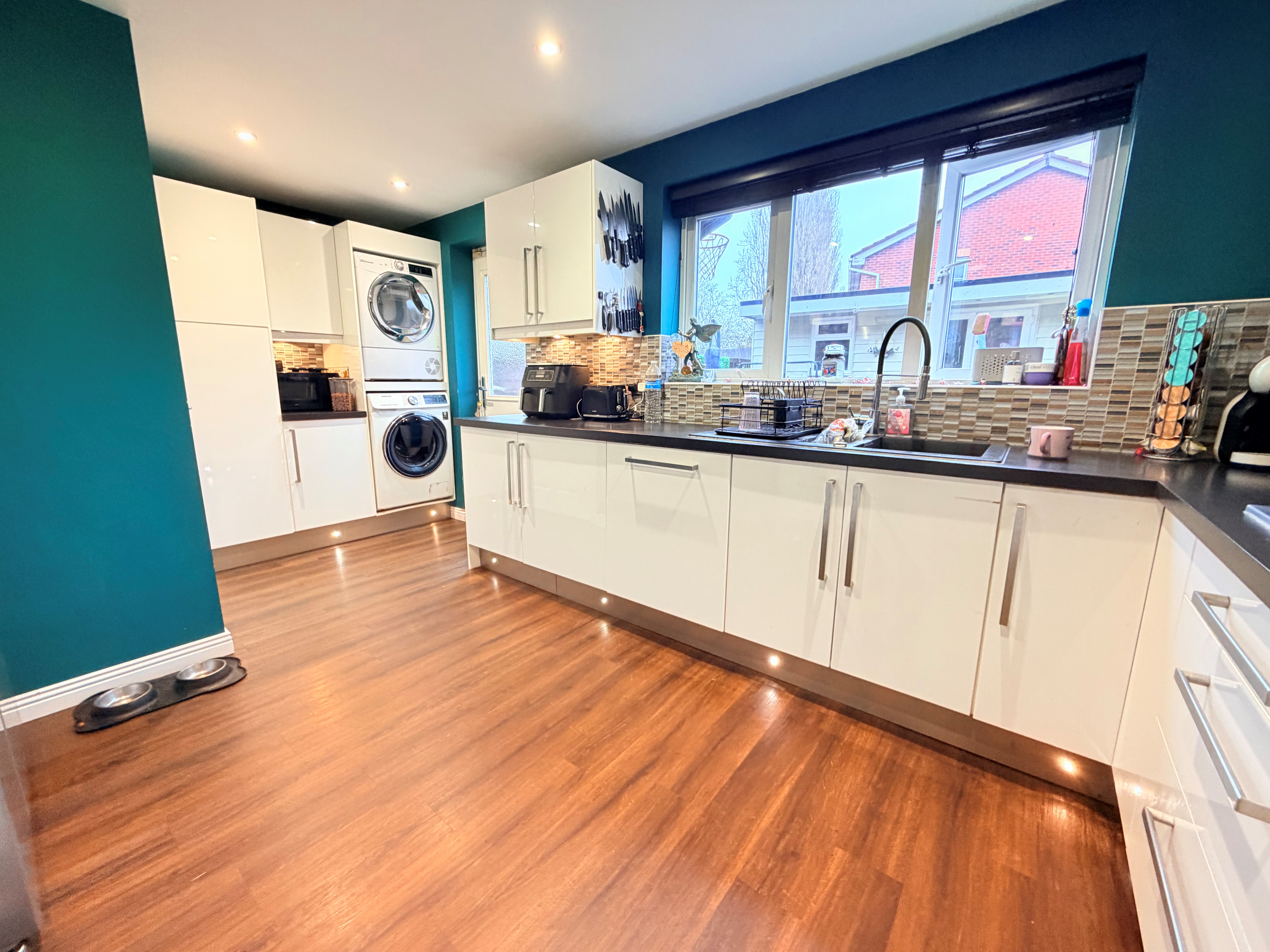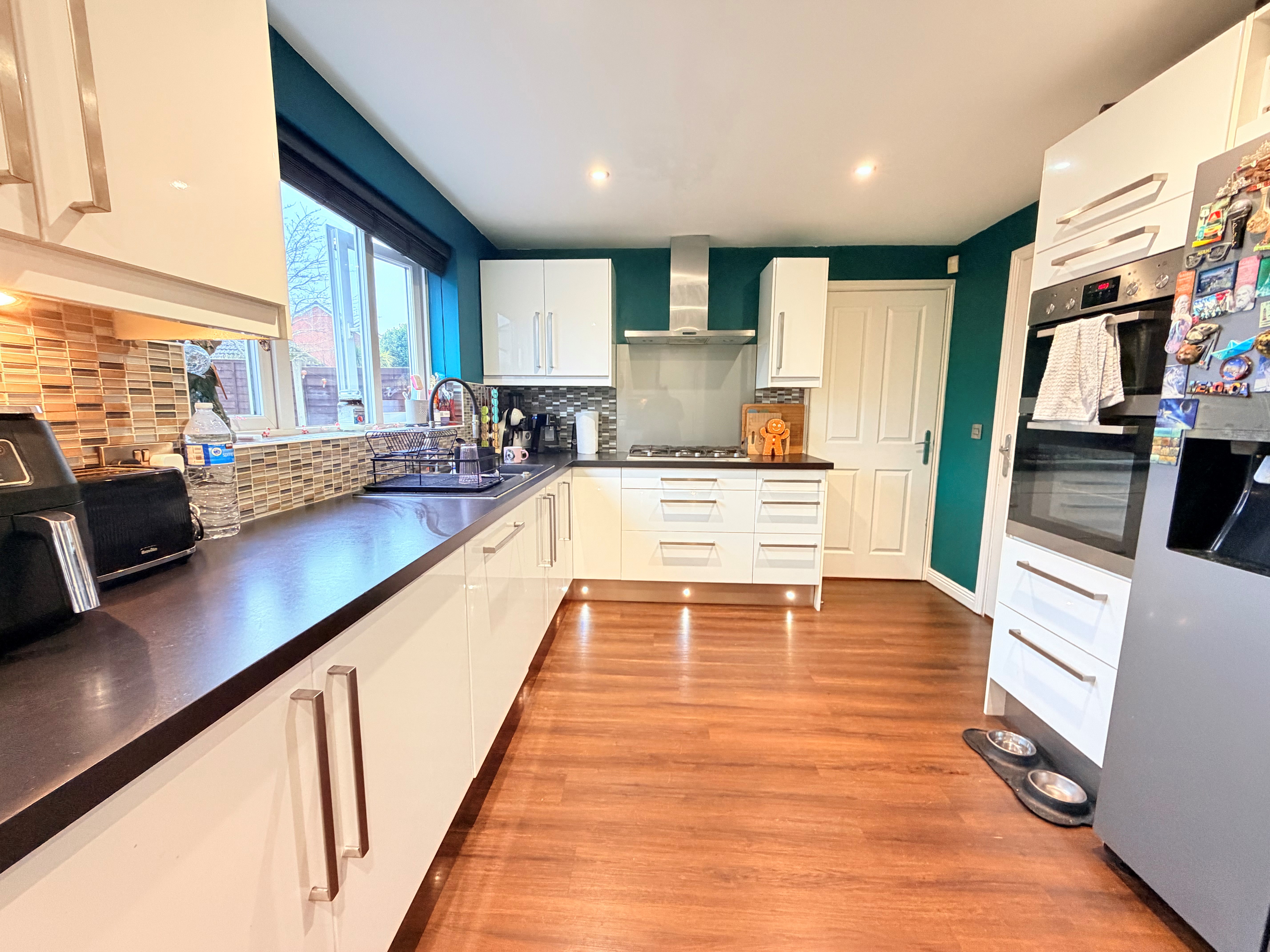 This much improved and beautifully presented detached family home offers generous, versatile accommodation throughout, perfectly suited to modern family living and entertaining. The property is entered via a welcoming entrance hall, which sets the tone for the space and quality found within. From here, you are led into a spacious lounge, a comfortable and inviting room ideal for relaxing, which features doors opening into the dining room. The dining area is flooded with natural light and enjoys PVCu double glazed French doors that open directly onto the rear garden, creating a seamless connection between indoor and outdoor living.