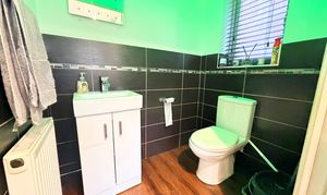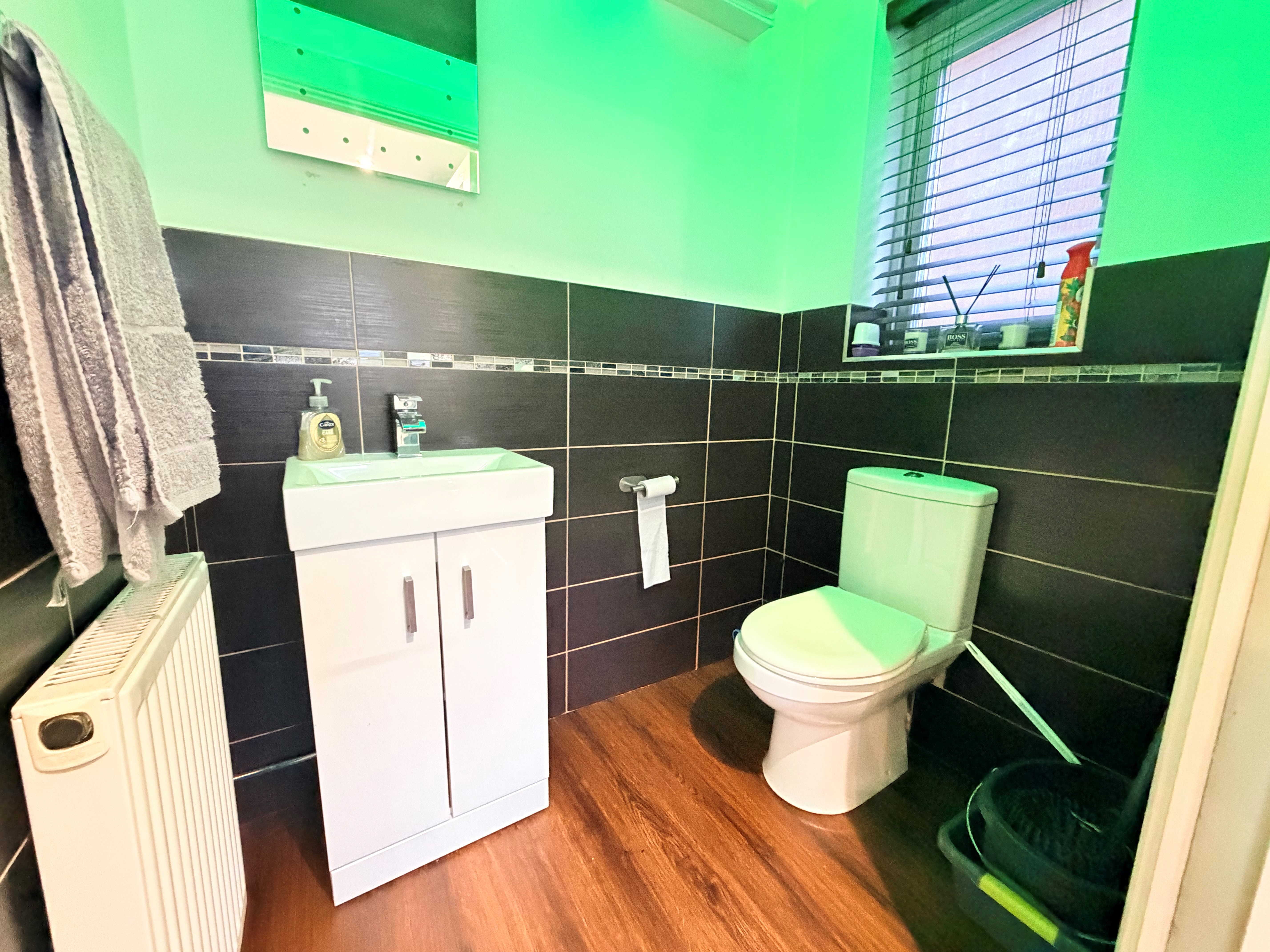The fitted kitchen is both stylish and functional, featuring a contemporary range of high-gloss white eye and base level units, complemented by a selection of integrated appliances making the space ideal for both everyday cooking and entertaining. A refitted cloakroom W.C with a modern white suite completes the ground floor accommodation.