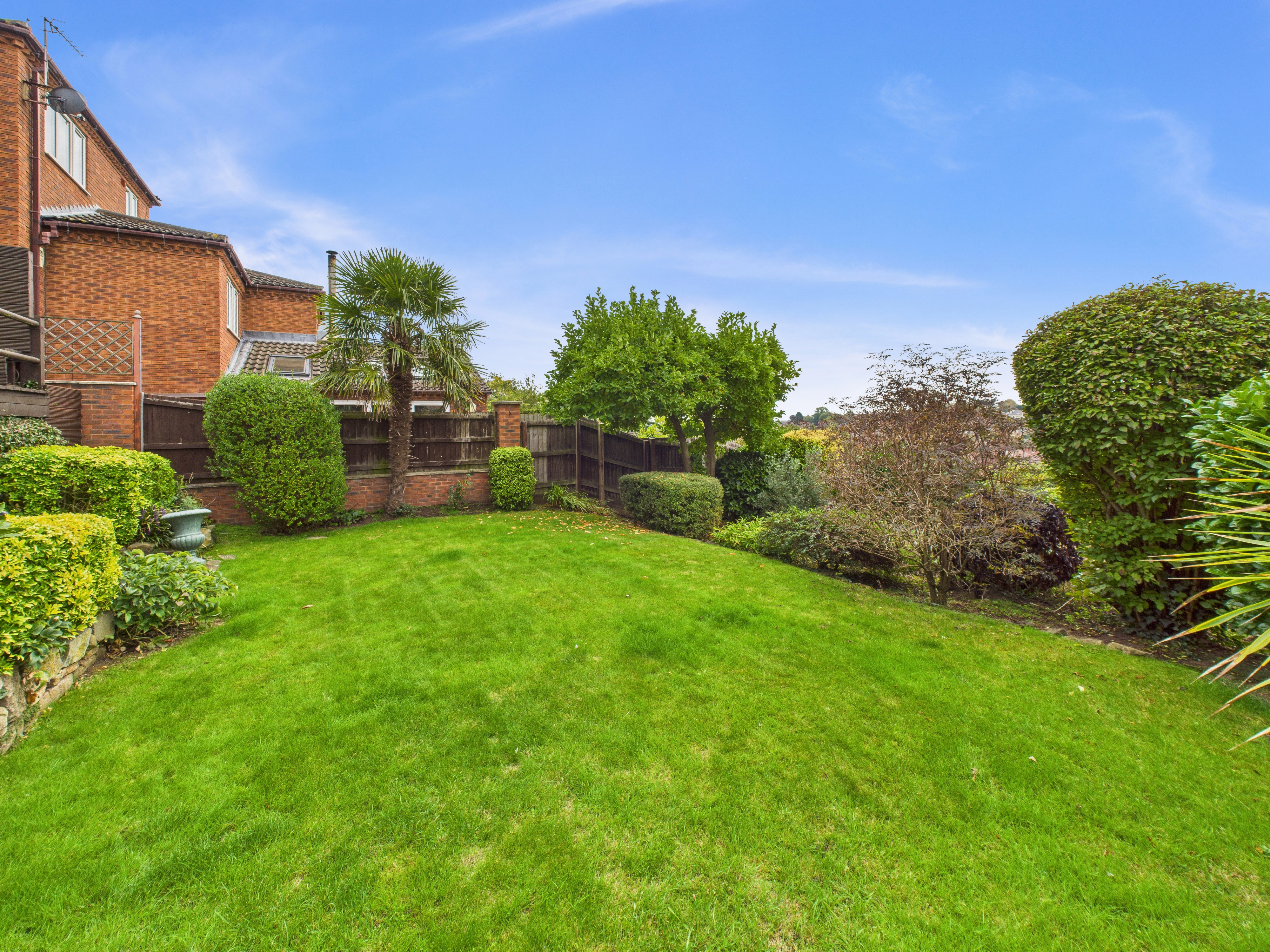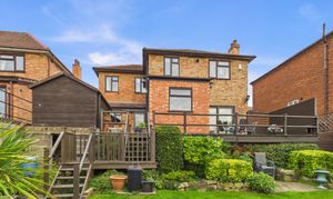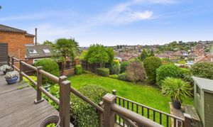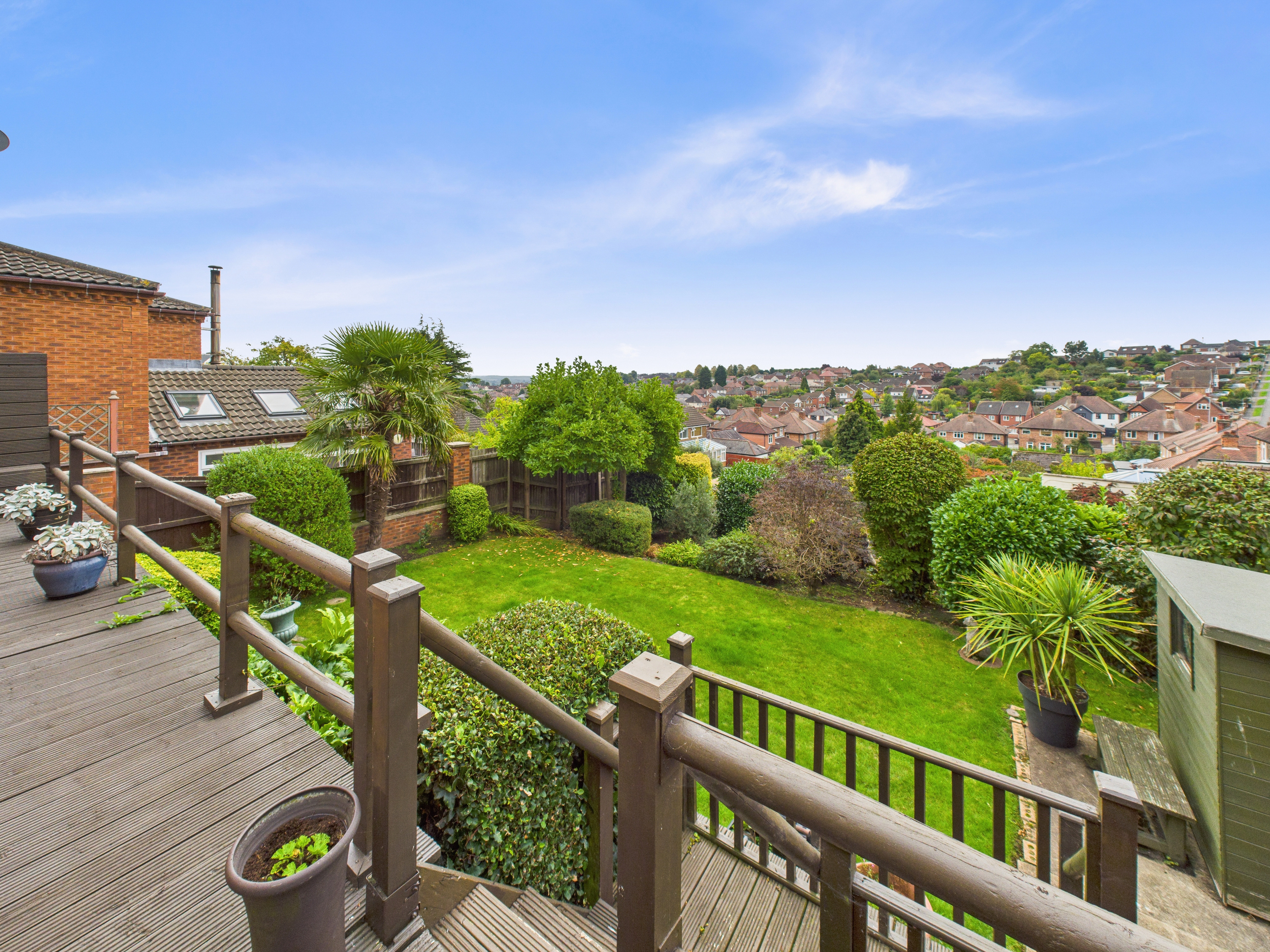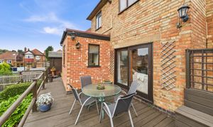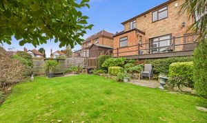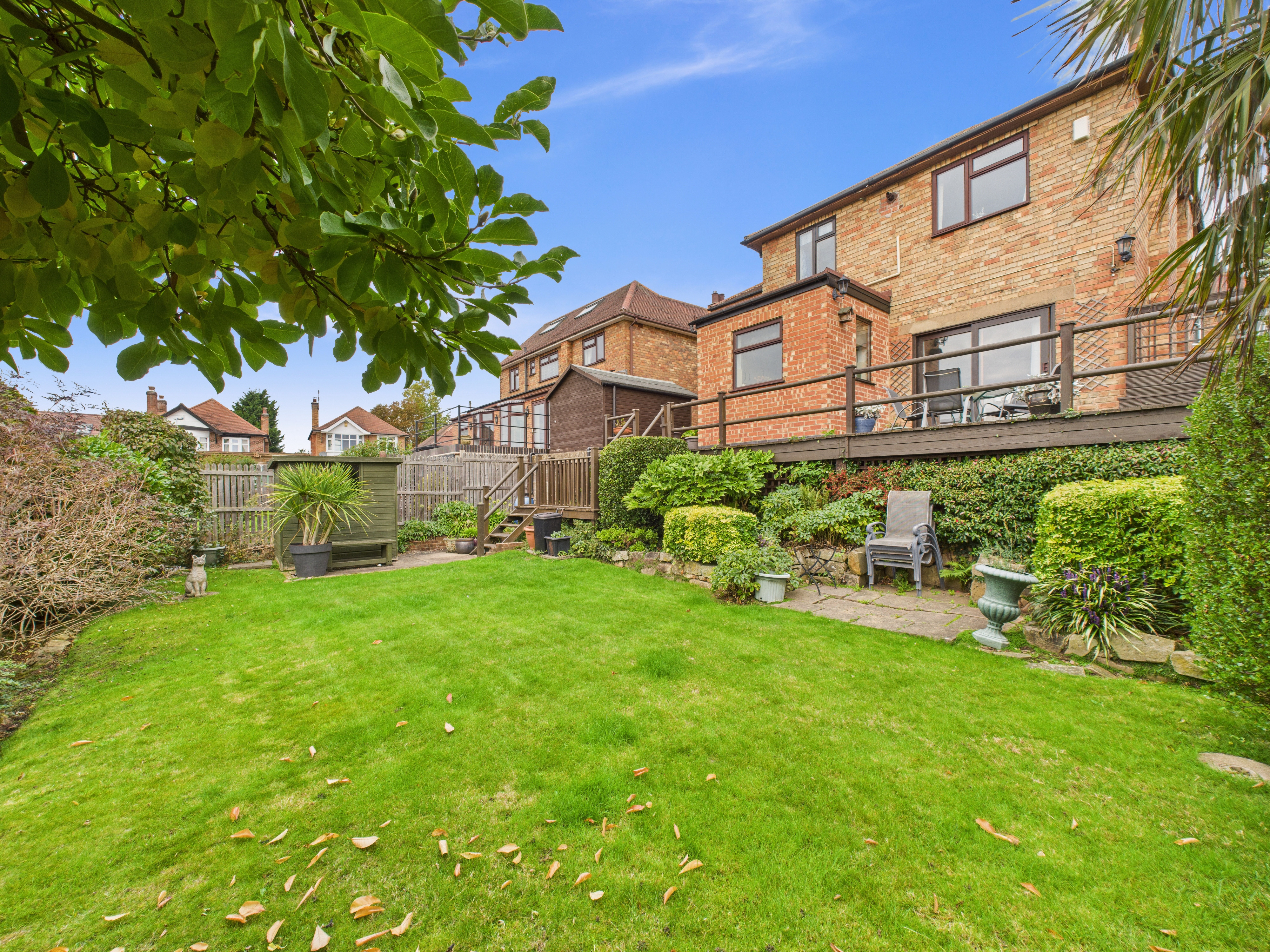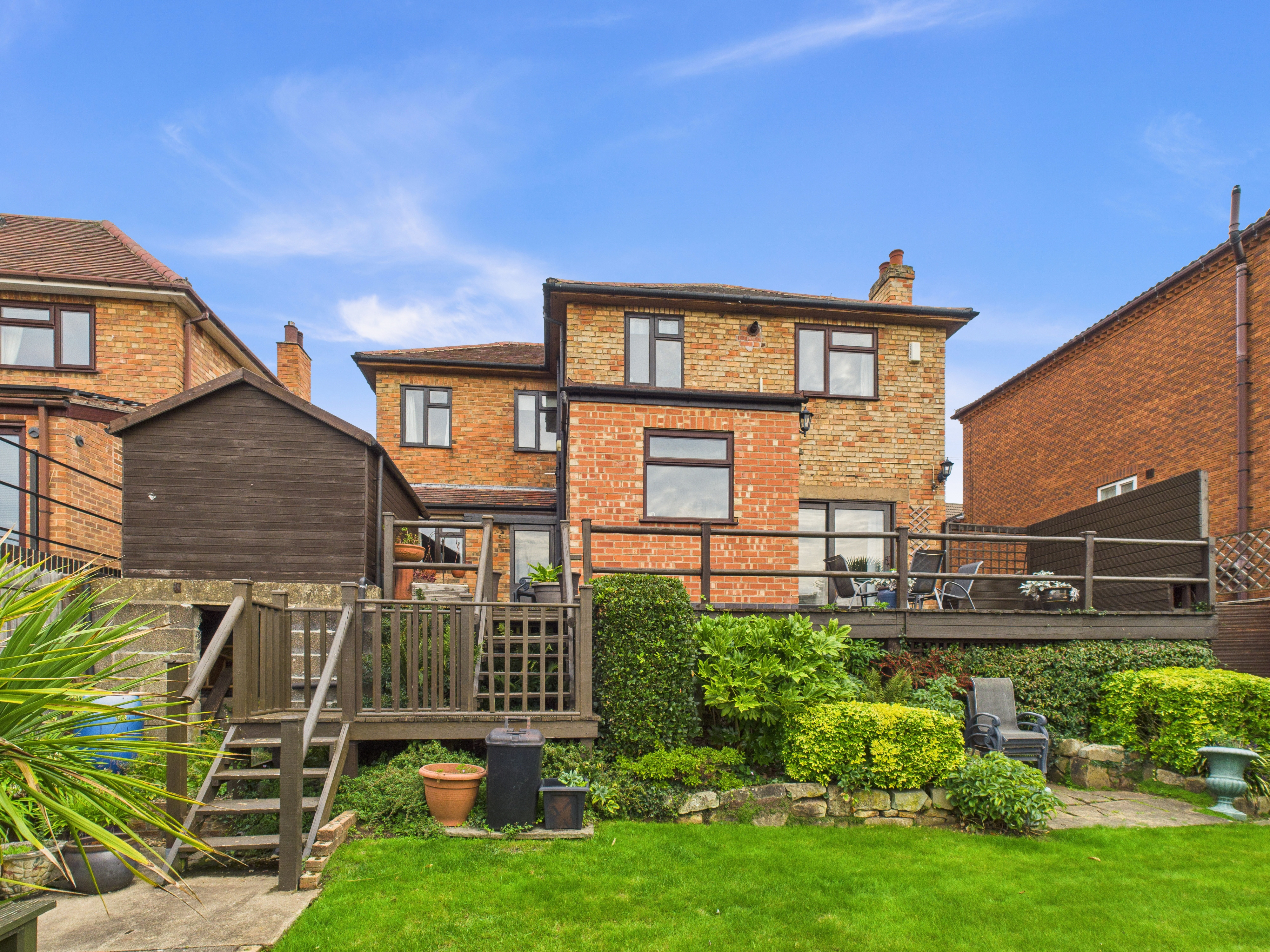 - South-facing rear garden with large, decked seating/dining area, paved seating areas, lawn and established planting