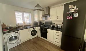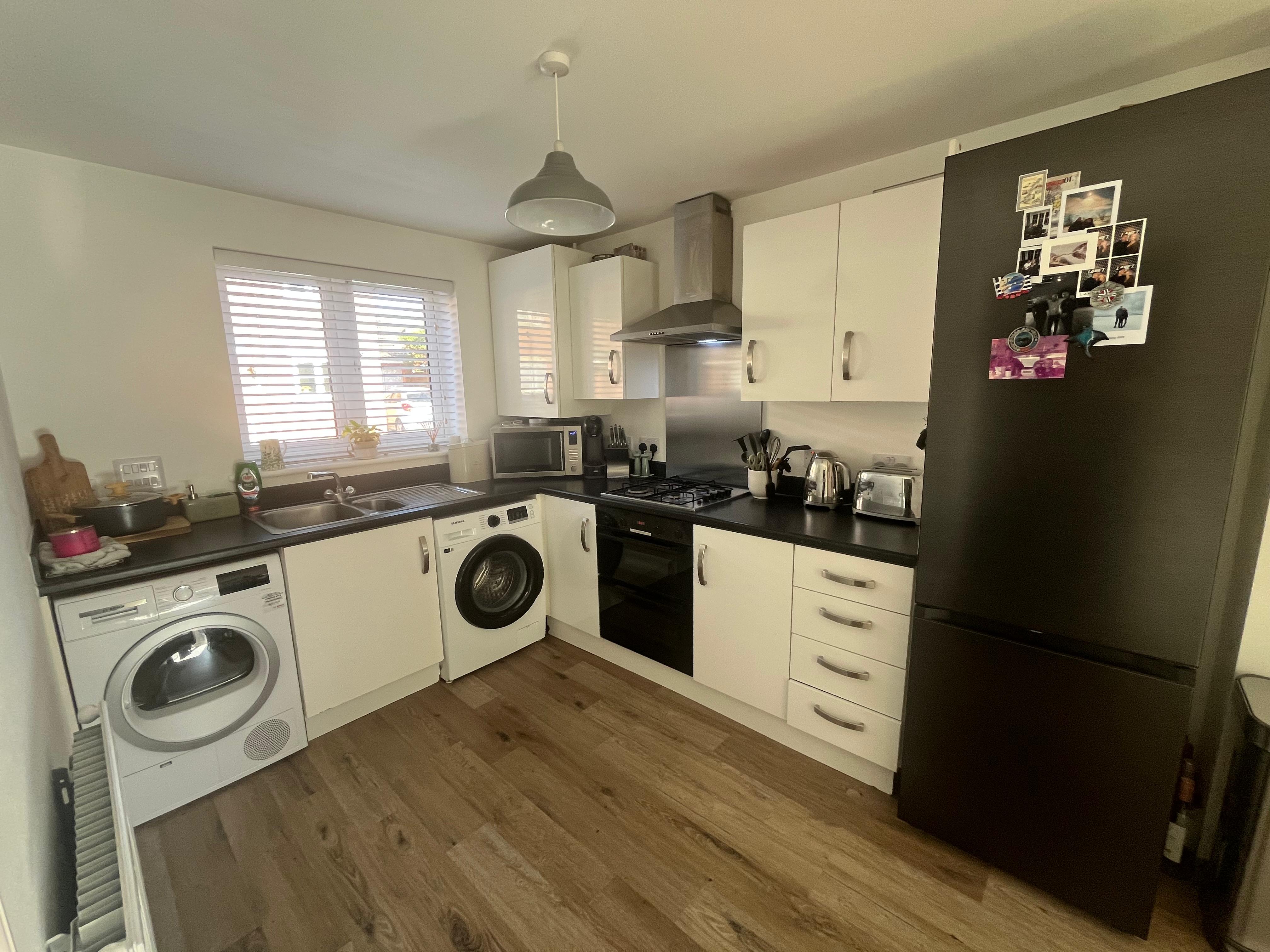 Range of wall, base and drawer units. Stainless steel one and a half bowl sink with mixer tap. Built-in oven and four-ring gas hob with stainless steel splash-back and extractor hood over. Plumbing for washing machine. Space for fridge/freezer and dryer. UPVC double glazed window to the front. Radiator.