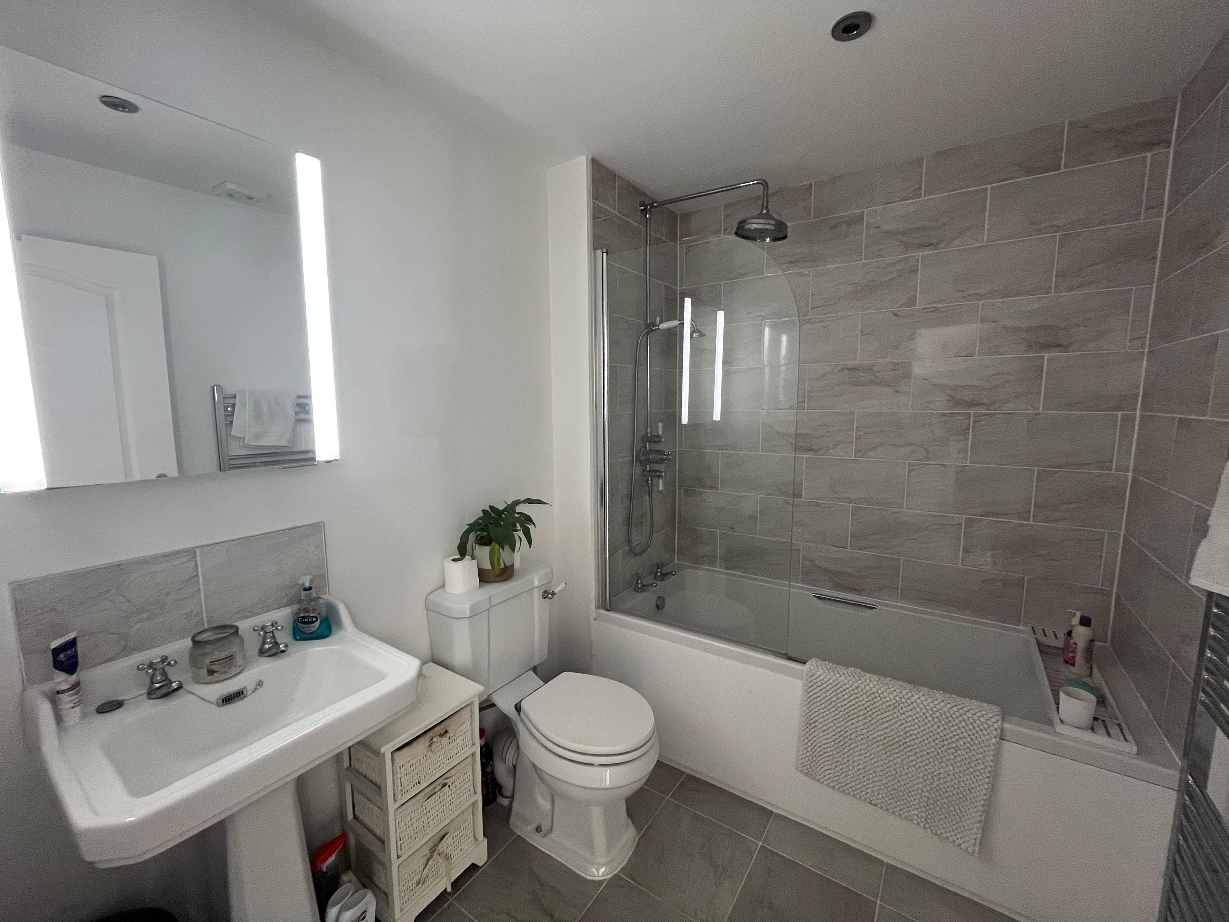Refitted three piece white bathroom suite; WC, sink and bath with rainfall shower over. Shaving point and extractor fan, tiled floor, spotlights, chrome towel rail.