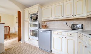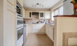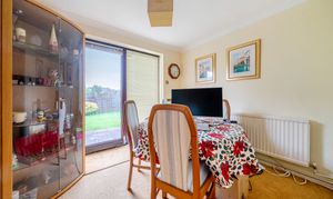 To the right of the hallway, a door opens into the dining area and kitchen. The kitchen, while offering scope for modernisation, remains perfectly serviceable with a good range of units, a double oven, electric hob and space for appliances. The adjoining dining area comfortably fits a table and chairs and has patio doors leading to the rear garden.