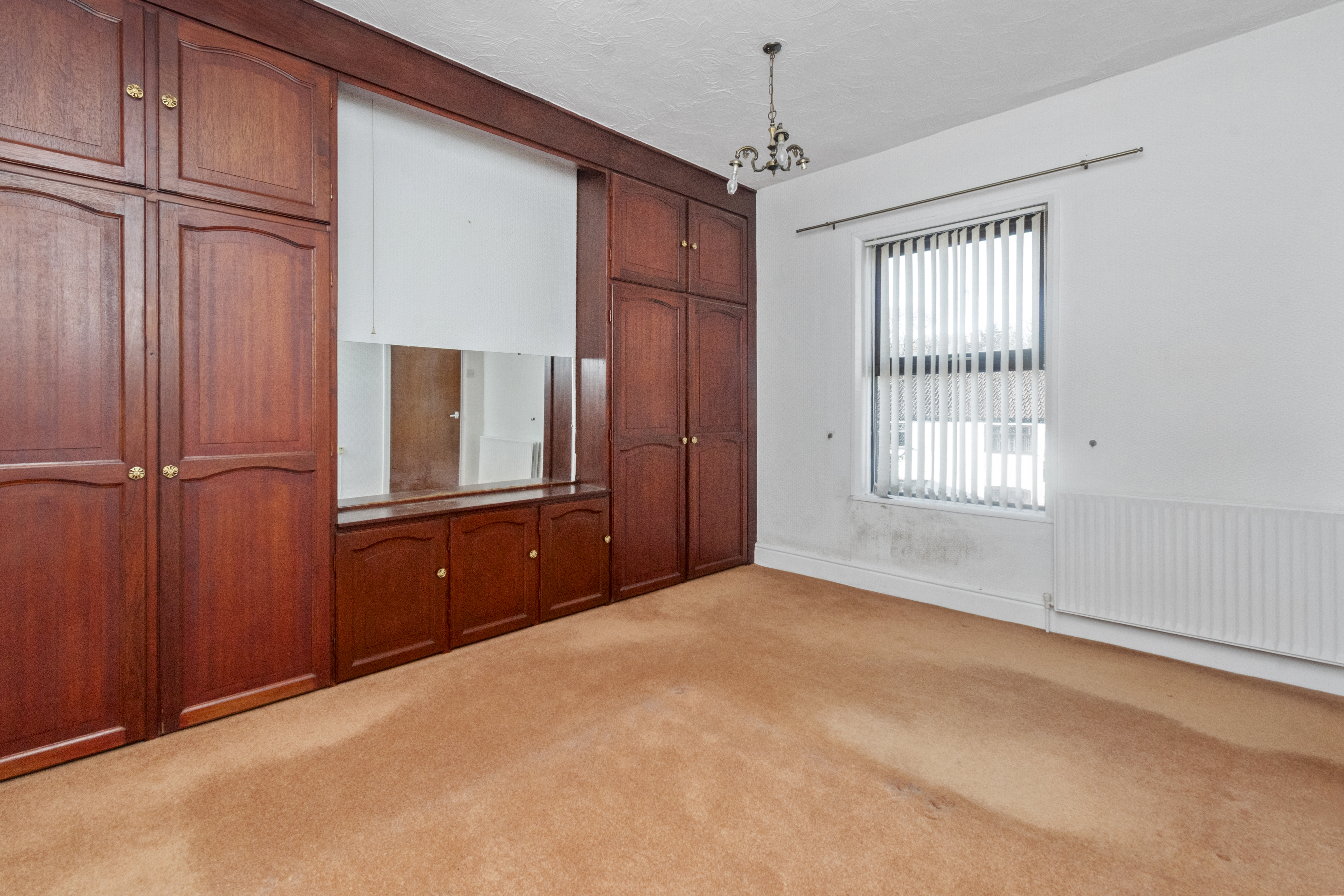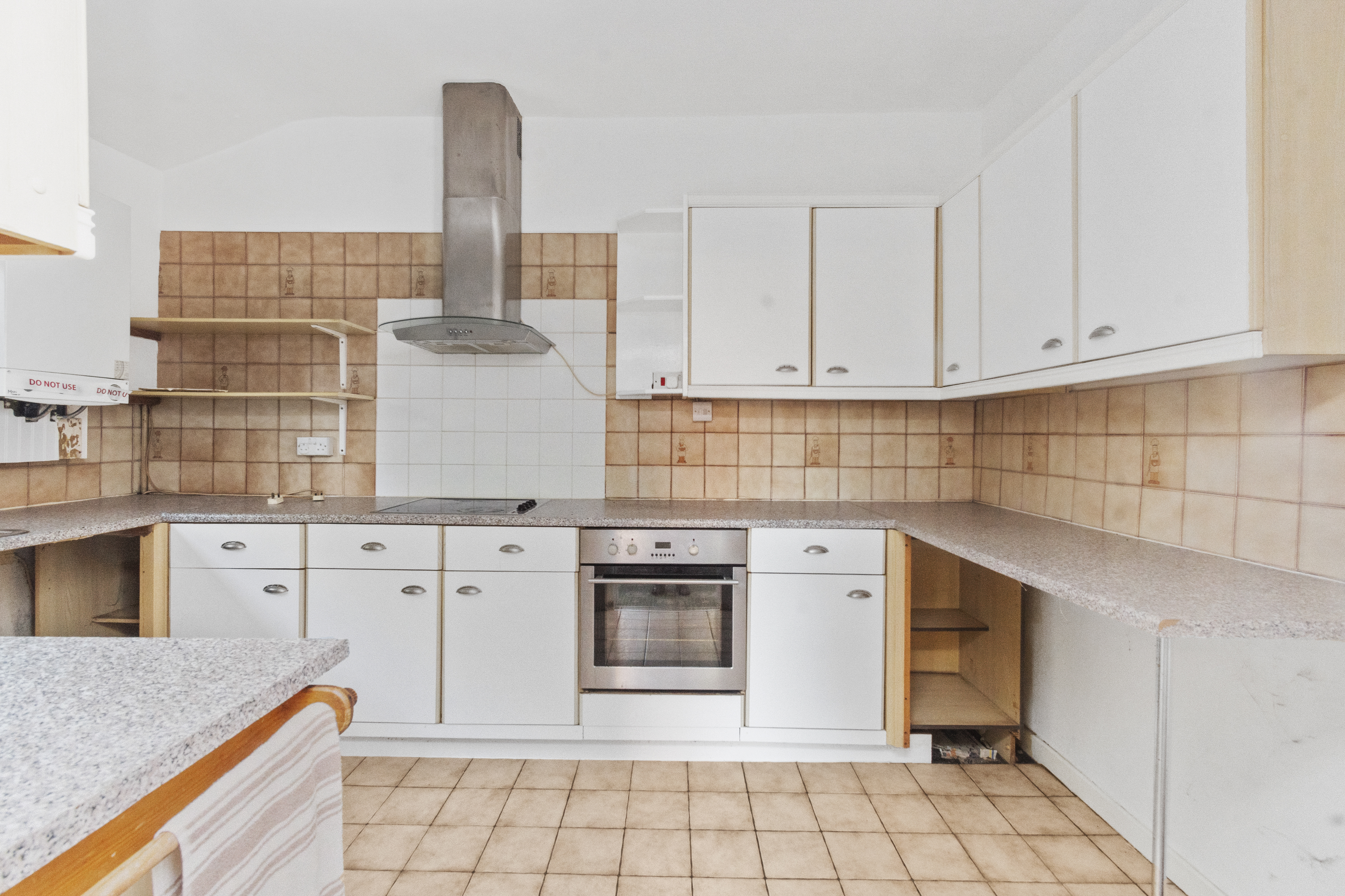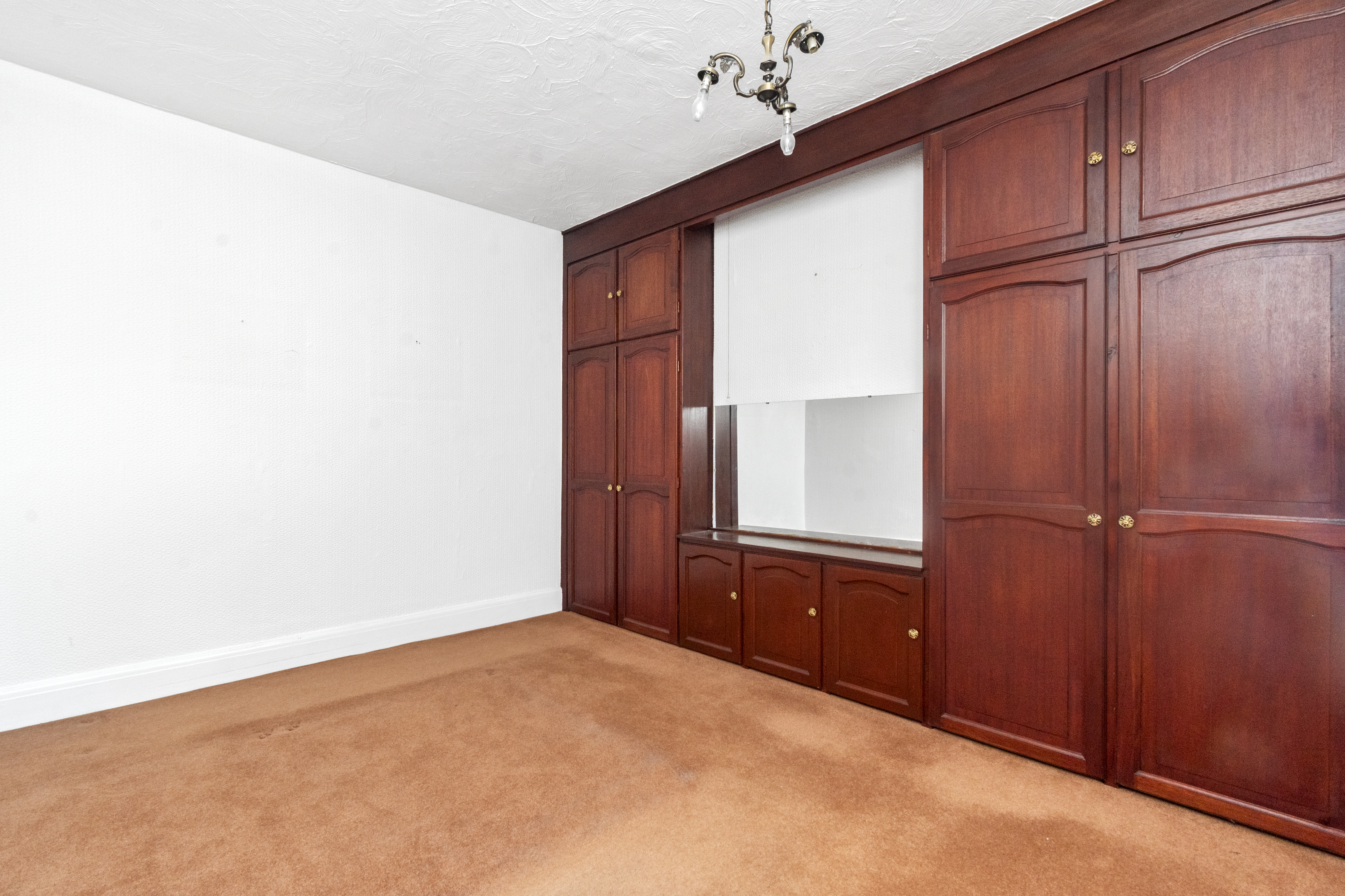 The kitchen, fitted with integrated appliances including an oven, electric hob and extractor fan, offers ample worktop and storage space and could be transformed into a stylish contemporary cooking and dining area. All three bedrooms benefit from built-in wardrobes and fitted cabinetry, providing excellent storage solutions. The bathroom currently features a walk-in shower with glass doors and white tiling, offering a solid base for updating to a modern standard.