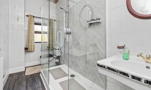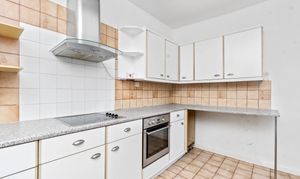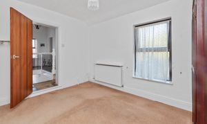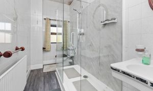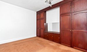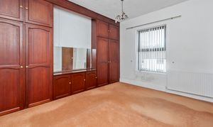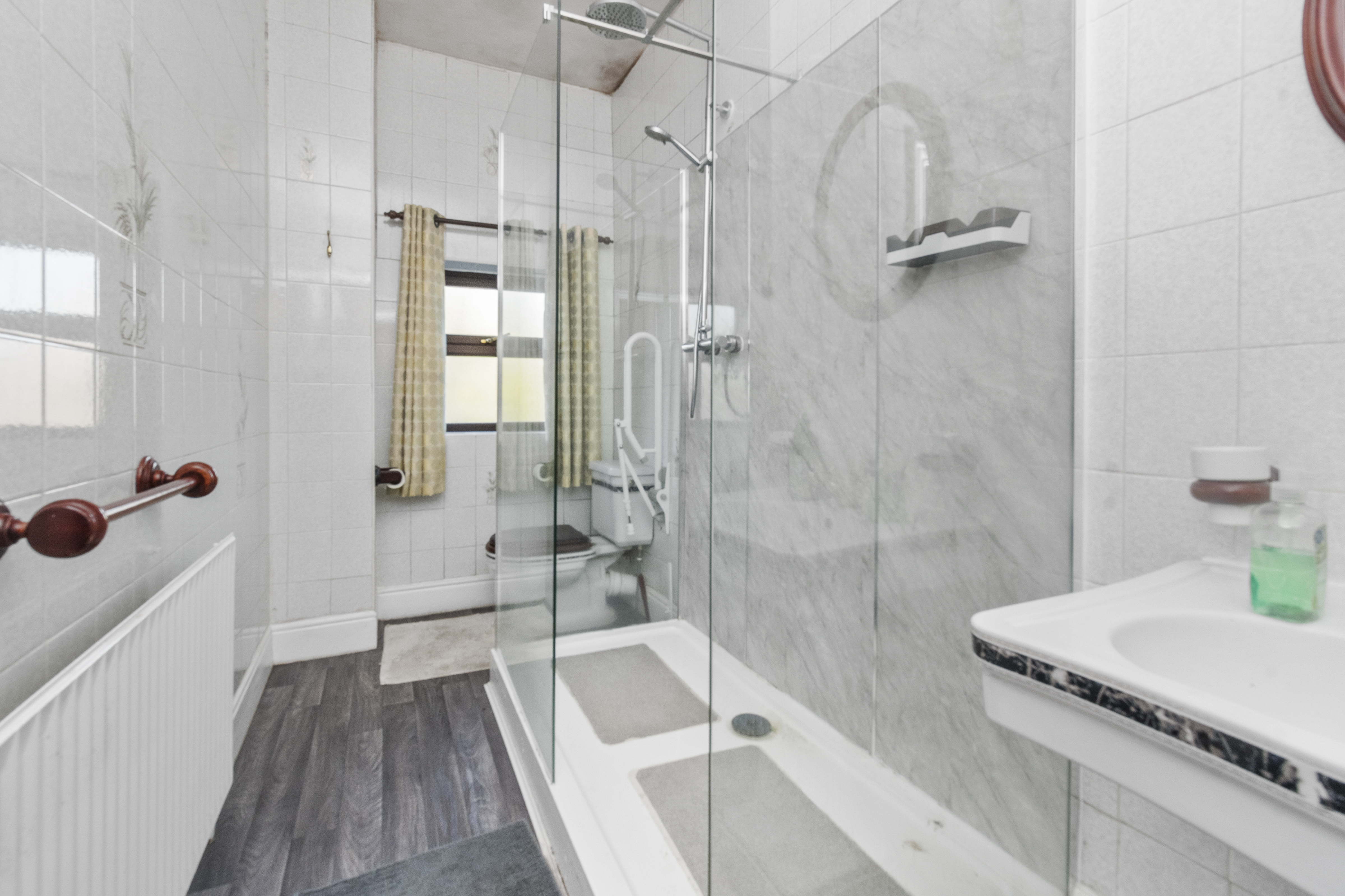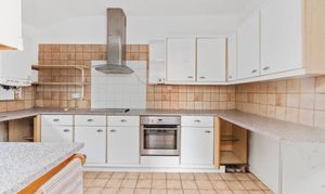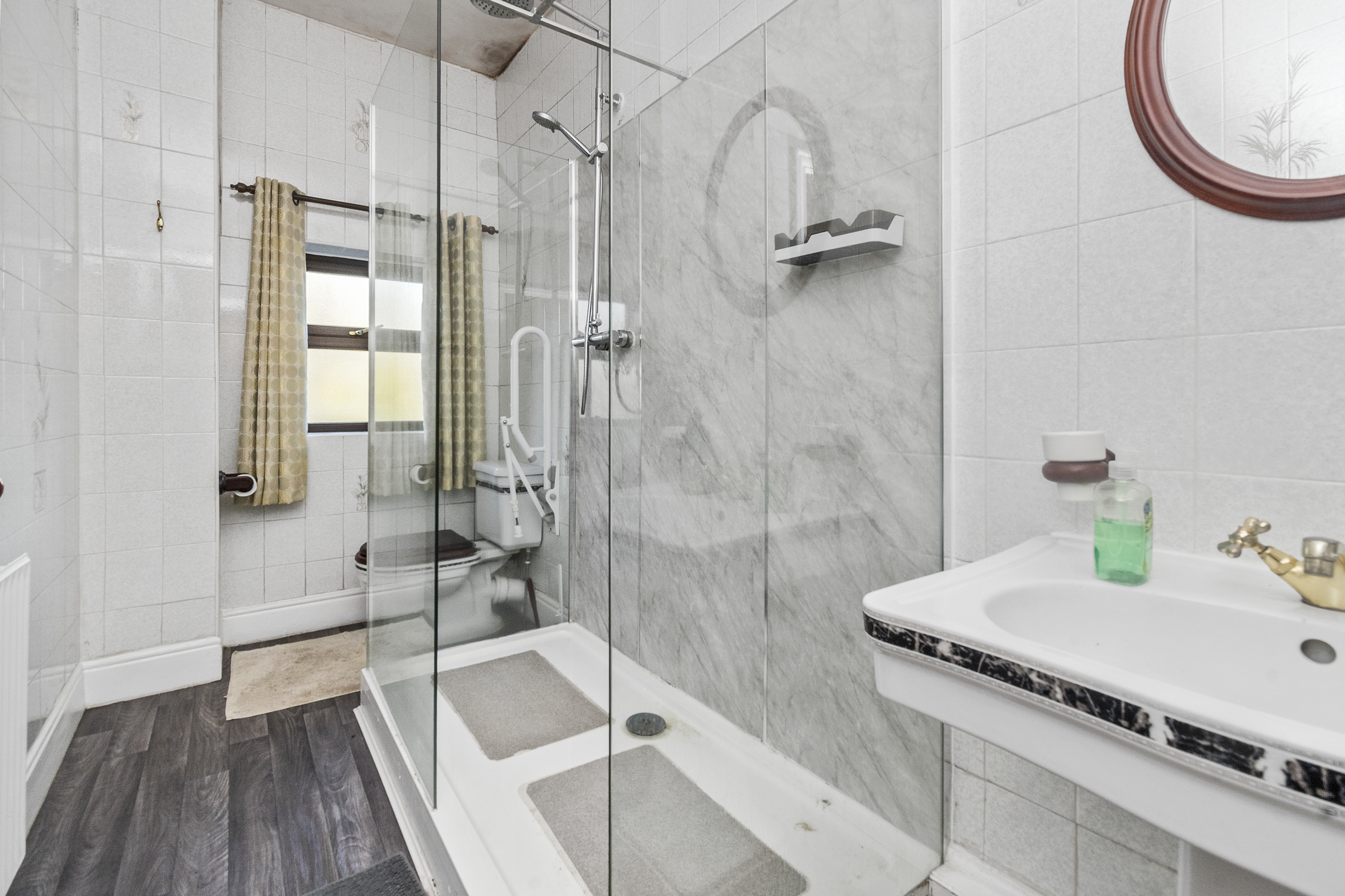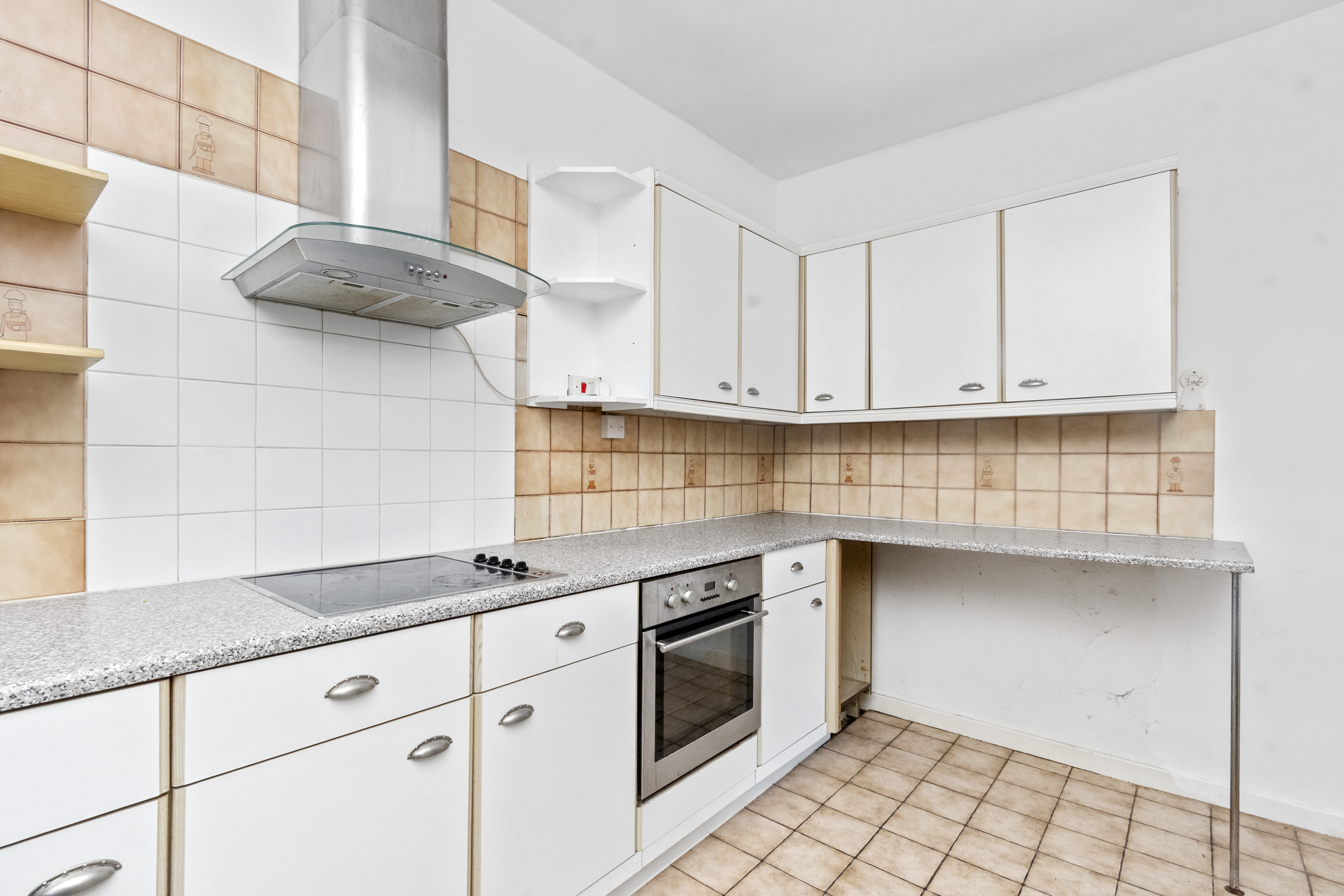 The kitchen, fitted with integrated appliances including an oven, electric hob and extractor fan, offers ample worktop and storage space and could be transformed into a stylish contemporary cooking and dining area. All three bedrooms benefit from built-in wardrobes and fitted cabinetry, providing excellent storage solutions. The bathroom currently features a walk-in shower with glass doors and white tiling, offering a solid base for updating to a modern standard.
