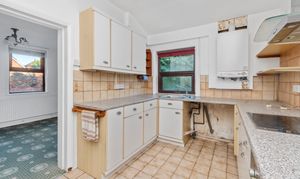 This three-bedroom, one-bathroom detached home offers excellent potential for buyers looking to create a property tailored to their own taste. While the house requires modernisation throughout, it provides a generous and versatile layout ideal for comfortable family living. The spacious reception room features an attractive exposed brick fireplace, high ceilings and chandelier lighting, offering a characterful focal point and plenty of scope for refurbishment. Large windows flood the home with natural light, enhancing the sense of space across all rooms.