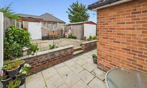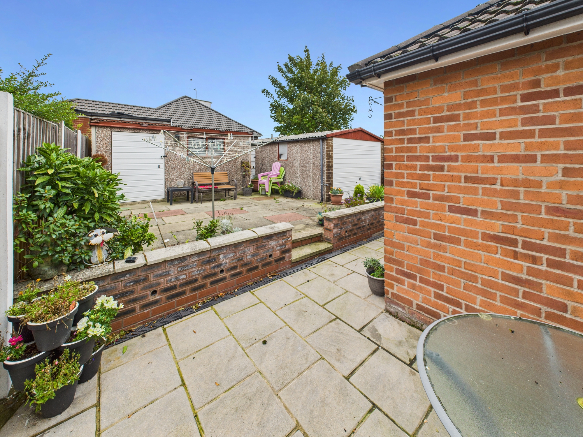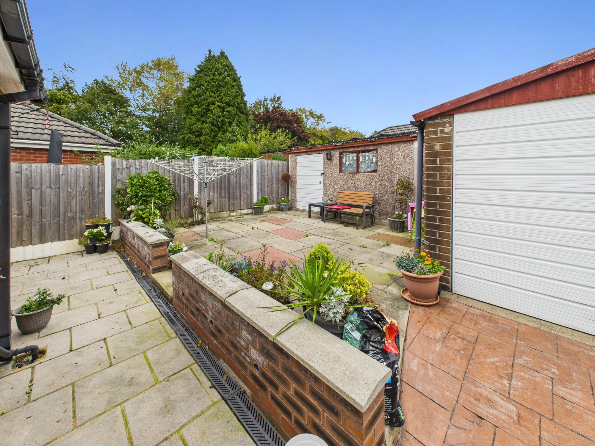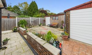 Low maintenance rear garden with detached garage and a second detached building used as a workshop