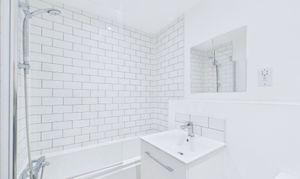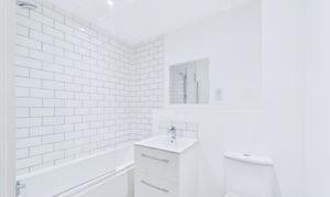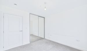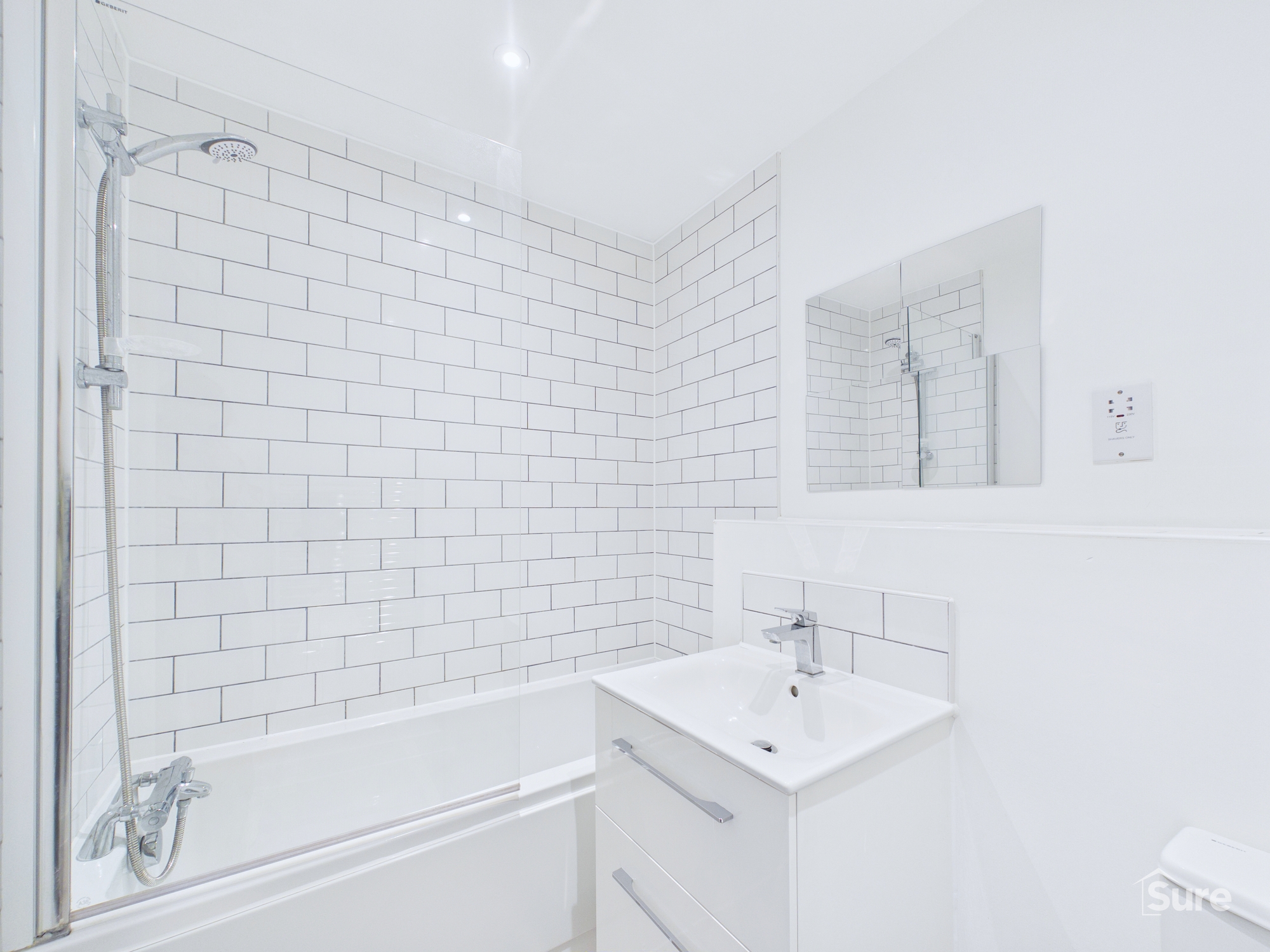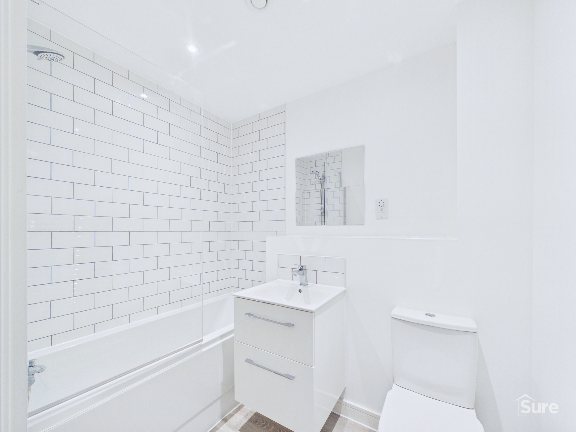 The spacious bedroom is well-proportioned, offering ample room for furnishings, while the modern bathroom is fitted with a shower over the bath, wash hand basin, and low-level WC.