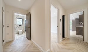 Finished with elegant herringbone flooring, the apartment showcases a contemporary aesthetic that complements its practical design. With allocated parking and EV charging stations, this home caters perfectly to modern lifestyles.