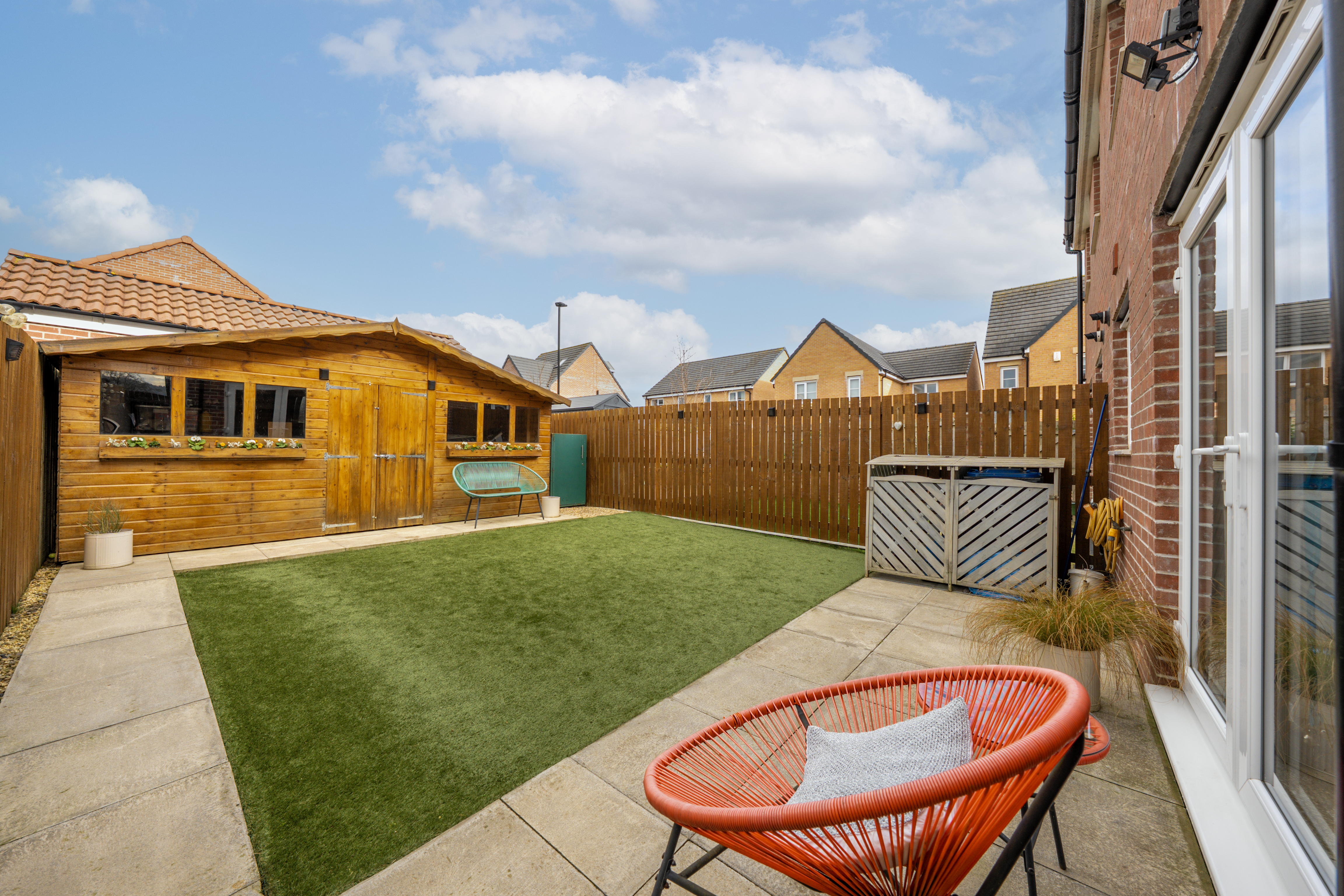 Landscaped & enclosed rear garden laid to turf with path wrapping around to the front, and timber outbuilding.