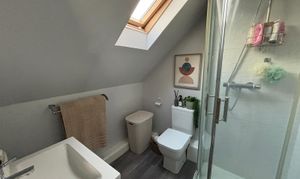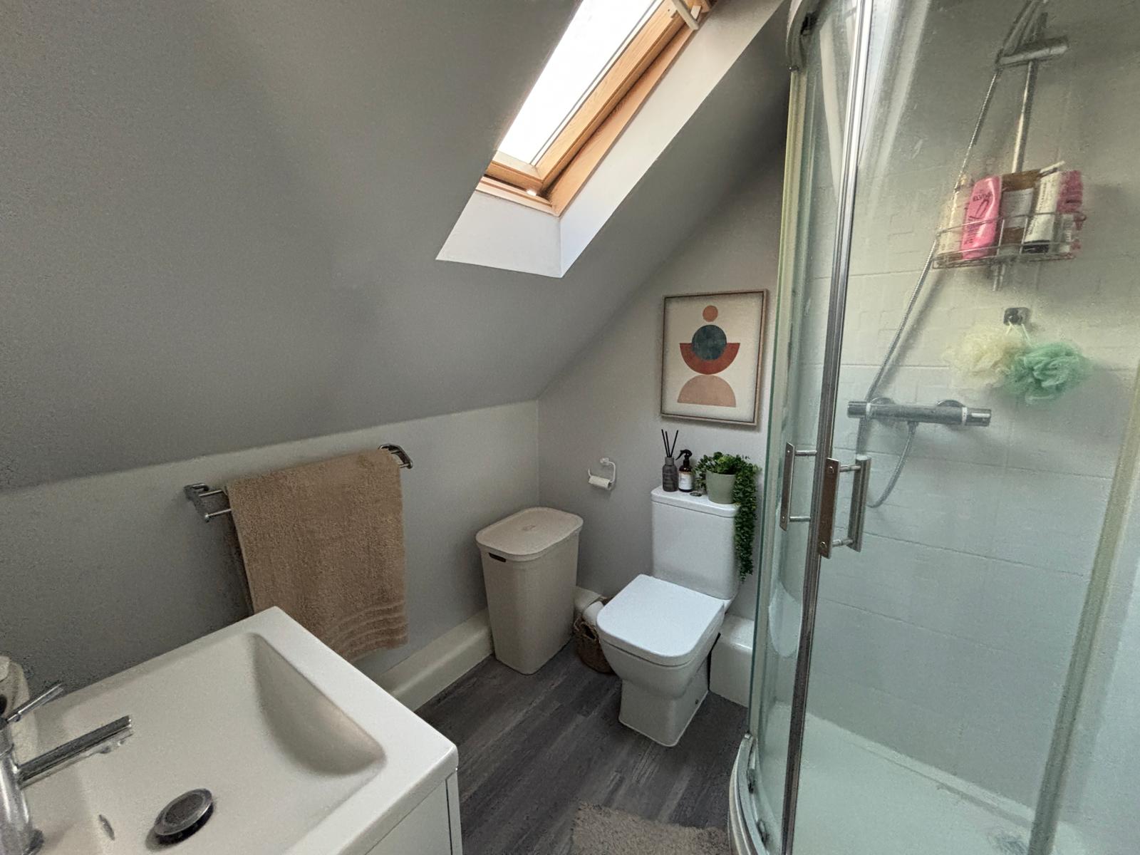 Double glazed velux window to rear, single shower cubicle, low level wc and wash hand basin