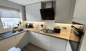 Double glazed window to front, range of wall and base units with work surface over, gas hob and oven, integral white goods.