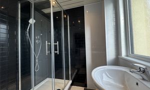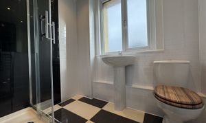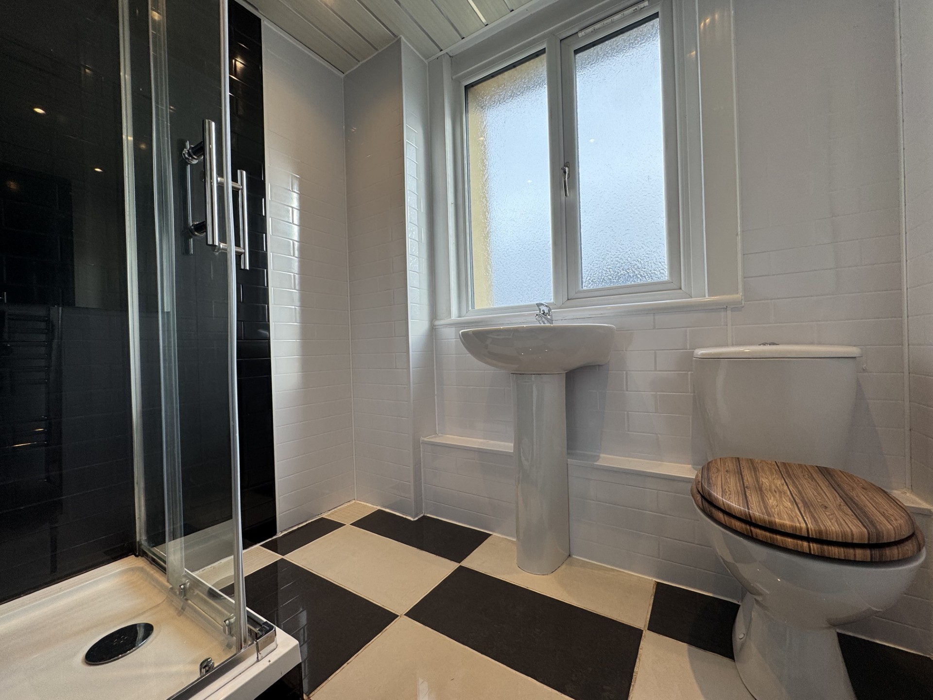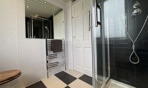 Completing the ground floor is a stylish three-piece shower room with vanity storage, mains shower, heated towel rail, and contemporary tiling.