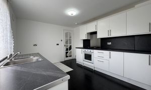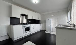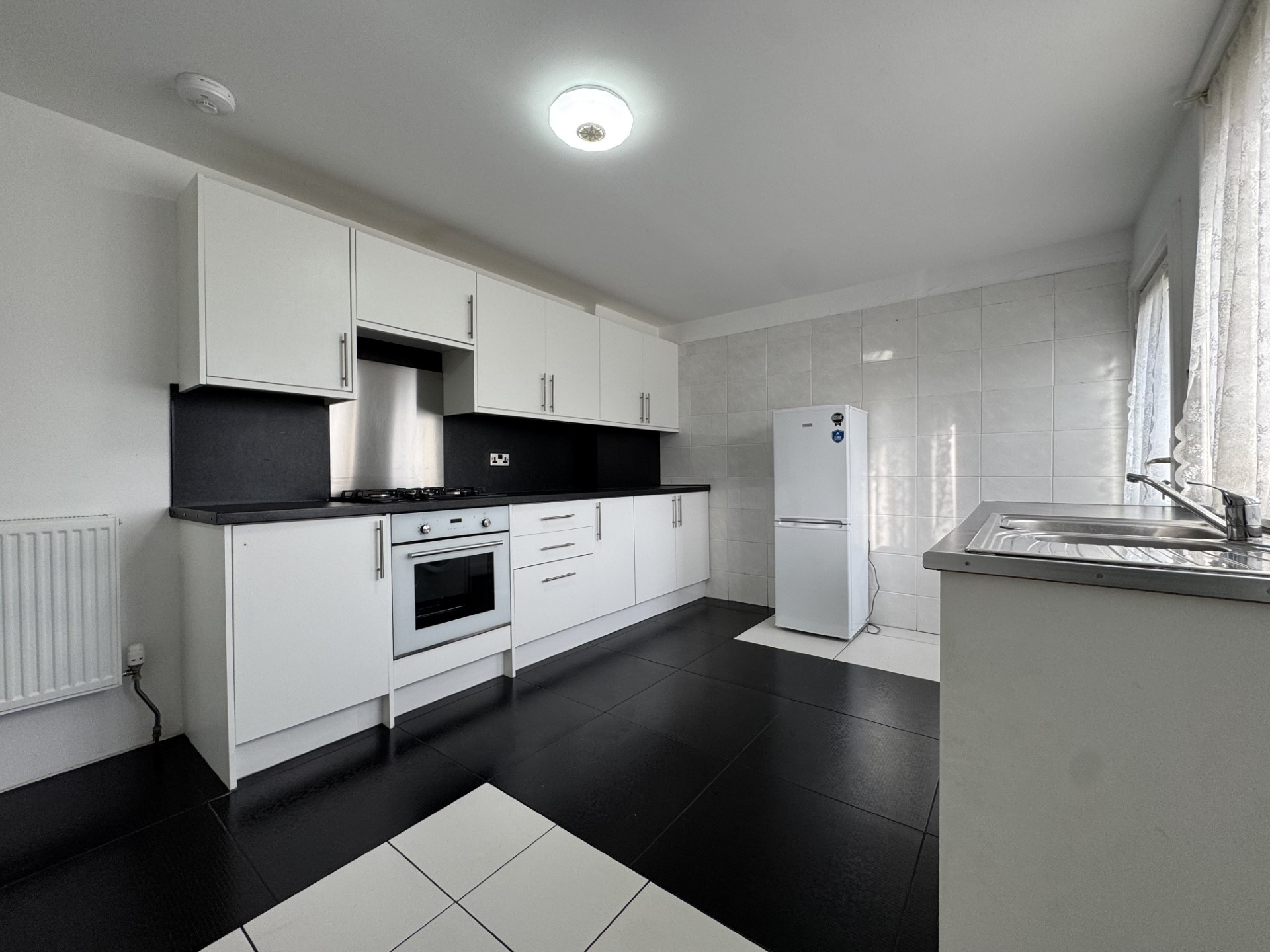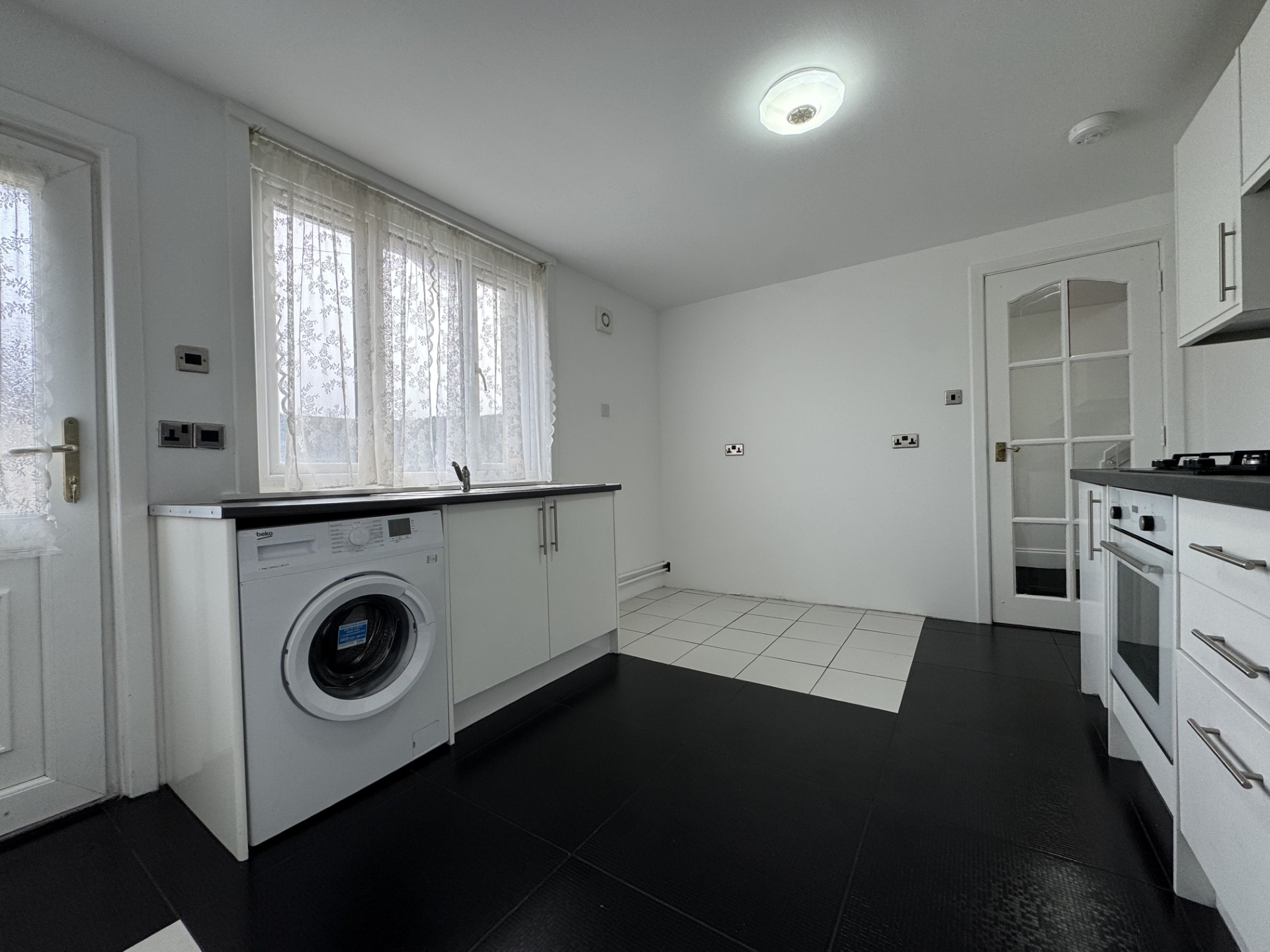 The well-equipped kitchen offers a comprehensive range of wall and floor-standing units with complementary worktops and splashback. Appliances include a four-ring gas hob with extractor hood, oven/grill below, freestanding fridge freezer, and washing machine. There is also ample space for a dining table and chairs. A rear PVC door provides direct access to the fully enclosed, low-maintenance garden.