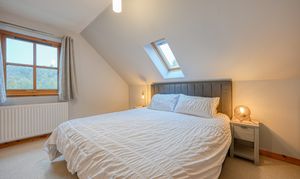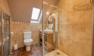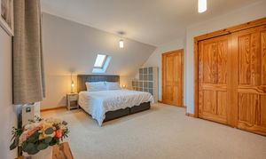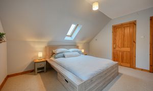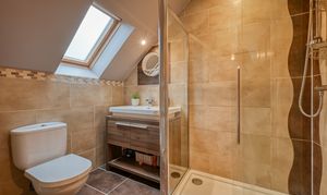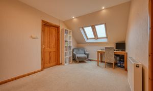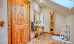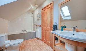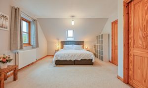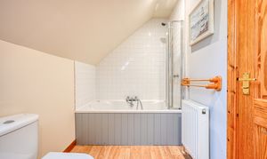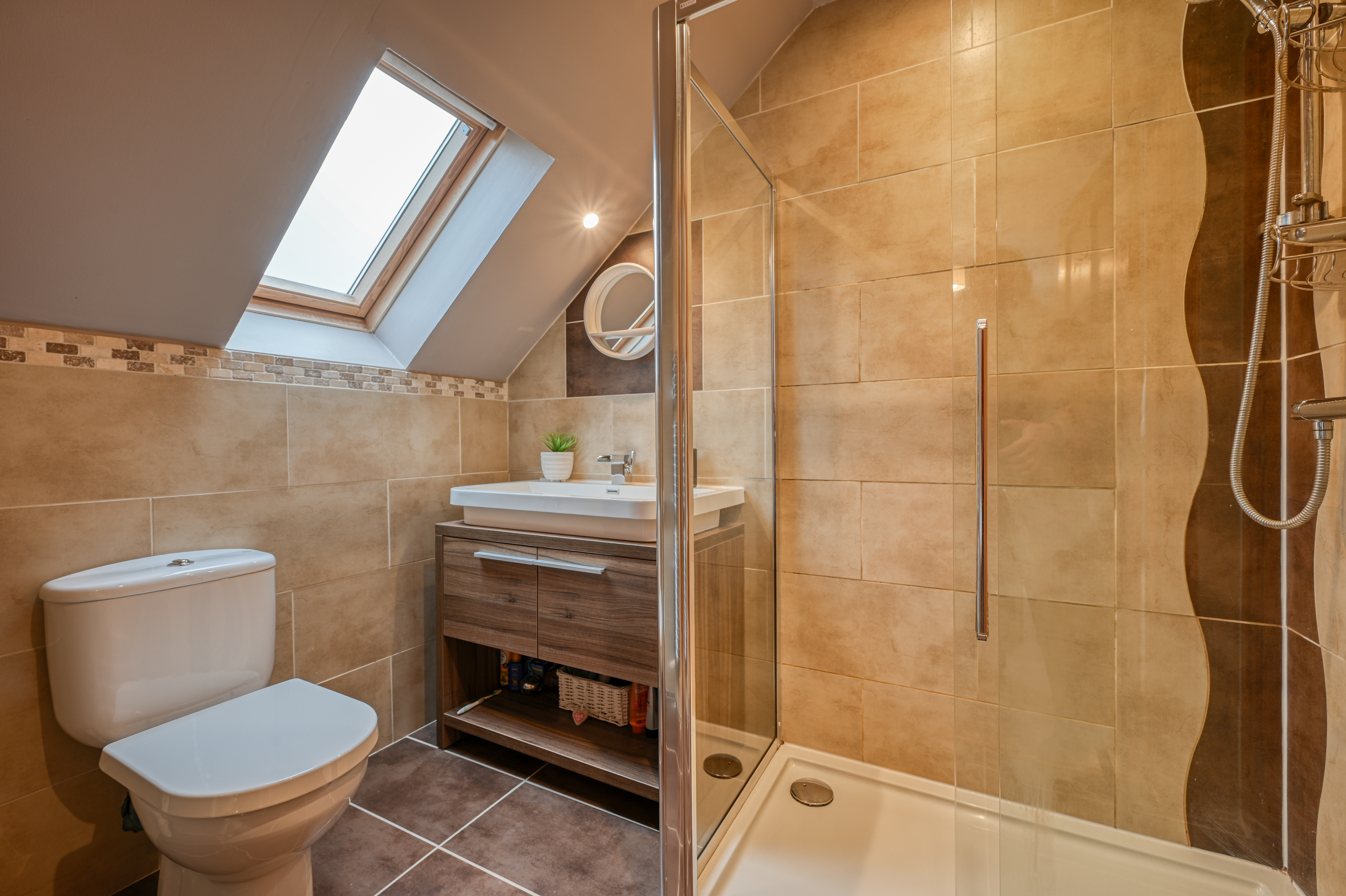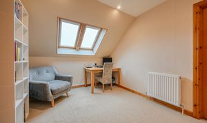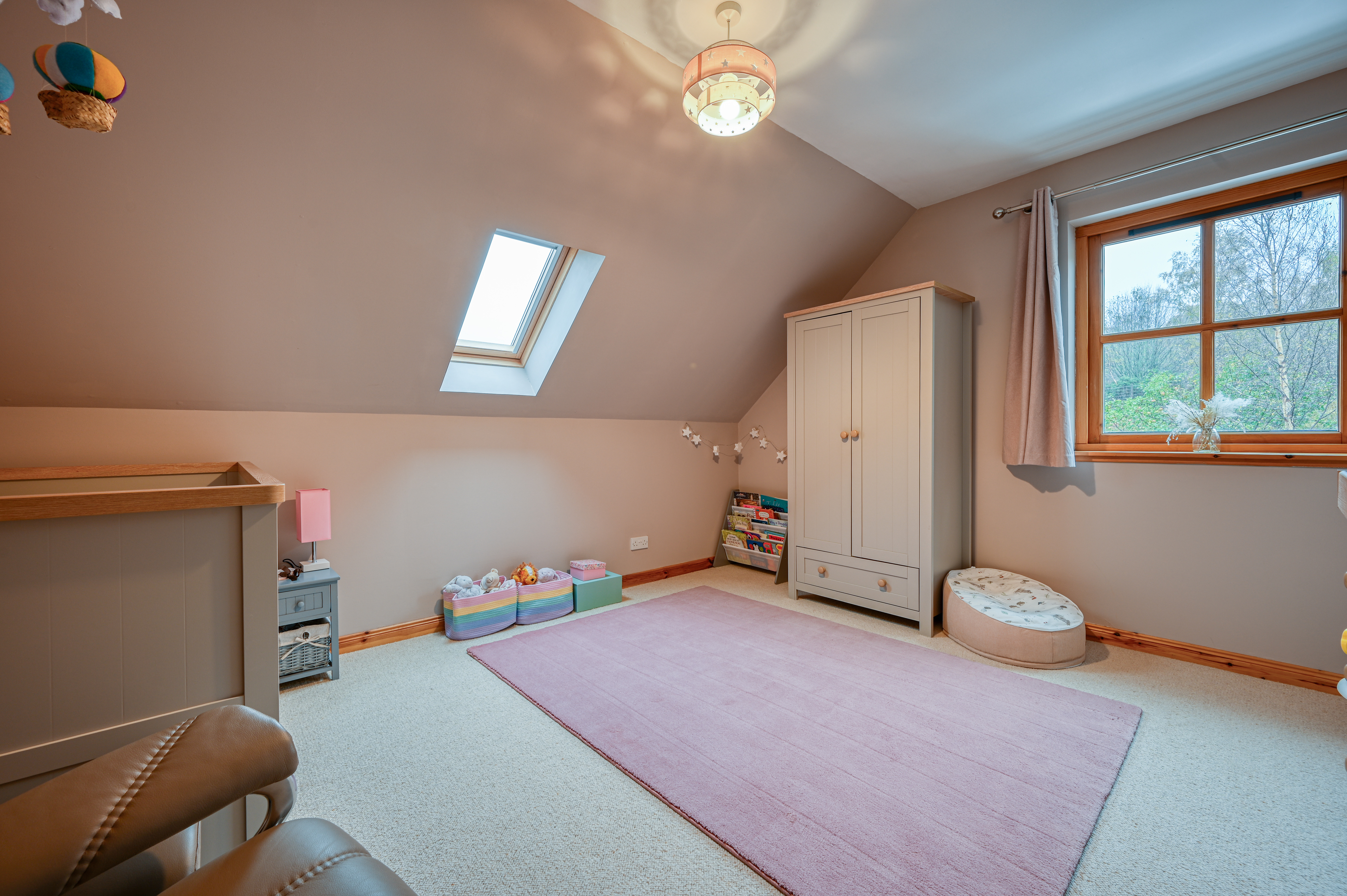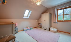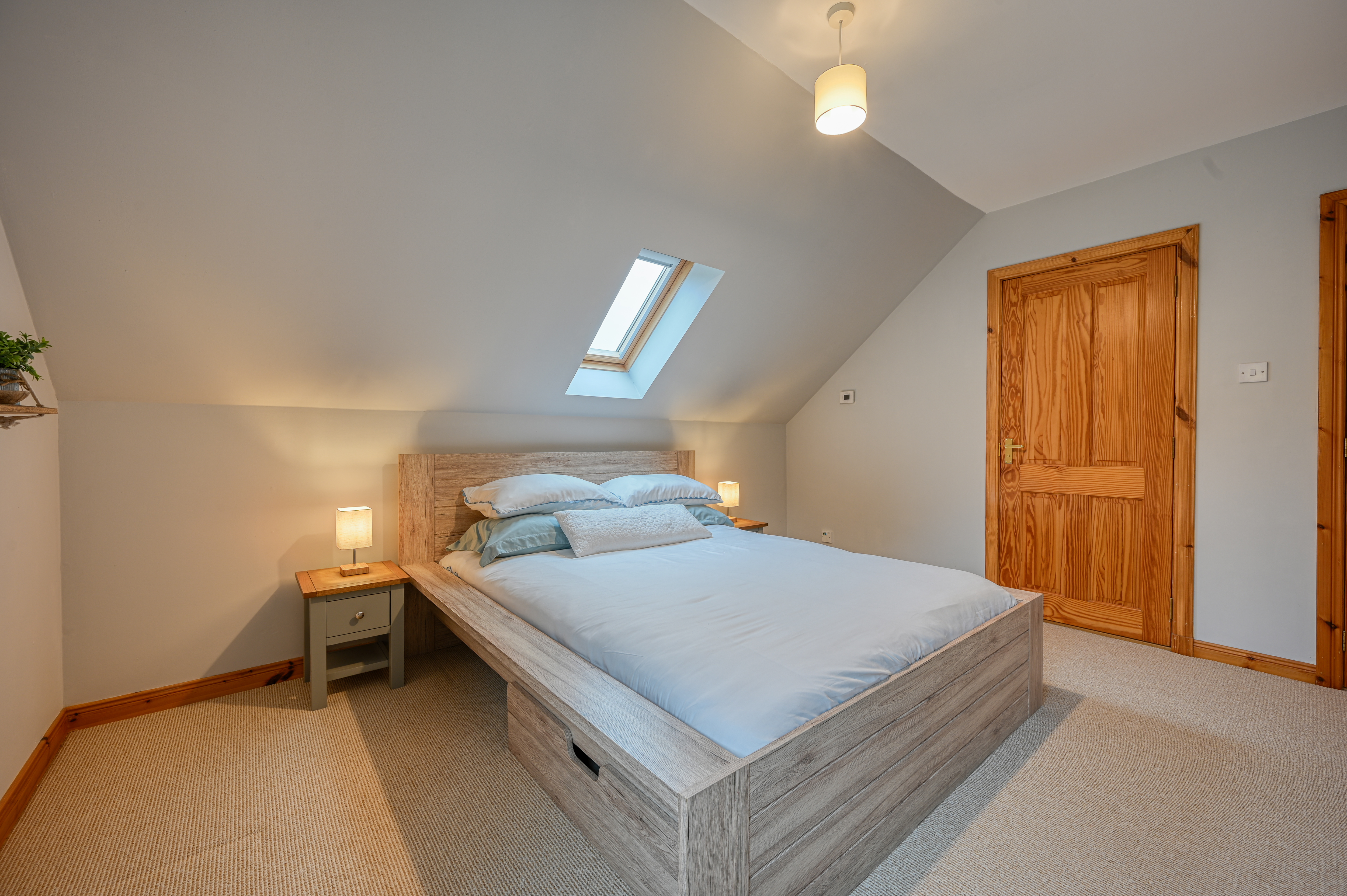 Two additional bedrooms are elegantly styled in soft, neutral colours, both with coombed ceilings, large windows, and skylights that flood the rooms with light. One of the bedrooms has direct access to the family bathroom, which features striking contemporary décor, a bath with shower over, WC, and basin.