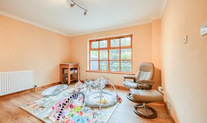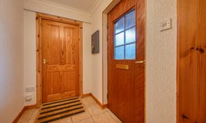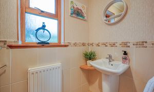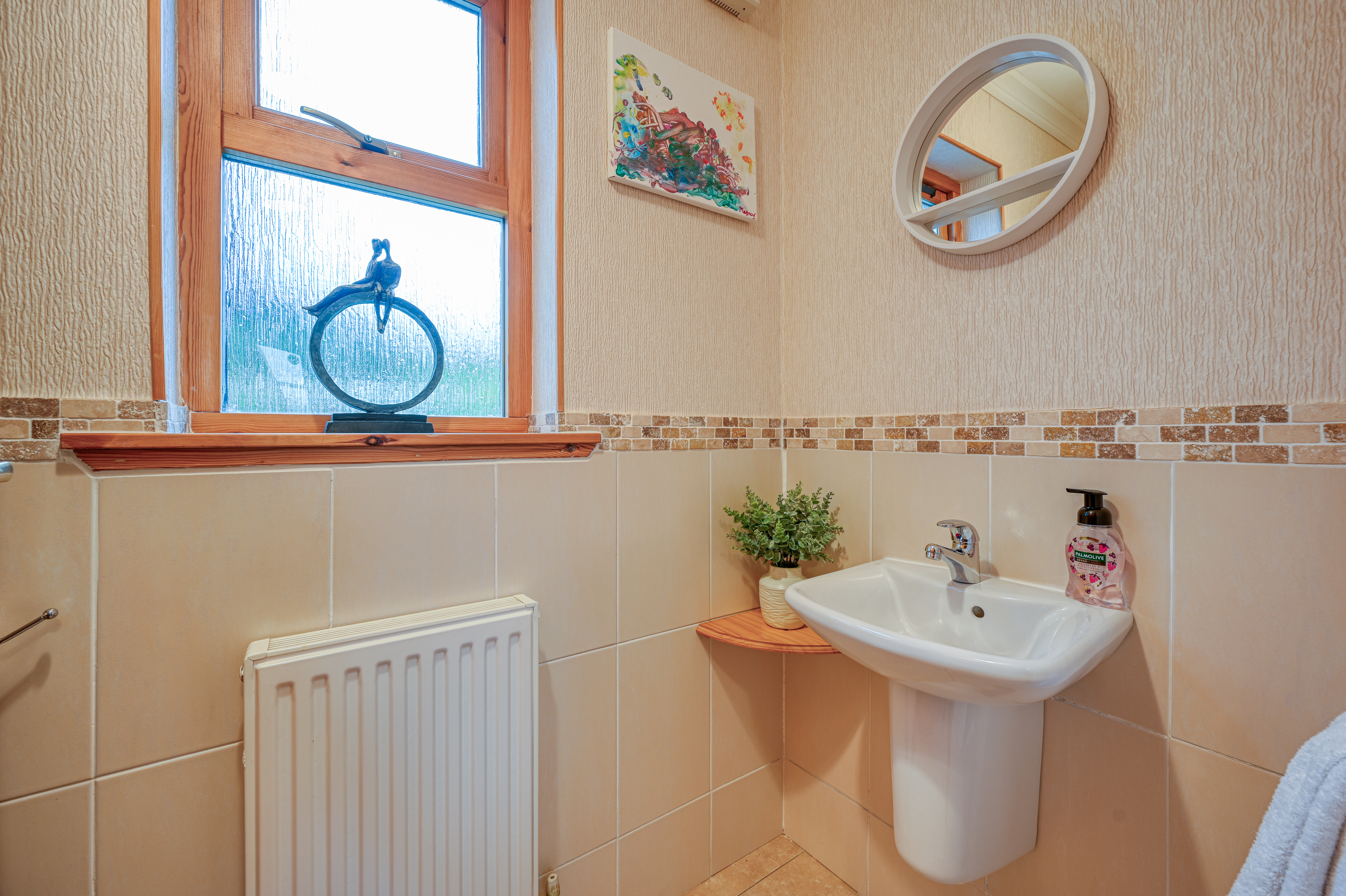 A small inner hallway accommodates the main entrance and a cloakroom with WC and wash-hand basin. Also on this level is a flexible ground-floor bedroom, ideal as a guest suite, home office, or hobby room.