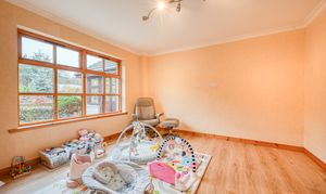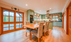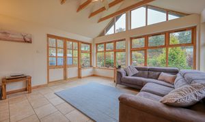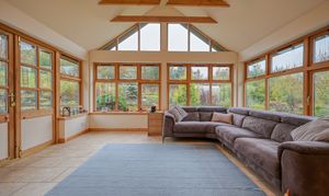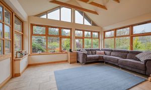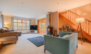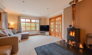 The main lounge is expansive and inviting, centred around a contemporary wood-burning stove with an exposed flue and slate hearth. Double-aspect windows and glazed doors fill the room with natural light, creating an airy and welcoming atmosphere. Adjoining the lounge, a stunning sunroom with a tall gable window and soft neutral décor provides panoramic views over the gardens and grounds.