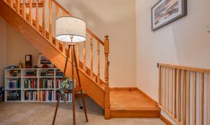 A graceful timber staircase leads to a spacious landing and three further bedrooms.
