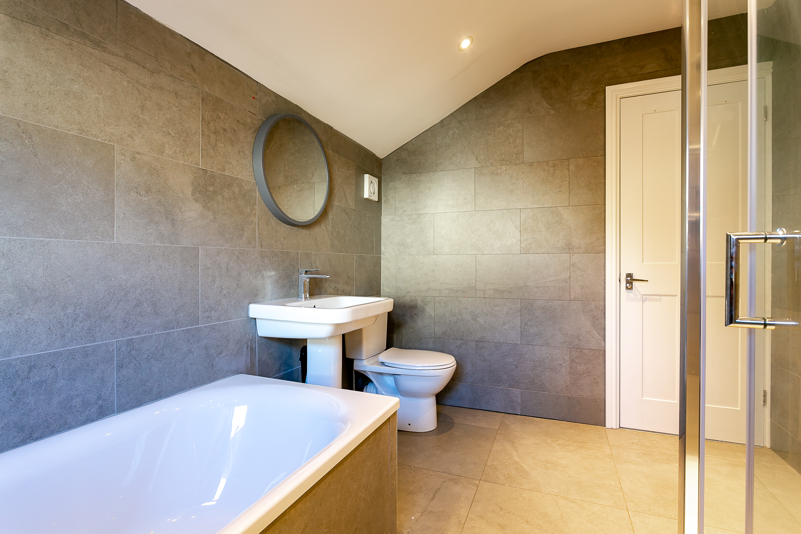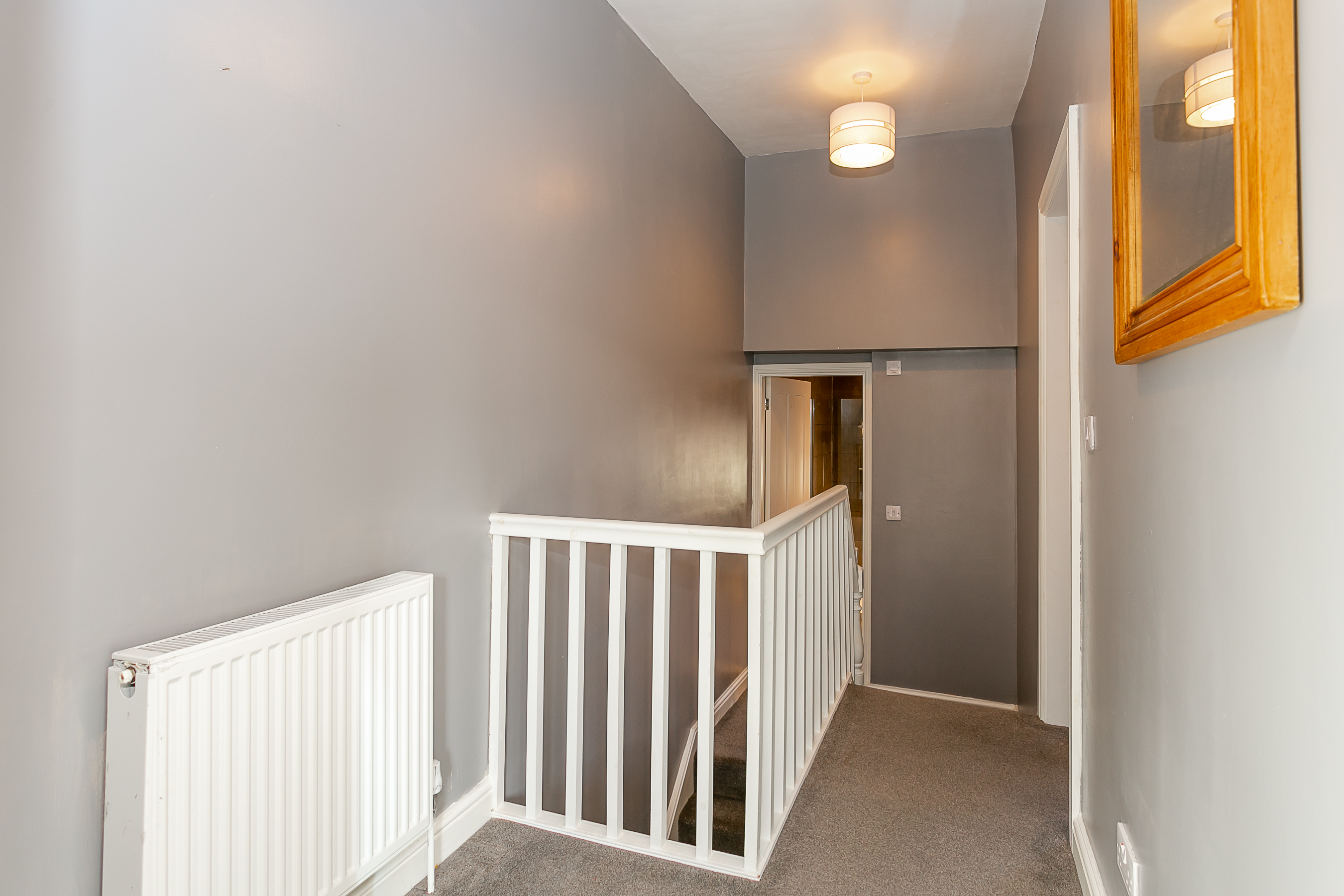The first floor features a split-level landing which provides access to a stylish, fully tiled house bathroom complete with a separate walk-in shower enclosure, along with two well-proportioned double bedrooms.
