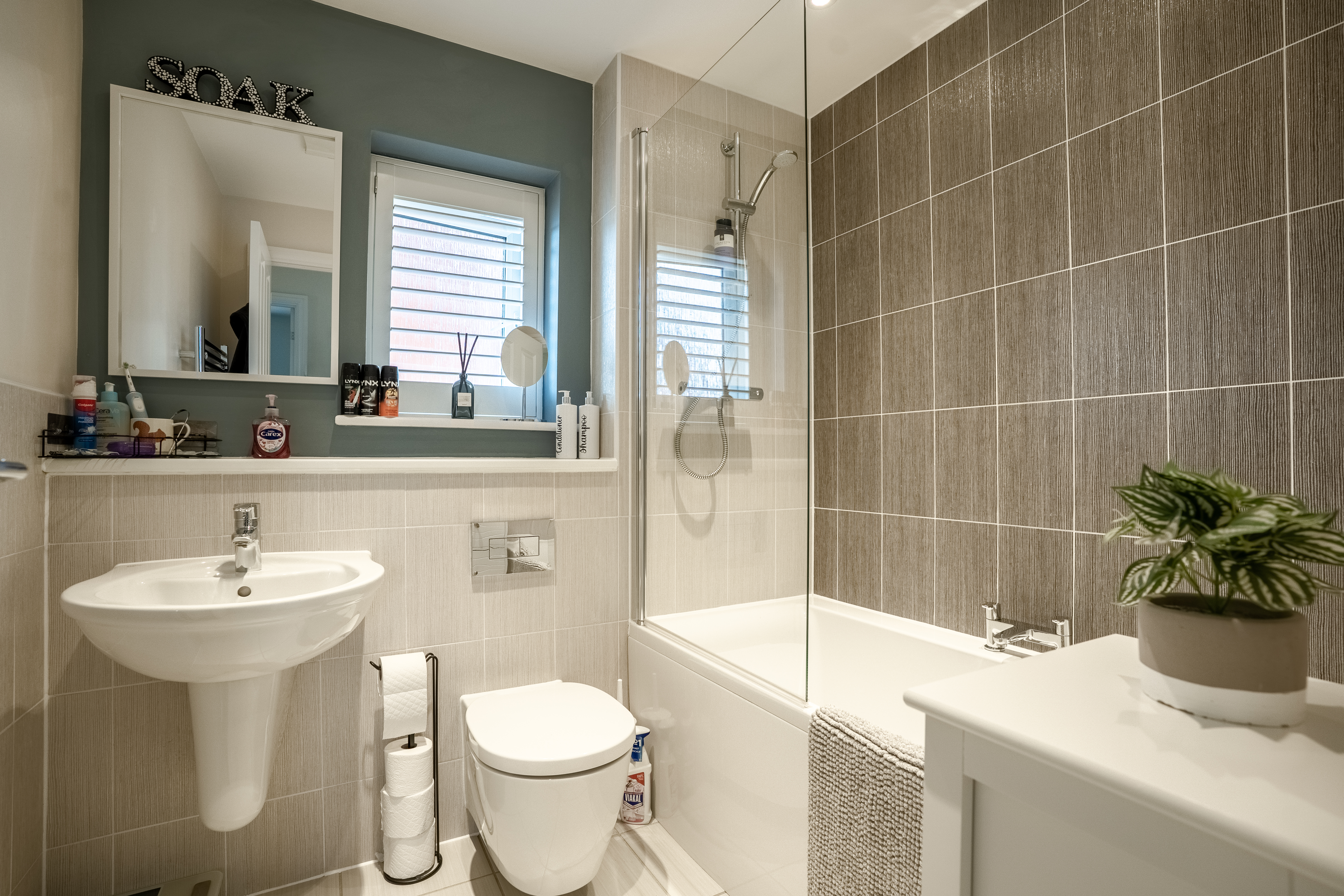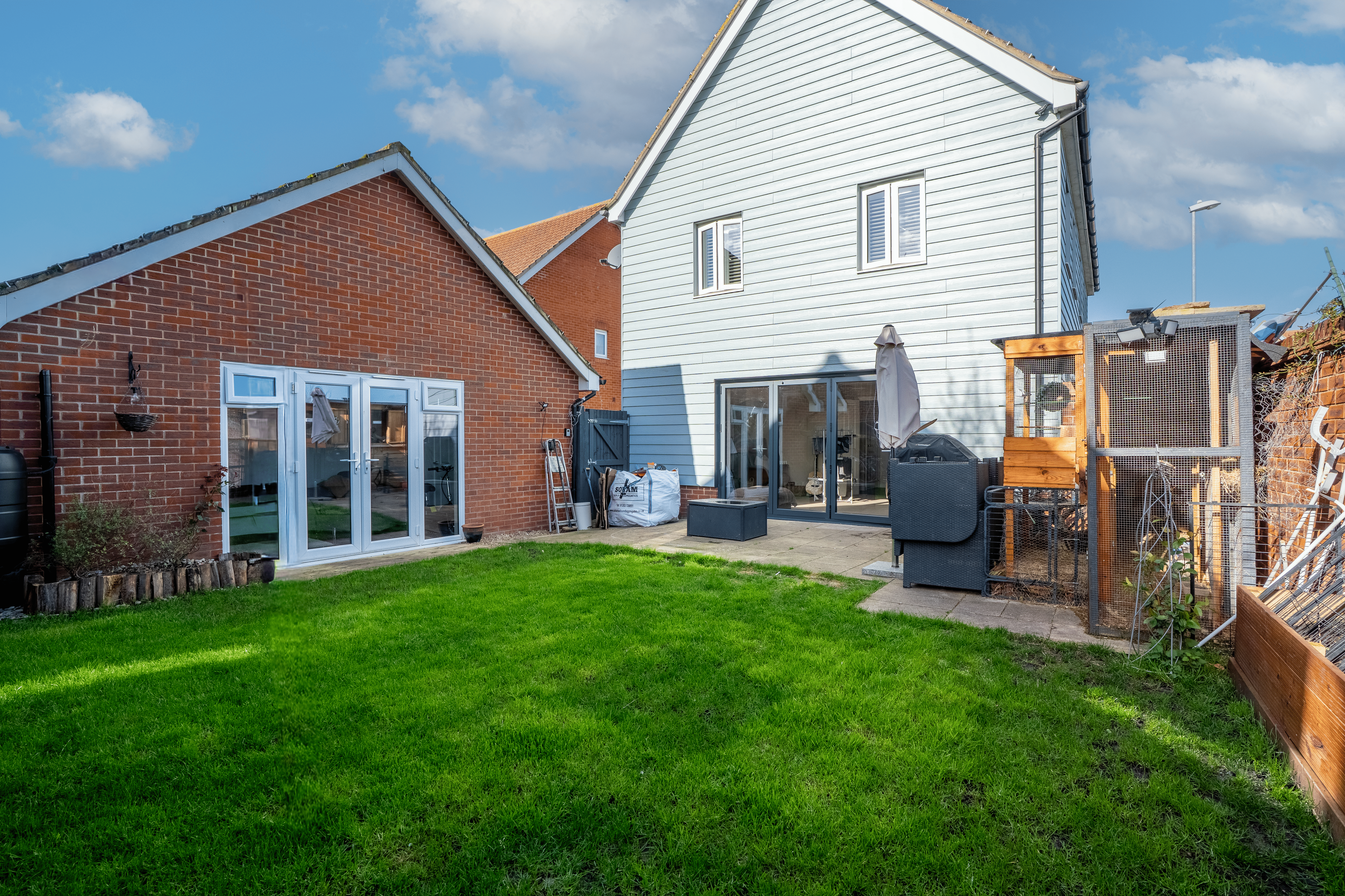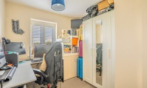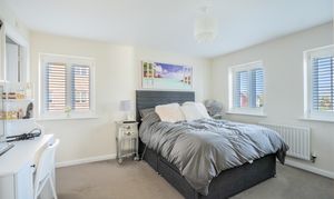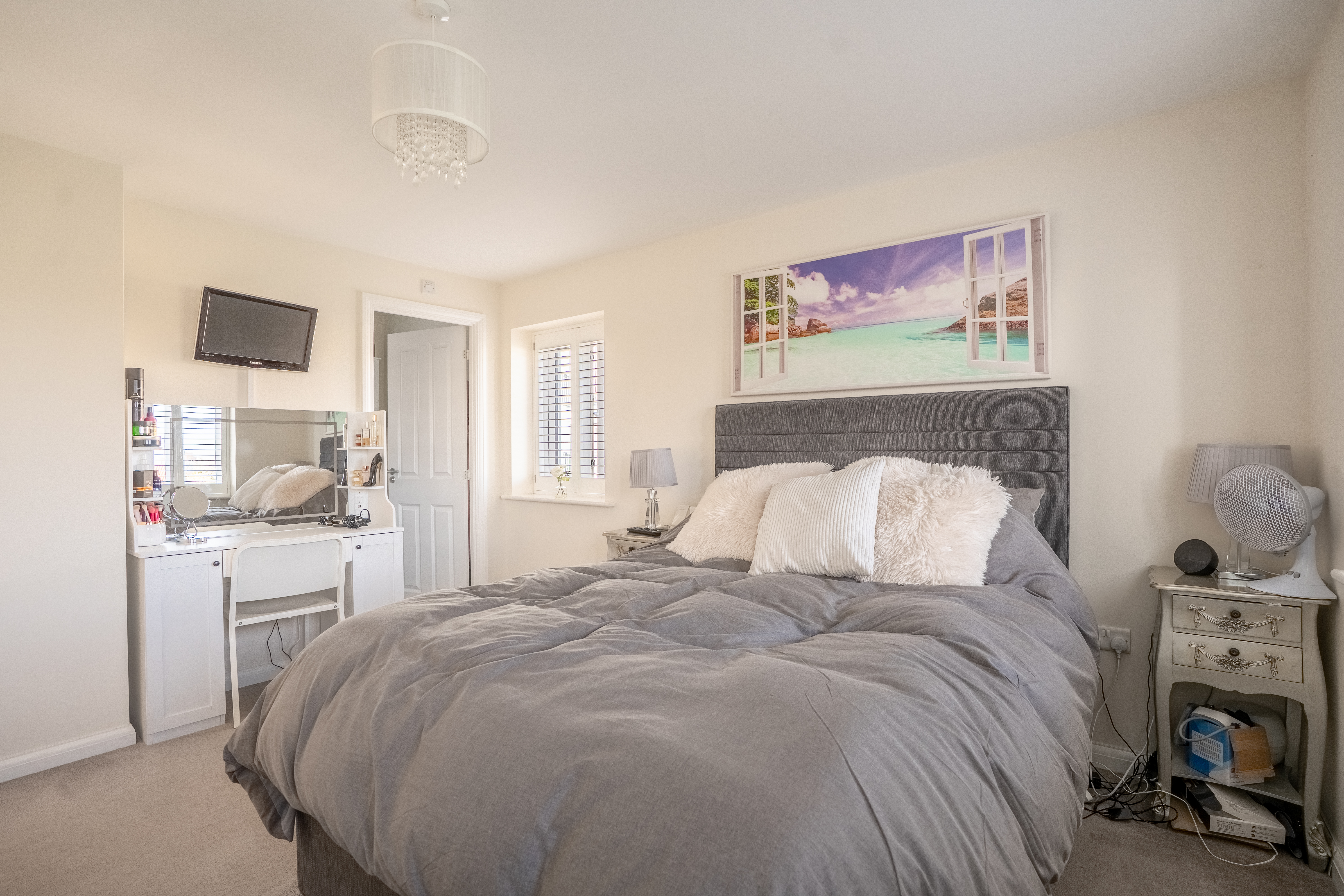 Upstairs, the landing provides access to four bedrooms and the family bathroom. The generous principal bedroom benefits from built-in wardrobes and a modern ensuite shower room. Two further double bedrooms include fitted wardrobes, while the fourth bedroom offers flexibility as a guest room, nursery or home office. The contemporary family bathroom is fitted with a bath and shower over.
