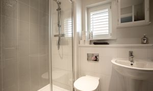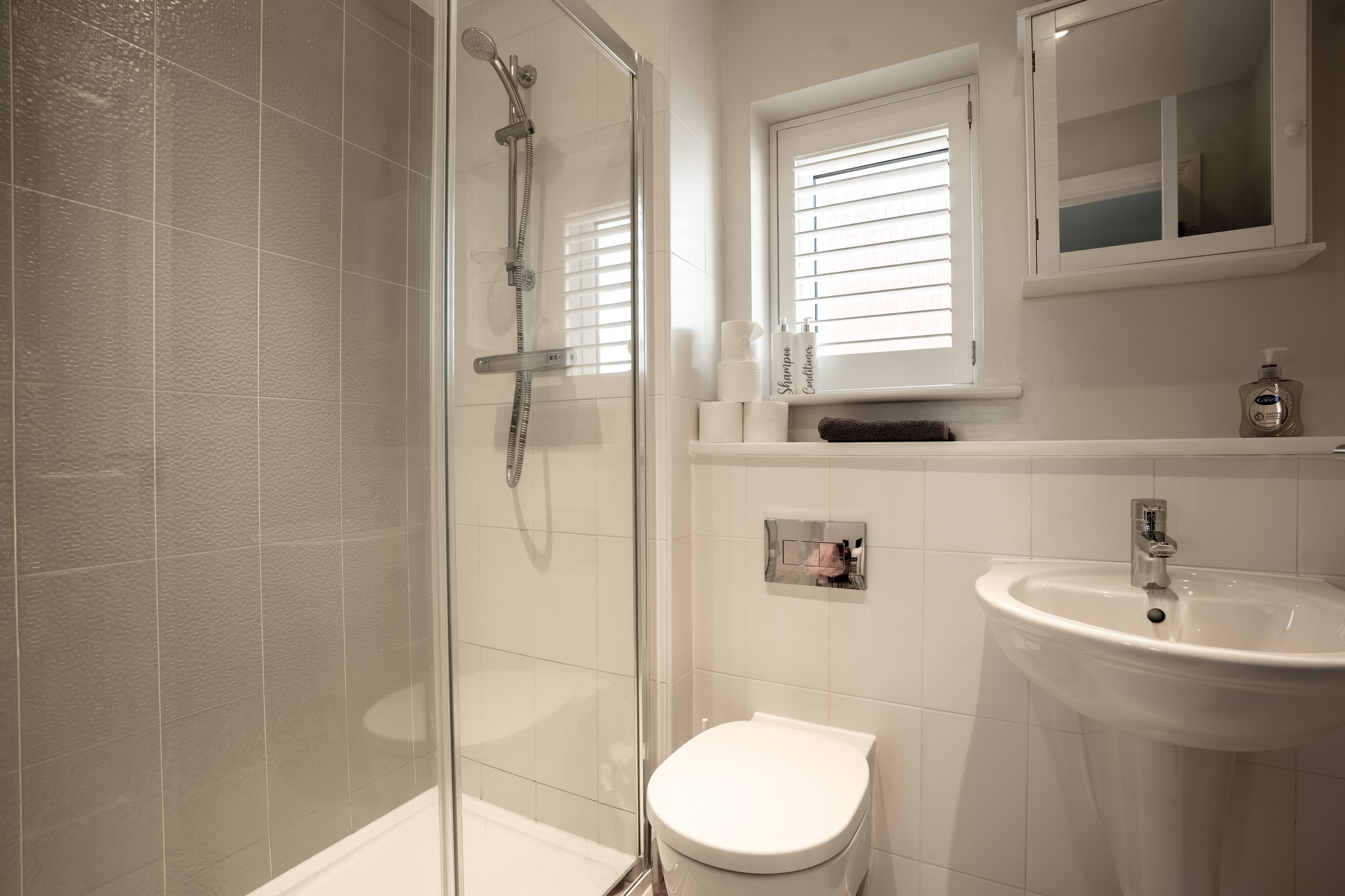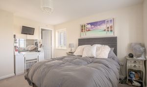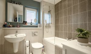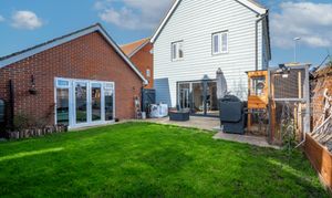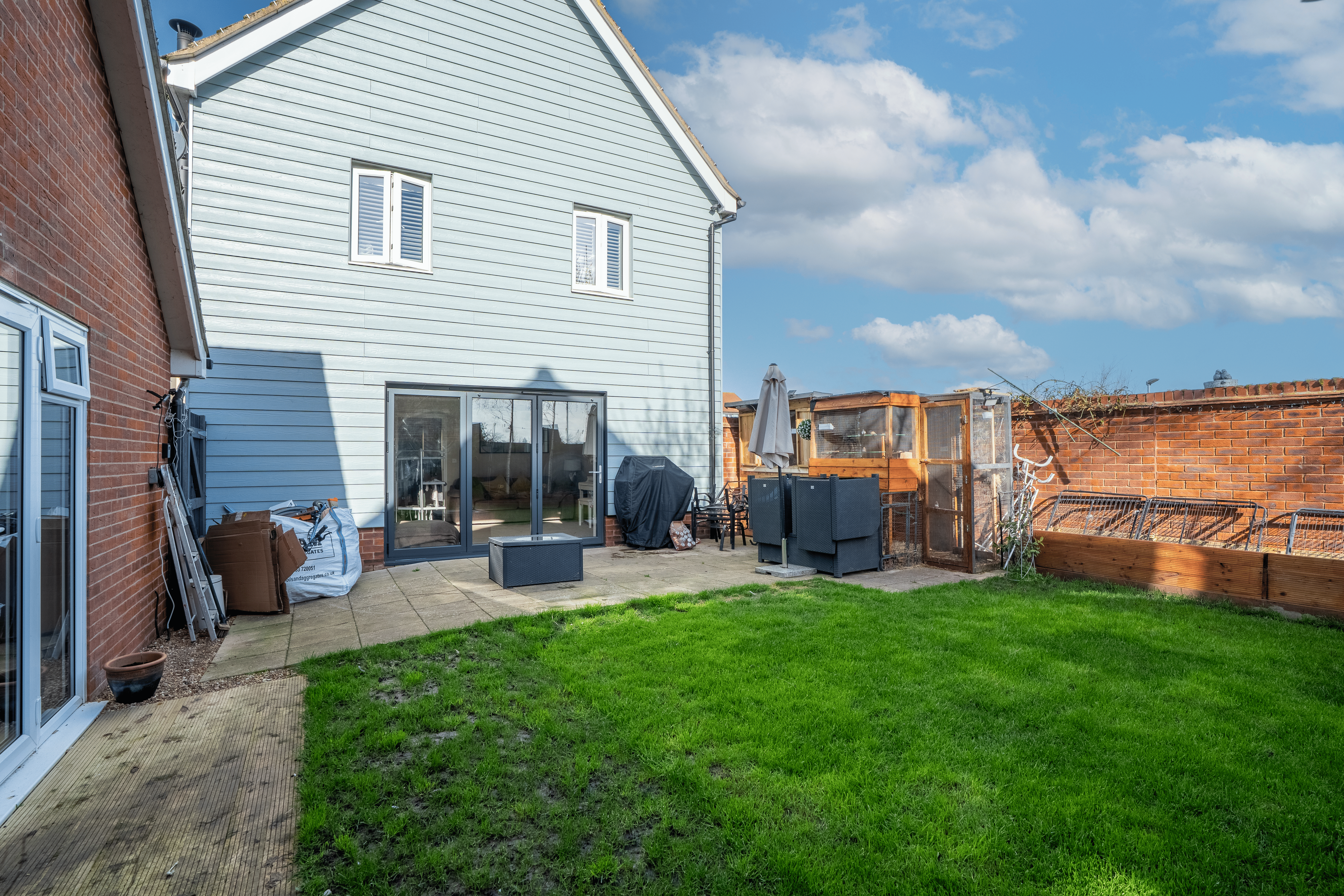 Upstairs, the landing provides access to four bedrooms and the family bathroom. The generous principal bedroom benefits from built-in wardrobes and a modern ensuite shower room. Two further double bedrooms include fitted wardrobes, while the fourth bedroom offers flexibility as a guest room, nursery or home office. The contemporary family bathroom is fitted with a bath and shower over.