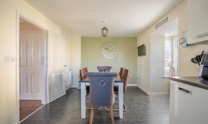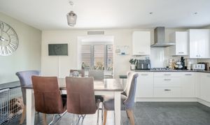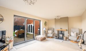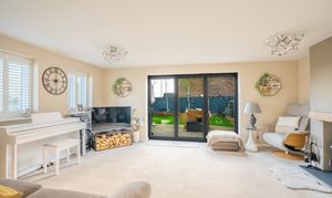 The welcoming entrance hall leads to a bright and spacious living room featuring a recently installed multi-fuel burner and bi-fold doors opening onto the rear garden, creating an ideal space for relaxing or entertaining. The well-appointed kitchen/dining room is fitted with a range of wall and base units, integrated appliances including a double oven, dishwasher and fridge freezer, and enjoys plenty of natural light from multiple windows.