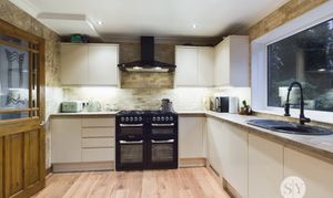 Range of fitted wall and base units and contrasting work surfaces, laminate flooring with underfloor heating, space for five ring gas cooker, extractor fan, tiled splash backs, integral washing machine, tumble dryer and dishwasher, space for fridge freezer, sink and drainer, space for dining table, uPVC double glazed window.