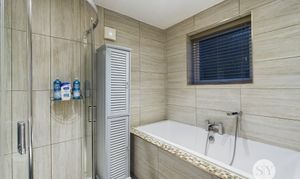Four piece in white, rubber tiled flooring with under floor heating, panel radiator, tiled floor to ceiling, two uPVC double glazed windows, ceiling spotlights.