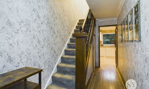 Laminate flooring with underfloor heating, stairs to first floor, uPVC double glazed window, under stairs storage.