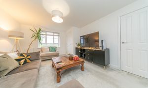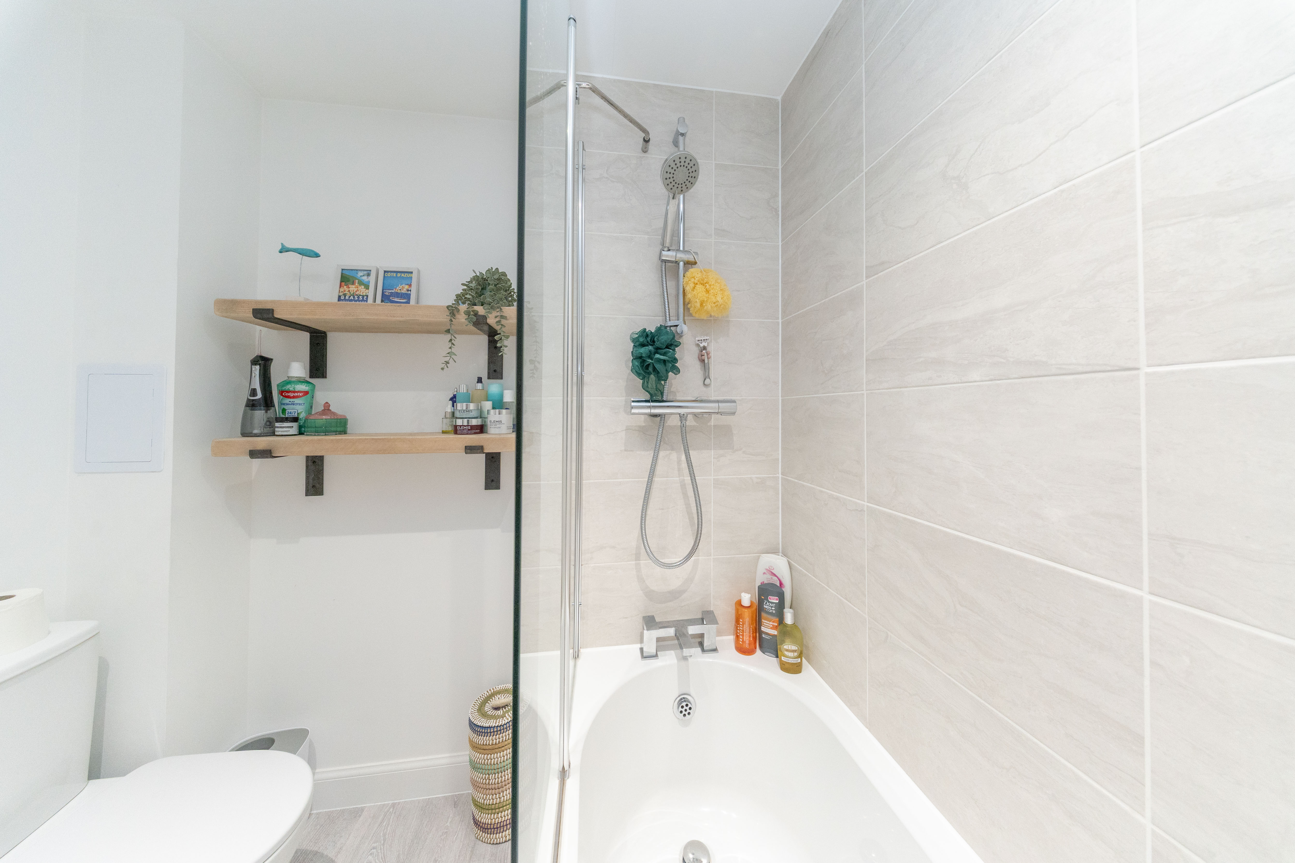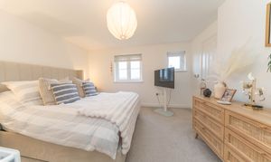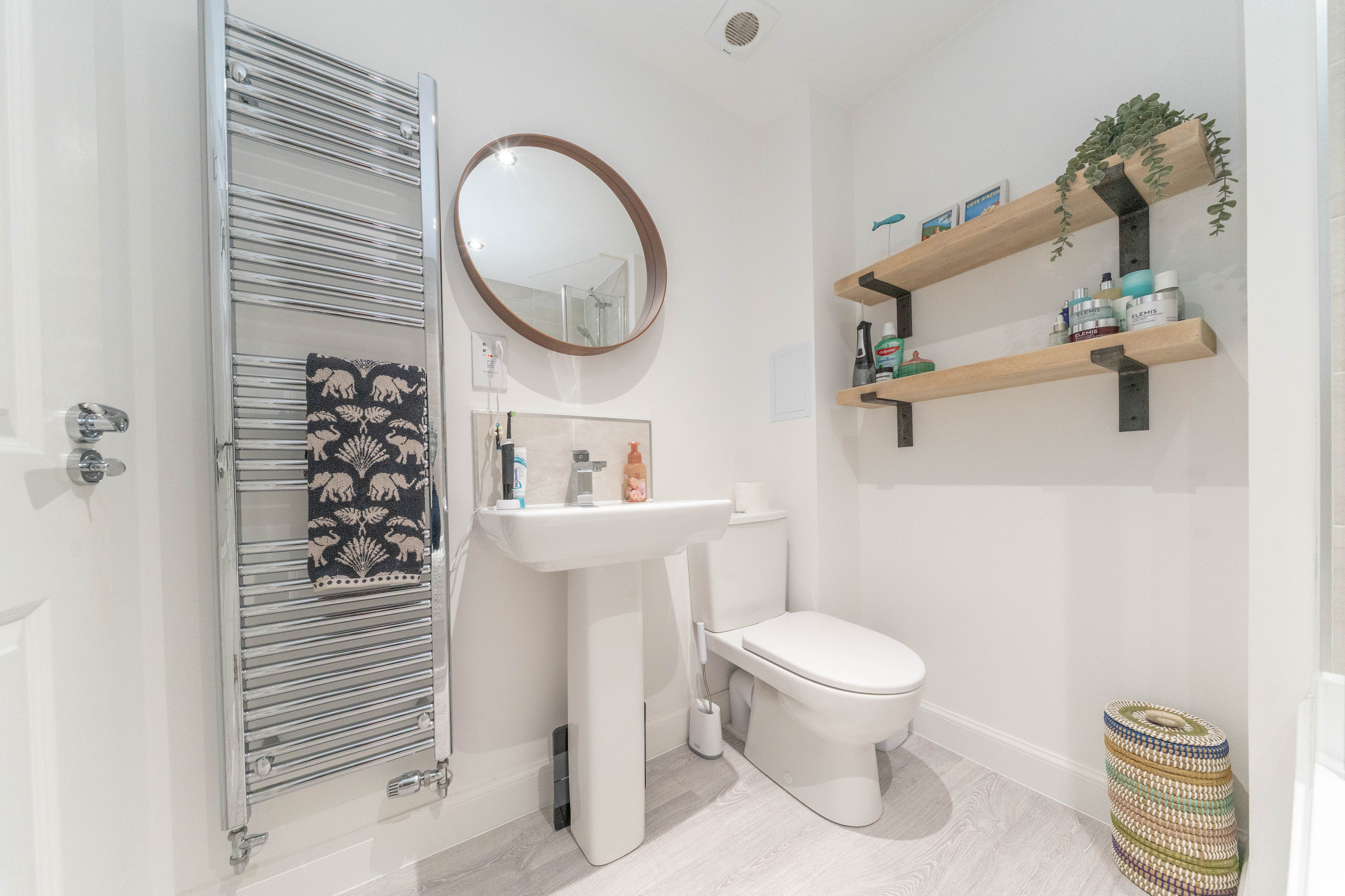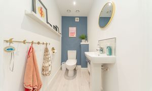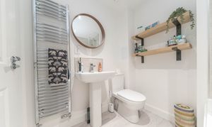 This stylish family bathroom blends practicality with modern elegance. Durable laminate flooring pairs beautifully with crisp white walls and light grey tiling, creating a fresh, easy to maintain finish. Downlights illuminate the room, adding to the bright and welcoming atmosphere. The contemporary suite features a mains powered shower over the bath, a close coupled toilet, and a sleek pedestal sink, delivering a clean, modern design. Completing the space are a chrome towel radiator, a shaver socket, and an extractor fan.