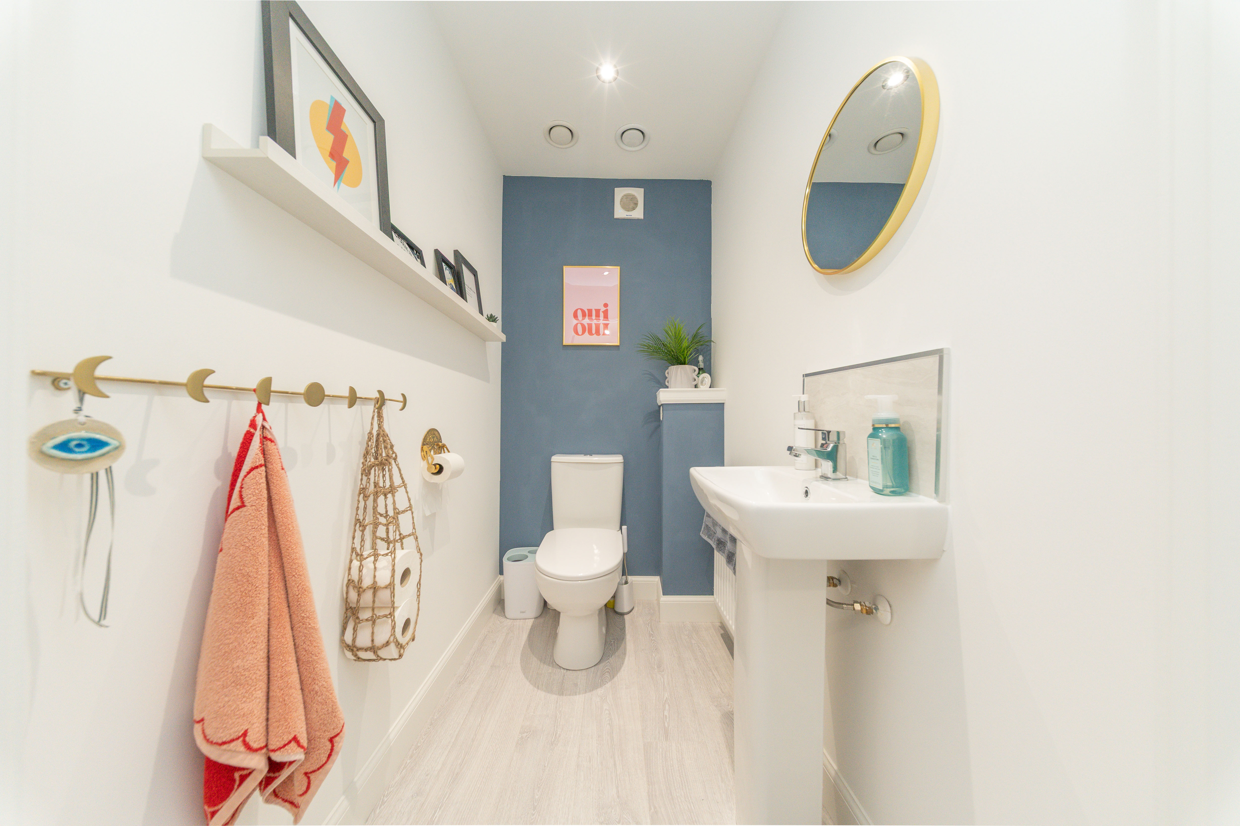 An essential room for modern day living, which has been decorated with white and blue painted walls, and laminate flooring. The suite comprises of a close coupled toilet and a pedestal sink. There are downlights, a radiator and an extractor fan to finish off the room.